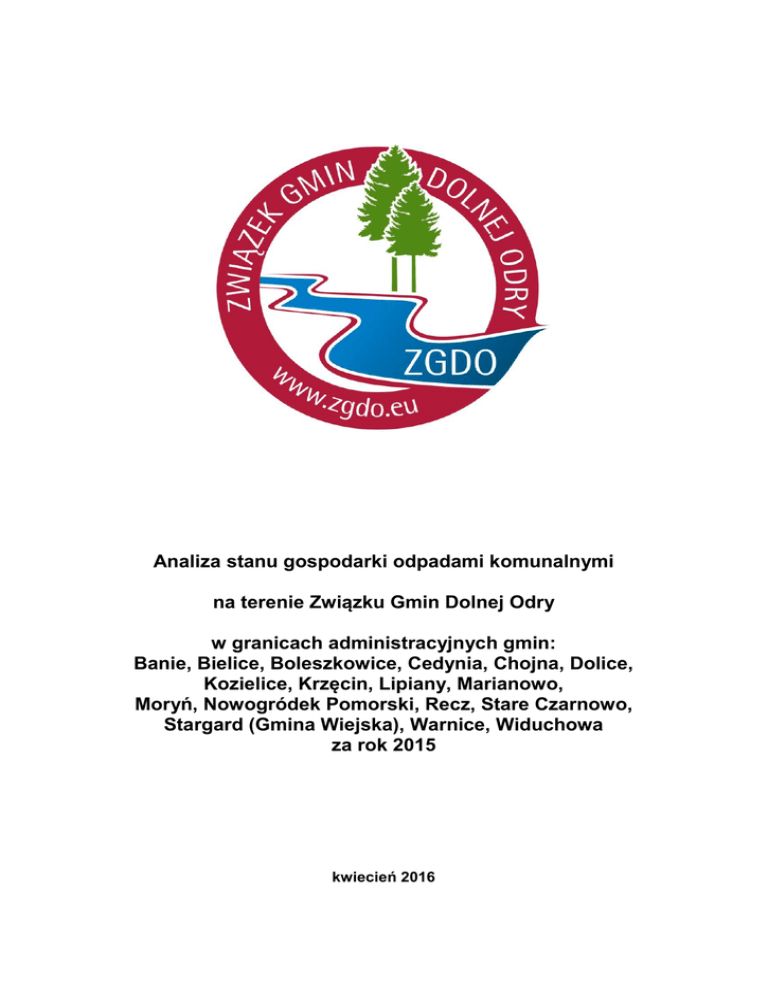 Analiza stanu gospodarki odpadami komunalnymi na terenie Związku Gmin Dolnej Odry w granicach administracyjnych gmin: Banie, Bielice, Boleszkowice, Cedynia, Chojna, Dolice, Kozielice, Krzęcin, Lipiany, Marianowo, Moryń, Nowogródek Pomorski, Recz, Stare Czarnowo, Stargard (Gmina Wiejska), Warnice, Widuchowa za rok 2015 kwiecień 2016 Spis treści 1. Cel przygotowania Analizy ......................................................................................3 2. Podstawa prawna sporządzenia Analizy .................................................................3 3. Ogólna charakterystyka systemu gospodarowania odpadami komunalnymi na terenie gminy Związku Gmin Dolnej Odry ………….....................................................3 4. Możliwości przetwarzania zmieszanych odpadów komunalnych, odpadów zielonych oraz pozostałości z sortowania odpadów komunalnych przeznaczonych do składowania .................................................................................................................6 5. Analiza potrzeb inwestycyjnych oraz przedsięwzięć związanych z gospodarowaniem odpadami komunalnymi .............................................................8 6. Analiza kosztów poniesionych w związku z odbieraniem, odzyskiem, recyklingiem i unieszkodliwianiem odpadów komunalnych (wg stanu na dzień 31.12. 2015 r.)……9 7. Analiza liczby mieszkańców .......................................................…………….........10 8. Analiza liczby właścicieli nieruchomości, którzy nie zawarli umowy, o której mowa w art. 6 ust. 1 u.c.p.g., w imieniu których gmina powinna podjąć działania, o których mowa w art. 6 ust. 6-12 u.c.p.g. ................................................................................11 9. Ilości odpadów komunalnych wytworzonych na terenie Związku Gmin Dolnej Odry oraz ilości zmieszanych odpadów komunalnych, odpadów zielonych oraz pozostałości z sortowania odpadów komunalnych przeznaczonych do składowania odbieranych z terenu gminy ......................................................................................12 Analiza stanu gospodarki odpadami komunalnymi na terenie gmin członkowskich Związku Gmin Dolnej Odry w 2015 roku 2 1. Cel przygotowania analizy Niniejszy dokument stanowi roczną analizę stanu gospodarki odpadami komunalnymi na terenie gmin członkowskich Związku Gmin Dolnej Odry w 2015 roku. Analiza ta została przygotowana w celu weryfikacji możliwości technicznych i organizacyjnych gminy w zakresie gospodarowania odpadami komunalnymi. 2. Podstawa prawna sporządzenia Analizy Analiza została przygotowana w oparciu o art. 3 ust. 2 pkt. 10 ustawy z dnia 13 września 1996 r. o utrzymaniu czystości i porządku w gminach (tekst jedn. Dz. U. z 2016 r. poz. 250 z późn. zm.) – powoływanej dalej jako u.c.p.g., gdzie określony został wymagany zakres przedmiotowej analizy. Coroczna analiza ma dokonać weryfikacji możliwości technicznych i organizacyjnych Związku Gmin Dolnej Odry w zakresie możliwości przetwarzania zmieszanych odpadów komunalnych, odpadów zielonych oraz pozostałości z sortowania, jak również potrzeb inwestycyjnych związanych z gospodarowaniem odpadami komunalnymi oraz kosztów systemu gospodarki odpadami komunalnymi. Dostarcza również informacji o liczbie mieszkańców, liczbie właścicieli nieruchomości, którzy nie wykonują obowiązków określonych w ustawie, a także ilości odpadów komunalnych wytwarzanych na terenie gminy, a w szczególności zmieszanych odpadów komunalnych, odpadów zielonych oraz pozostałości z sortowania przeznaczonych do składowania. Analiza ma dostarczyć niezbędnych informacji dla stworzenia efektywnego systemu gospodarki odpadami komunalnymi na terenie Związku Gmin Dolnej Odry. 3. Ogólna charakterystyka systemu gospodarowania odpadami komunalnymi na terenie gminy Związku Gmin Dolnej Odry Związek Gmin Dolnej Odry prowadzi odbiór odpadów komunalnych z nieruchomości zamieszkałych na terenie gmin: Banie, Bielice, Boleszkowice, Cedynia, Chojna, Dolice, Kozielice, Krzęcin, Lipiany, Marianowi, Moryń, Nowogródek Pomorski, Recz, Stare Czarnowo, Stargard (Gmina wiejska), Warnice, Widuchowa. Analiza stanu gospodarki odpadami komunalnymi na terenie gmin członkowskich Związku Gmin Dolnej Odry w 2015 roku 3 Opłata za gospodarowanie odpadami komunalnymi naliczana jest w sposób zryczałtowany i pokrywa w części koszty funkcjonowania systemu gospodarki odpadami komunalnymi, które obejmują koszty odbierania, transportu i unieszkodliwiania odpadów oraz obsługi administracyjnej systemu. Wysokość opłat za gospodarowanie odpadami komunalnymi na nieruchomościach zamieszkałych z terenu Związku Gmin Dolnej Odry w roku 2015 przedstawia Tabela nr 1. Tabela 1. Wysokość opłat za gospodarowanie odpadami komunalnymi na nieruchomościach zamieszkałych z terenu Związku Gmin Dolnej Odry Rok 2015 miesiąc styczeń - luty marzec kwiecień grudzień Opłata miesięczna od osoby Opłata miesięczna od prowadzącej zbiórkę gospodarstwa powyżej 5 osób odpadów prowadzącego zbiórkę w sposób odpadów w sposób selektywny zmieszany selektywny zmieszany 9,00 zł 15,00 zł 45,00 zł 75,00 zł 11,00 zł 17,00 zł 55,00 zł 85,00 zł 11,00 zł 17,00 zł ---------------- ---------------- W powołaniu na Uchwałę Nr 28/2012 Zgromadzenia Ogólnego Związku Gmin Dolnej Odry z dnia 19 grudnia 2012 r. od 1 stycznia do końca lutego 2015 roku stawka opłaty za odbiór i zagospodarowanie odpadów zebranych selektywnie wynosiła 9,00 zł od osoby, natomiast w przypadku oddawania odpadów zmieszanych - 15,00 zł od osoby. Opłata naliczana była od liczby osób zamieszkujących nieruchomość oraz od zadeklarowanego sposobu oddawania odpadów. Od marca 2015 roku zgodnie z Uchwałą nr 18/2014 Zgromadzenia Ogólnego Związku Gmin Dolnej Odry z dnia 29 grudnia 2014 roku stawka opłaty za odbiór i za gospodarowanie odpadów zebranych 