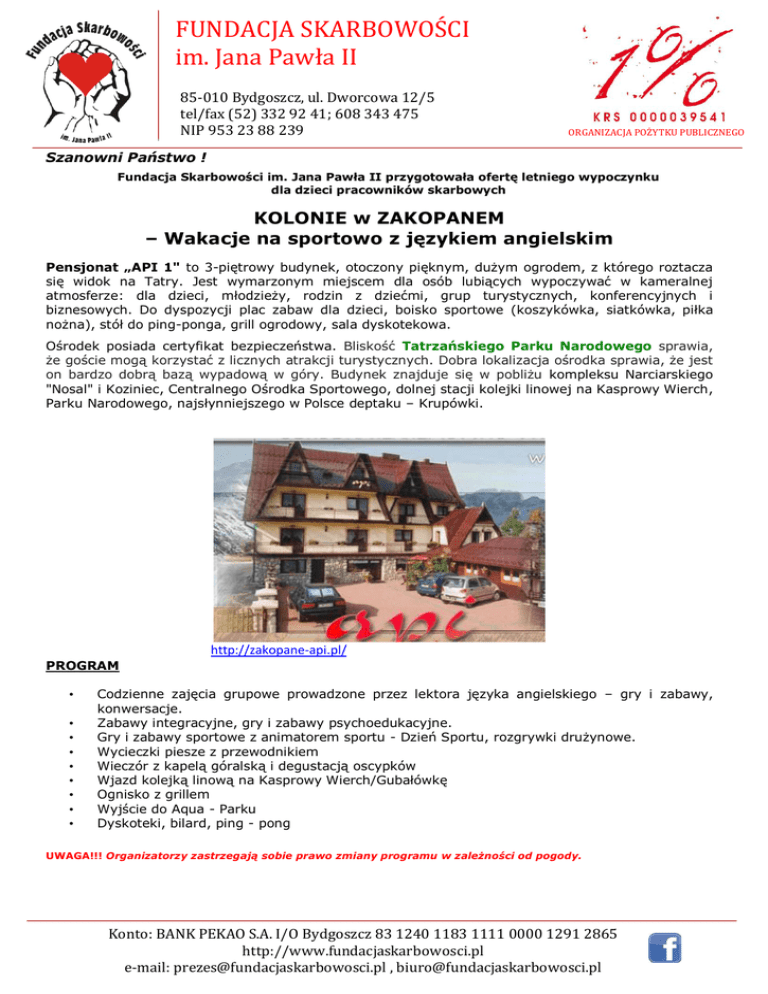 FUNDACJA SKARBOWOŚCI im. Jana Pawła II 85-010 Bydgoszcz, ul. Dworcowa 12/5 tel/fax (52) 332 92 41; 608 343 475 NIP 953 23 88 239 ORGANIZACJA POŻYTKU PUBLICZNEGO Szanowni Państwo ! Fundacja Skarbowości im. Jana Pawła II przygotowała ofertę letniego wypoczynku dla dzieci pracowników skarbowych KOLONIE w ZAKOPANEM – Wakacje na sportowo z językiem angielskim Pensjonat „API 1" to 3-piętrowy budynek, otoczony pięknym, dużym ogrodem, z którego roztacza się widok na Tatry. Jest wymarzonym miejscem dla osób lubiących wypoczywać w kameralnej atmosferze: dla dzieci, młodzieży, rodzin z dziećmi, grup turystycznych, konferencyjnych i biznesowych. Do dyspozycji plac zabaw dla dzieci, boisko sportowe (koszykówka, siatkówka, piłka nożna), stół do ping-ponga, grill ogrodowy, sala dyskotekowa. Ośrodek posiada certyfikat bezpieczeństwa. Bliskość Tatrzańskiego Parku Narodowego sprawia, że goście mogą korzystać z licznych atrakcji turystycznych. Dobra lokalizacja ośrodka sprawia, że jest on bardzo dobrą bazą wypadową w góry. Budynek znajduje się w pobliżu kompleksu Narciarskiego "Nosal" i Koziniec, Centralnego Ośrodka Sportowego, dolnej stacji kolejki linowej na Kasprowy Wierch, Parku Narodowego, najsłynniejszego w Polsce deptaku – Krupówki. http://zakopane-api.pl/ PROGRAM • • • • • • • • • Codzienne zajęcia grupowe prowadzone przez lektora języka angielskiego – gry i zabawy, konwersacje. Zabawy integracyjne, gry i zabawy psychoedukacyjne. Gry i zabawy sportowe z animatorem sportu - Dzień Sportu, rozgrywki drużynowe. Wycieczki piesze z przewodnikiem Wieczór z kapelą góralską i degustacją oscypków Wjazd kolejką linową na Kasprowy Wierch/Gubałówkę Ognisko z grillem Wyjście do Aqua - Parku Dyskoteki, bilard, ping - pong UWAGA!!! Organizatorzy zastrzegają sobie prawo zmiany programu w zależności od pogody. Konto: BANK PEKAO S.A. I/O Bydgoszcz 83 1240 1183 1111 0000 1291 2865 http://www.fundacjaskarbowosci.pl e-mail: [email protected] , [email protected] FUNDACJA SKARBOWOŚCI im. Jana Pawła II 85-010 Bydgoszcz, ul. Dworcowa 12/5 tel/fax (52) 332 92 41; 608 343 475 NIP 953 23 88 239 ORGANIZACJA POŻYTKU PUBLICZNEGO CENA OBEJMUJE 1. Całodzienne wyżywienie (cztery posiłki). 2. Zakwaterowanie w pokojach z łazienkami. 3. Opiekę wysoko wykwalifikowanej kadry pedagogicznej z uprawnieniami do prowadzenia zajęć z elementami socjoterapii i psychoedukacji. 4. Lektora języka angielskiego. 5. Opiekę przewodnika tatrzańskiego. 6. Opiekę medyczną. 7. Atrakcyjny program. 8. Ubezpieczenie na czas pobytu. TERMIN TURNUSU 28.06. – 06.07.2014r. CENA TURNUSU 8 - DNIOWEGO 990,00 zł dla dzieci pracowników skarbowości 960,00 zł dla dzieci darczyńców (1 darczyńca – 1 obniżka) 1.090,00 zł dla dzieci spoza skarbowości Oferta skierowana jest dla dzieci w wieku od 9 do 16 lat Uczestnik zostaje wpisany na listę po zgłoszeniu i dokonaniu przedpłaty w kwocie 200 zł do 1 marca br. Ilość miejsc ograniczona, o zakwalifikowaniu na turnus decyduje kolejność zgłoszeń i wpłata zaliczki! Wypełnioną kartę kolonijną - koniecznie z numerem PESEL dziecka, (karta do pobrania na naszej stronie internetowej www.fundacjaskarbowosci.pl), należy przesłać na adres Fundacji najpóźniej do końca maja br. Dojazd we własnym zakresie. Istnieje możliwość zorganizowania wspólnego dojazdu pociągiem z Bydgoszczy pod opieką wychowawców, po wcześniejszym zgłoszeniu i dokonaniu dodatkowej wpłaty w wysokości 130 zł – w obie strony do dnia 30 kwietnia 2014 roku. Pełna wpłata za kolonie najpóźniej do końca maja 2014. INFORMACJI UDZIELA I ZGŁOSZENIA PRZYJMUJE FUNDACJA SKARBOWOŚCI im. Jana Pawła II 85-010 Bydgoszcz, ul. Dworcowa 12/5 tel/fax (52) 332 92 41, Nr konta: BANK PEKAO S.A. I/O Bydgoszcz 83 1240 1183 1111 0000 1291 2865 e-mail: [email protected] Konto: BANK PEKAO S.A. I/O Bydgoszcz 83 1240 1183 1111 0000 1291 2865 http://www.fundacjaskarbowosci.pl e-mail: [email protected] , [email protected] FUNDACJA SKARBOWOŚCI im. Jana Pawła II 85-010 Bydgoszcz, ul. Dworcowa 12/5 tel/fax (52) 332 92 41; 608 343 475 NIP 953 23 88 239 ORGANIZACJA POŻYTKU PUBLICZNEGO ZAPRASZAMY GWARANTUJEMY WSPANIAŁY WYPOCZYNEK I NIEZAPOMNIANE WRAŻENIA !!! Konto: BANK PEKAO S.A. I/O Bydgoszcz 83 1240 1183 1111 0000 1291 2865 http://www.fundacjaskarbowosci.pl e-mail: [email protected] , [email protected]