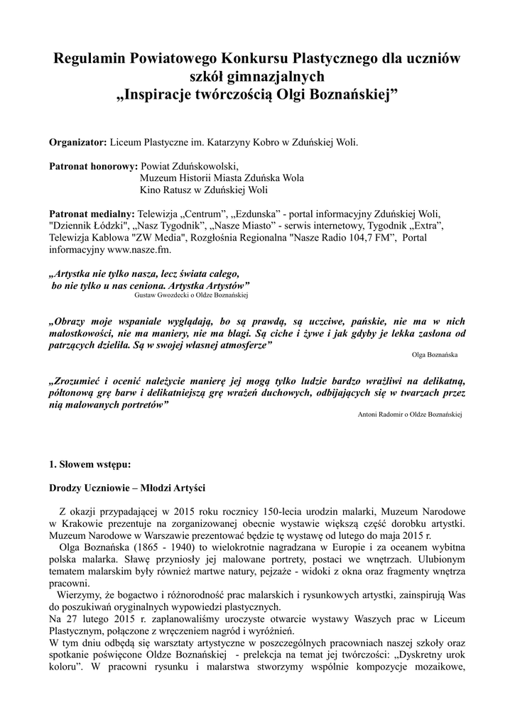 Regulamin Powiatowego Konkursu Plastycznego dla uczniów szkół gimnazjalnych „Inspiracje twórczością Olgi Boznańskiej” Organizator: Liceum Plastyczne im. Katarzyny Kobro w Zduńskiej Woli. Patronat honorowy: Powiat Zduńskowolski, Muzeum Historii Miasta Zduńska Wola Kino Ratusz w Zduńskiej Woli Patronat medialny: Telewizja „Centrum”, „Ezdunska” - portal informacyjny Zduńskiej Woli, "Dziennik Łódzki", „Nasz Tygodnik”, „Nasze Miasto” - serwis internetowy, Tygodnik „Extra”, Telewizja Kablowa "ZW Media", Rozgłośnia Regionalna "Nasze Radio 104,7 FM”, Portal informacyjny www.nasze.fm. „Artystka nie tylko nasza, lecz świata całego, bo nie tylko u nas ceniona. Artystka Artystów” Gustaw Gwozdecki o Oldze Boznańskiej „Obrazy moje wspaniale wyglądają, bo są prawdą, są uczciwe, pańskie, nie ma w nich małostkowości, nie ma maniery, nie ma blagi. Są ciche i żywe i jak gdyby je lekka zasłona od patrzących dzieliła. Są w swojej własnej atmosferze” Olga Boznańska „Zrozumieć i ocenić należycie manierę jej mogą tylko ludzie bardzo wrażliwi na delikatną, półtonową grę barw i delikatniejszą grę wrażeń duchowych, odbijających się w twarzach przez nią malowanych portretów” Antoni Radomir o Oldze Boznańskiej 1. Słowem wstępu: Drodzy Uczniowie – Młodzi Artyści Z okazji przypadającej w 2015 roku rocznicy 150-lecia urodzin malarki, Muzeum Narodowe w Krakowie prezentuje na zorganizowanej obecnie wystawie większą część dorobku artystki. Muzeum Narodowe w Warszawie prezentować będzie tę wystawę od lutego do maja 2015 r. Olga Boznańska (1865 - 1940) to wielokrotnie nagradzana w Europie i za oceanem wybitna polska malarka. Sławę przyniosły jej malowane portrety, postaci we wnętrzach. Ulubionym tematem malarskim były również martwe natury, pejzaże - widoki z okna oraz fragmenty wnętrza pracowni. Wierzymy, że bogactwo i różnorodność prac malarskich i rysunkowych artystki, zainspirują Was do poszukiwań oryginalnych wypowiedzi plastycznych. Na 27 lutego 2015 r. zaplanowaliśmy uroczyste otwarcie wystawy Waszych prac w Liceum Plastycznym, połączone z wręczeniem nagród i wyróżnień. W tym dniu odbędą się warsztaty artystyczne w poszczególnych pracowniach naszej szkoły oraz spotkanie poświęcone Oldze Boznańskiej - prelekcja na temat jej twórczości: „Dyskretny urok koloru”. W pracowni rysunku i malarstwa stworzymy wspólnie kompozycje mozaikowe, nawiązujące do obrazów malarki. W maju 2015 r. zaplanowana jest ekspozycja prac wykonanych przez młodzież w nawiązaniu do jednego z tematów zawartych w regulaminie konkursu - tematu: „Portret”. Ekspozycja ma odbyć się w sali Muzeum Historii Miasta Zduńska Wola w ramach wystawy z cyklu „Zduńskowolan portret własny”. Zapraszamy do szkolnej biblioteki Liceum Plastycznego, w której można skorzystać na miejscu i zapoznać się z albumowymi wydaniami, publikacjami w prasie związanymi z twórczością Boznańskiej. Godziny pracy biblioteki oraz wykaz publikacji znajdziecie na stronie Liceum Plastycznego: www.lpzdwola.pl Zastanówcie się Drodzy Uczniowie, w jaki sposób możecie przedstawić np. postać we wnętrzu, portrety osób z grona rodziny, znajomych, przyjaciół. Starajcie się obserwować np. widoki za oknem, wnętrza pokoju, pejzaże. Szukajcie inspiracji do własnych prac z waszego otoczenia. Być może, rozwiązaniem na pracę konkursową będzie przetworzenie wybranej pracy Olgi Boznańskiej i wykonanie jej na swój sposób, w odpowiadającej Wam technice plastycznej, wymienionej poniżej w regulaminie. Zastanówcie się, za pomocą jakich środków plastycznych tematy konkursu można wyrazić. Twórzcie również w oparciu o własną wyobraźnię. Życzymy radości w tworzeniu. 2. Cele konkursu: - aktywizacja pracy uczniów i pedagogów, - poznanie życia i działalności Olgi Boznańskiej, - rozwijanie wśród uczniów talentów, - prezentacja prac uczniów szkół gimnazjalnych podczas wystawy pokonkursowej w Galerii na Rogu Liceum Plastycznego oraz prac konkursowych o tematyce: „Portret” w maju 2015 r. w sali Muzeum Historii Miasta Zduńska Wola w ramach wystawy z cyklu „Zduńskowolan portret własny”, - współpraca szkoły artystycznej ze szkołami gimnazjalnymi oraz placówkami kultury. 3. Uczestnicy: Do udziału zapraszamy uczniów klas I, II, III szkół gimnazjalnych z powiatu zduńskowolskiego. 4. Tematy: I. Temat - „Portret” II. Temat - „Fragment wnętrza - pokój, altana, itp.” III. Temat - „Pejzaż” 5. Prace: Uczestnik konkursu może nadesłać maksymalnie 4 prace wykonane na płaszczyźnie w technikach: - rysunkowych (np. rysunek tuszem, ołówkiem, węglem, pastelami, suchym pędzlem, itp.) - malarskich ( np. akryl, olejna, akwarela, kolaż, pastel, itp.) - graficznych ( np. drzeworyt, monotypia, gipsoryt, linoryt, itp.) 6. Format prac: Wymagany format prac: od A3 ( 297 x 420 mm) do maksymalnego formatu: B2 (500 x 707 mm). 7. Oznaczenie prac: Na odwrocie każdej z prac należy umieścić 8-znakowe godło - hasło składające się z liter bądź z cyfr oraz dołączyć do każdej z prac w zaklejonej kopercie (również oznaczonej godłem - hasłem) metryczkę informującą wraz z pieczątką szkoły. Prosimy o czytelne wypełnienie podanej niżej metryczki: Godło: Tytuł pracy: Imię i nazwisko ucznia: Technika/wymiary: Klasa/wiek ucznia: Imię i nazwisko nauczyciela, pod kierunkiem którego praca powstała: Dokładny adres szkoły, telefon, adres e- mail Pieczątka szkoły, podpis nauczyciela - opiekuna 8. Termin i miejsce nadsyłania\ składania prac plastycznych: Prace odpowiednio zabezpieczone należy nadsyłać/składać w nieprzekraczalnym terminie do dnia 17 lutego 2015 Prace nadesłane po tym terminie nie będą oceniane przez jury. Organizator nie ponosi odpowiedzialności za uszkodzenia prac powstałe w czasie transportu. Prace należy składać/ nadsyłać na adres: 