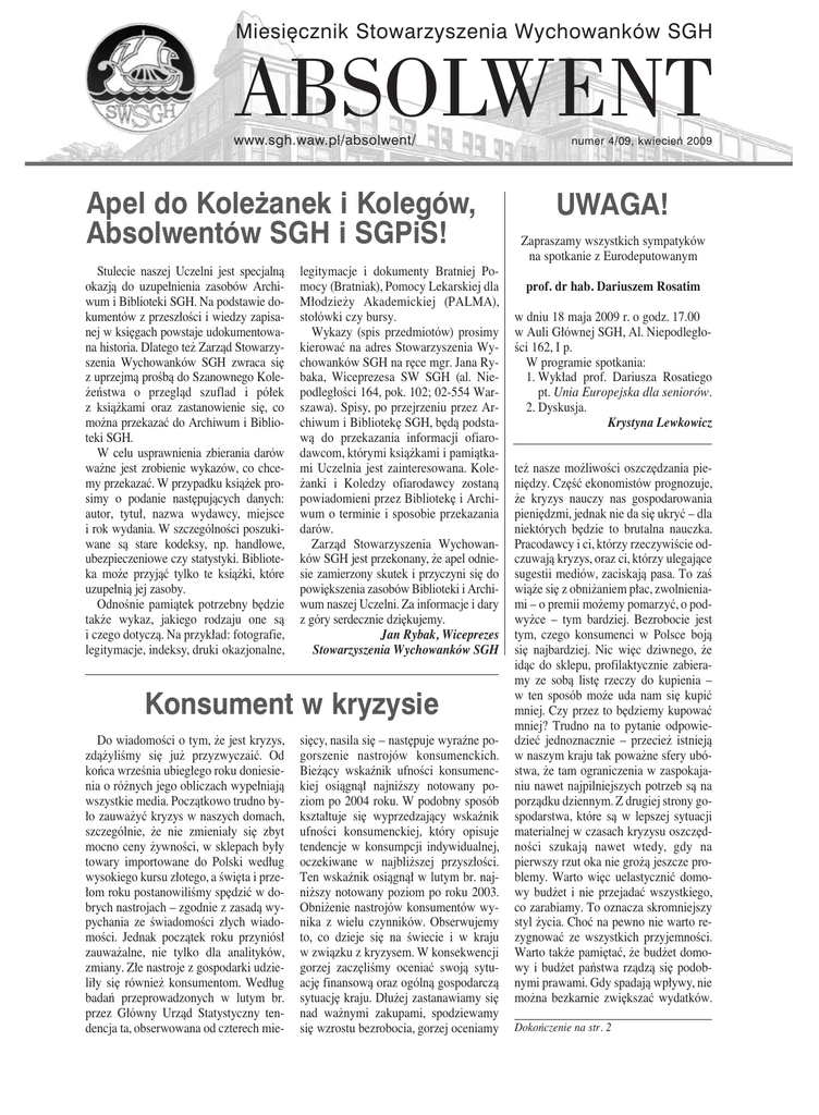 Miesi´cznik Stowarzyszenia Wychowanków SGH ABSOLWENT www.sgh.waw.pl/absolwent/ Apel do Kole˝anek i Kolegów, Absolwentów SGH i SGPiS! Stulecie naszej Uczelni jest specjalnà okazjà do uzupe∏nienia zasobów Archiwum i Biblioteki SGH. Na podstawie dokumentów z przesz∏oÊci i wiedzy zapisanej w ksi´gach powstaje udokumentowana historia. Dlatego te˝ Zarzàd Stowarzyszenia Wychowanków SGH zwraca si´ z uprzejmà proÊbà do Szanownego Kole˝eƒstwa o przeglàd szuflad i pó∏ek z ksià˝kami oraz zastanowienie si´, co mo˝na przekazaç do Archiwum i Biblioteki SGH. W celu usprawnienia zbierania darów wa˝ne jest zrobienie wykazów, co chcemy przekazaç. W przypadku ksià˝ek prosimy o podanie nast´pujàcych danych: autor, tytu∏, nazwa wydawcy, miejsce i rok wydania. W szczególnoÊci poszukiwane sà stare kodeksy, np. handlowe, ubezpieczeniowe czy statystyki. Biblioteka mo˝e przyjàç tylko te ksià˝ki, które uzupe∏nià jej zasoby. OdnoÊnie pamiàtek potrzebny b´dzie tak˝e wykaz, jakiego rodzaju one sà i czego dotyczà. Na przyk∏ad: fotografie, legitymacje, indeksy, druki okazjonalne, legitymacje i dokumenty Bratniej Pomocy (Bratniak), Pomocy Lekarskiej dla M∏odzie˝y Akademickiej (PALMA), sto∏ówki czy bursy. Wykazy (spis przedmiotów) prosimy kierowaç na adres Stowarzyszenia Wychowanków SGH na r´ce mgr. Jana Rybaka, Wiceprezesa SW SGH (al. Niepodleg∏oÊci 164, pok. 102; 02-554 Warszawa). Spisy, po przejrzeniu przez Archiwum i Bibliotek´ SGH, b´dà podstawà do przekazania informacji ofiarodawcom, którymi ksià˝kami i pamiàtkami Uczelnia jest zainteresowana. Kole˝anki i Koledzy ofiarodawcy zostanà powiadomieni przez Bibliotek´ i Archiwum o terminie i sposobie przekazania darów. Zarzàd Stowarzyszenia Wychowanków SGH jest przekonany, ˝e apel odniesie zamierzony skutek i przyczyni si´ do powi´kszenia zasobów Biblioteki i Archiwum naszej Uczelni. Za informacje i dary z góry serdecznie dzi´kujemy. Jan Rybak, Wiceprezes Stowarzyszenia Wychowanków SGH Konsument w kryzysie Do wiadomoÊci o tym, ˝e jest kryzys, zdà˝yliÊmy si´ ju˝ przyzwyczaiç. Od koƒca wrzeÊnia ubieg∏ego roku doniesienia o ró˝nych jego obliczach wype∏niajà wszystkie media. Poczàtkowo trudno by∏o zauwa˝yç kryzys w naszych domach, szczególnie, ˝e nie zmienia∏y si´ zbyt mocno ceny ˝ywnoÊci, w sklepach by∏y towary importowane do Polski wed∏ug wysokiego kursu z∏otego, a Êwi´ta i prze∏om roku postanowiliÊmy sp´dziç w dobrych nastrojach – zgodnie z zasadà wypychania ze ÊwiadomoÊci z∏ych wiadomoÊci. Jednak poczàtek roku przyniós∏ zauwa˝alne, nie tylko dla analityków, zmiany. Z∏e nastroje z gospodarki udzieli∏y si´ równie˝ konsumentom. Wed∏ug badaƒ przeprowadzonych w lutym br. przez G∏ówny Urzàd Statystyczny tendencja ta, obserwowana od czterech mie- si´cy, nasila si´ – nast´puje wyraêne pogorszenie nastrojów konsumenckich. Bie˝àcy wskaênik ufnoÊci konsumenckiej osiàgnà∏ najni˝szy notowany poziom po 2004 roku. W podobny sposób kszta∏tuje si´ wyprzedzajàcy wskaênik ufnoÊci konsumenckiej, który opisuje tendencje w konsumpcji indywidualnej, oczekiwane w najbli˝szej przysz∏oÊci. Ten wskaênik osiàgnà∏ w lutym br. najni˝szy notowany poziom po roku 2003. Obni˝enie nastrojów konsumentów wynika z wielu czynników. Obserwujemy to, co dzieje si´ na Êwiecie i w kraju w zwiàzku z kryzysem. W konsekwencji gorzej zacz´liÊmy oceniaç swojà sytuacj´ finansowà oraz ogólnà gospodarczà sytuacj´ kraju. D∏u˝ej zastanawiamy si´ nad wa˝nymi zakupami, spodziewamy si´ wzrostu bezrobocia, gorzej oceniamy numer 4/09, kwiecieƒ 2009 UWAGA! Zapraszamy wszystkich sympatyków na spotkanie z Eurodeputowanym prof. dr hab. Dariuszem Rosatim w dniu 18 maja 2009 r. o godz. 17.00 w Auli G∏ównej SGH, Al. Niepodleg∏oÊci 162, I p. W programie spotkania: 1. Wyk∏ad prof. Dariusza Rosatiego pt. Unia Europejska dla seniorów. 2. Dyskusja. Krystyna Lewkowicz te˝ nasze mo˝liwoÊci oszcz´dzania pieni´dzy. Cz´Êç ekonomistów prognozuje, ˝e kryzys nauczy nas gospodarowania pieni´dzmi, jednak nie da si´ ukryç – dla niektórych b´dzie to brutalna nauczka. Pracodawcy i ci, którzy rzeczywiÊcie odczuwajà kryzys, oraz ci, którzy ulegajàce sugestii mediów, zaciskajà pasa. To zaÊ wià˝e si´ z obni˝aniem p∏ac, zwolnieniami – o premii mo˝emy pomarzyç, o podwy˝ce – tym bardziej. Bezrobocie jest tym, czego konsumenci w Polsce bojà si´ najbardziej. Nic wi´c dziwnego, ˝e idàc do sklepu, profilaktycznie zabieramy ze sobà list´ rzeczy do kupienia – w ten sposób mo˝e uda nam si´ kupiç mniej. Czy przez to b´dziemy kupowaç mniej? Trudno na to pytanie odpowiedzieç jednoznacznie – przecie˝ istniejà w naszym kraju tak powa˝ne sfery ubóstwa, ˝e tam ograniczenia w zaspokajaniu nawet najpilniejszych potrzeb sà na porzàdku dziennym. Z drugiej strony gospodarstwa, które sà w lepszej sytuacji materialnej w czasach kryzysu oszcz´dnoÊci szukajà nawet wtedy, gdy na pierwszy rzut oka nie gro˝à jeszcze problemy. Warto wi´c uelastyczniç domowy bud˝et i nie przejadaç wszystkiego, co zarabiamy. To oznacza skromniejszy styl ˝ycia. Choç na pewno nie warto rezygnowaç ze wszystkich przyjemnoÊci. Warto tak˝e pami´taç, ˝e bud˝et domowy i bud˝et paƒstwa rzàdzà si´ podobnymi prawami. Gdy spadajà wp∏ywy, nie mo˝na bezkarnie zwi´kszaç wydatków. Dokoƒczenie na str. 2 Choç z drugiej strony warto pami´taç, ˝e cz´sto podlegamy opisanemu w teorii ekonomii „efektowi rygla” – mimo spadajàcych dochodów realnych staramy si´ za wszelkà cen´ nie obni˝aç dotychczasowego poziomu ˝ycia. A wi´c niech´tnie zmieniamy ulubione marki na ich taƒsze odpowiedniki, chodzimy do sklepów w galeriach handlowych (gdzie ceny sà zwykle najwy˝sze). Trudno te˝ rozstaç si´ z marzeniami o dalekim wyjeêdzie. To wszystko powoduje, ˝e nasze oszcz´dnoÊci sà powa˝ni