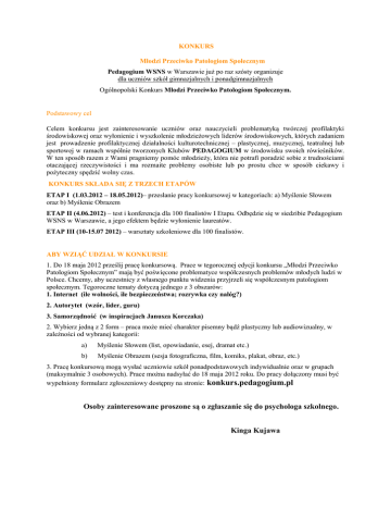 KONKURS Młodzi Przeciwko Patologiom Społecznym Pedagogium WSNS w Warszawie już po raz szósty organizuje dla uczniów szkół gimnazjalnych i ponadgimnazjalnych Ogólnopolski Konkurs Młodzi Przeciwko Patologiom Społecznym. Podstawowy cel Celem konkursu jest zainteresowanie uczniów oraz nauczycieli problematyką twórczej profilaktyki środowiskowej oraz wyłonienie i wyszkolenie młodzieżowych liderów środowiskowych, których zadaniem jest prowadzenie profilaktycznej działalności kulturotechnicznej – plastycznej, muzycznej, teatralnej lub sportowej w ramach wspólnie tworzonych Klubów PEDAGOGIUM w środowisku swoich rówieśników. W ten sposób razem z Wami pragniemy pomóc młodzieży, która nie potrafi poradzić sobie z trudnościami otaczającej rzeczywistości i ma rozmaite problemy osobiste lub po prostu chce w sposób ciekawy i pożyteczny spędzić wolny czas. KONKURS SKŁADA SIĘ Z TRZECH ETAPÓW ETAP I (1.03.2012 – 18.05.2012)– przesłanie pracy konkursowej w kategoriach: a) Myślenie Słowem oraz b) Myślenie Obrazem ETAP II (4.06.2012) – test i konferencja dla 100 finalistów I Etapu. Odbędzie się w siedzibie Pedagogium WSNS w Warszawie, a jego efektem będzie wyłonienie laureatów. ETAP III (10-15.07 2012) – warsztaty szkoleniowe dla 100 finalistów. ABY WZIĄĆ UDZIAŁ W KONKURSIE 1. Do 18 maja 2012 prześlij pracę konkursową. Prace w tegorocznej edycji konkursu „Młodzi Przeciwko Patologiom Społecznym” mają być poświęcone problematyce współczesnych problemów młodych ludzi w Polsce. Chcemy, aby uczestnicy z własnego punktu widzenia przyjrzeli się współczesnym patologiom społecznym. Tegoroczne tematy dotyczą jednego z 3 obszarów: 1. Internet (ile wolności, ile bezpieczeństwa; rozrywka czy nałóg?) 2. Autorytet (wzór, lider, guru) 3. Samorządność (w inspiracjach Janusza Korczaka) 2. Wybierz jedną z 2 form – praca może mieć charakter pisemny bądź plastyczny lub audiowizualny, w zależności od wybranej kategorii: a) Myślenie Słowem (list, opowiadanie, esej, dramat etc.) b) Myślenie Obrazem (sesja fotograficzna, film, komiks, plakat, obraz, etc.) 3. Pracę konkursową mogą wysłać uczniowie szkół ponadpodstawowych indywidualnie oraz w grupach (maksymalnie 3 osobowych). Prace można nadsyłać do 18 maja 2012 roku. Do pracy dołączony musi być wypełniony formularz zgłoszeniowy dostępny na stronie: konkurs.pedagogium.pl Osoby zainteresowane proszone są o zgłaszanie się do psychologa szkolnego. Kinga Kujawa