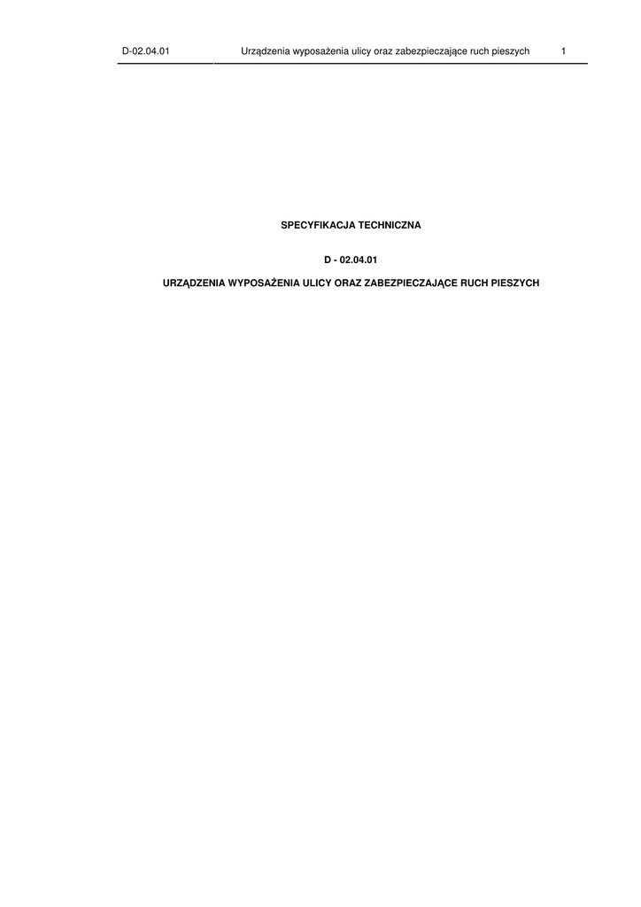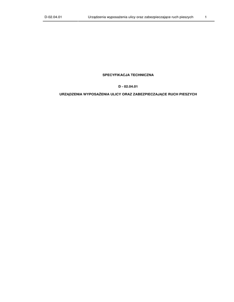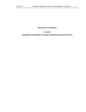 D-02.04.01 Urządzenia wyposażenia ulicy oraz zabezpieczające ruch pieszych SPECYFIKACJA TECHNICZNA D - 02.04.01 URZĄDZENIA WYPOSAŻENIA ULICY ORAZ ZABEZPIECZAJĄCE RUCH PIESZYCH 1 D-02.04.01 Urządzenia wyposażenia ulicy oraz zabezpieczające ruch pieszych 2 1. WSTĘP 1.1. Przedmiot SST Przedmiotem niniejszej szczegółowej specyfikacji technicznej (SST) są wymagania dotyczące wykonania i odbioru robót związanych z montażem urządzeń wyposażenia ulicy i zabezpieczających ruch pieszych. 1.2. Zakres stosowania SST Szczegółowa specyfikacja techniczna (SST) stanowi dokument przetargowy i kontraktowy przy zlecaniu i realizacji robót związanych z remontem kładki dla pieszych nad torami PKP w ciągu ulic Pakoskiej i Narutowicza w Inowrocławiu. 1.3. Zakres robót objętych SST Ustalenia zawarte w niniejszej specyfikacji dotyczą zasad prowadzenia robót związanych z montażem urządzeń wyposażenia ulicy: − koszy na śmieci, − ławek, oraz montażem urządzeń zabezpieczających ruch pieszych, do których należą: − barierki, − słupki przeszkodowe, − słupki przeszkodowe z łańcuchem. 1.4. Określenia podstawowe 1.4.1. Barierka - przegroda fizyczna separująca ruch pieszy od ruchu kołowego. 1.4.2. Łańcuch - wyrób o ogniwach zgrzewanych elektrycznie lub kutych. 1.4.3. Słupek przeszkodowy – przegroda fizyczna uniemożliwiająca wjazd pojazdu na chodnik oraz separująca ruch pieszy od ruchu kołowego. 1.4.4. Kosz na śmieci – pojemnik przeznaczony do gromadzenia odpadków, 1.4.5. Ławka – urządzenie przeznaczone do siedzenia i odpoczynku, 1.4.6. Pozostałe określenia podstawowe są zgodne z obowiązującymi, odpowiednimi polskimi normami i z definicjami podanymi w SST D-M-00.00.00 „Wymagania ogólne” pkt 1.4. 1.5. Ogólne wymagania dotyczące robót Ogólne wymagania dotyczące robót podano w SST D-M-00.00.00 „Wymagania ogólne” pkt 1.5. 2. MATERIAŁY 2.1. Ogólne wymagania dotyczące materiałów Ogólne wymagania dotyczące materiałów, ich pozyskiwania i składowania, podano w SST D-M00.00.00 „Wymagania ogólne” pkt 2. 2.2. Rodzaje materiałów Materiałami stosowanymi przy wykonywaniu urządzeń wyposażenia ulicy oraz zabezpieczających ruch pieszy objętych niniejszą SST, są: − żeliwo, − poręcze metalowe barier, − łańcuchy, − drewno, − beton i jego składniki, − materiały do malowania i renowacji powłok malarskich. D-02.04.01 Urządzenia wyposażenia ulicy oraz zabezpieczające ruch pieszych 3 2.3. Słupki żeliwne 2.3.1. Wymiary i najważniejsze charakterystyki słupków przeszkodowych 2.3.1.1 Słupek przeszkodowy Pionek I wymiary dolne (średnica dolna): 250 mm wysokość: 700 mm materiał: żeliwo ciężar: ok. 36 kg 2.3.1.2 Słupek przeszkodowy z łańcuchem Pionek II wymiary dolne (średnica dolna): 250 mm wysokość: 700 mm materiał: żeliwo ciężar: ok. 37 kg 2.3.1.3 Łańcuch Łańcuchy techniczne ogniwowe stosowane w barierach łańcuchowych winny odpowiadać wymaganiom wg PN-M-84540 [38], PN-M-84541 [39], PN-M-84542 [40], PN-M-84543 [41]. Ogniwa łańcuchów powinny mieć powierzchnie gładkie, bez wgłębień, pęknięć i naderwań. Dopuszcza się drobne uszkodzenia mechaniczne nie przekraczające dopuszczalnych odchyłek ustalonych dla prętów, z których wykonany jest łańcuch. Do wyrobu łańcuchów dopuszcza się tylko materiały posiadające zaświadczenia hutnicze z prętów lub walcówki ze stali w gatunku St1E, St1Z i 16GA. Dopuszcza się inne gatunki stali zaakceptowane przez Inżyniera. Łańcuchy muszą być zabezpieczone przed korozją przez ocynkowanie lub powlekanie antykorozyjne. D-02.04.01 Urządzenia wyposażenia ulicy oraz zabezpieczające ruch pieszych 2.4. Barierka wymiary dolne (średnica dolna): 76 mm wysokość: (1100) mm materiał: stal, żeliwo ciężar: ok. (13 - 15) kg 2.5. Kosz na śmieci wymiary górne (średnica górna): 500 mm wysokość: 1100 mm pojemność: 40 L grubość ścianek elementu: 1,0 mm ciężar: 19 kg 2.6. Ławka wymiary górne: (1800 x 700) mm 4 D-02.04.01 Urządzenia wyposażenia ulicy oraz zabezpieczające ruch pieszych 5 wymiary dolne: 590 mm wymiary siedziska: 420 mm wysokość: 590 mm wysokość siedziska od ziemi: 420 mm ilość listew: 5 wymiar (przekrój) listew: 40 mm ciężar: ok. 54 kg 2.7. Beton i jego składniki Deskowanie powinno zapewnić sztywność i niezmienność układu oraz bezpieczeństwo konstrukcji. Deskowanie powinno być skonstruowane w sposób umożliwiający łatwy jego montaż i demontaż. Przed wypełnieniem masą betonową, deskowanie powinno być sprawdzone, aby wykluczało wyciek zaprawy z masy betonowej, możliwość zniekształceń lub odchyleń w betonowanej konstrukcji. Klasa betonu - jeśli w dokumentacji projektowej lub SST nie określono inaczej, powinna być B 15 lub B 20. Beton powinien odpowiadać wymaganiom PN-B-06250 [3]. Składnikami betonu są: cement, kruszywo, woda i domieszki. Cement stosowany do betonu powinien być cementem portlandzkim klasy co najmniej „32,5”, odpowiadającym wymaganiom PN-B-19701 [8]. Transport i przechowywanie cementu powinny być zgodne z postanowieniami BN-88/B-6731-08 [46]. Kruszywo do betonu (piasek, żwir, grys, mieszanka z kruszywa naturalnego sortowanego, kruszywa łamanego i otoczaków) powinno odpowiadać wymaganiom PN-B-06712 [5]. Woda powinna być „odmiany 1”, zgodnie z wymaganiami PN-B-32250 [10]. Bez badań laboratoryjnych można stosować wodę pitną. Domieszki chemiczne do betonu powinny być stosowane, jeśli przewidują to dokumentacja projektowa, SST lub wskazania Inżyniera, przy czym w przypadku braku danych dotyczących rodzaju domieszek, ich dobór powinien być dokonany zgodnie z zaleceniami PN-B-06250 [3]. Domieszki powinny odpowiadać PN-B-23010 [9]. Pręty zbrojenia mogą być stosowane, jeśli przewiduje to dokumentacja projektowa lub SST. Pręty zbrojenia powinny odpowiadać PN-B-06251 [4]. Właściwości mechaniczne stali używanej do zbrojeni