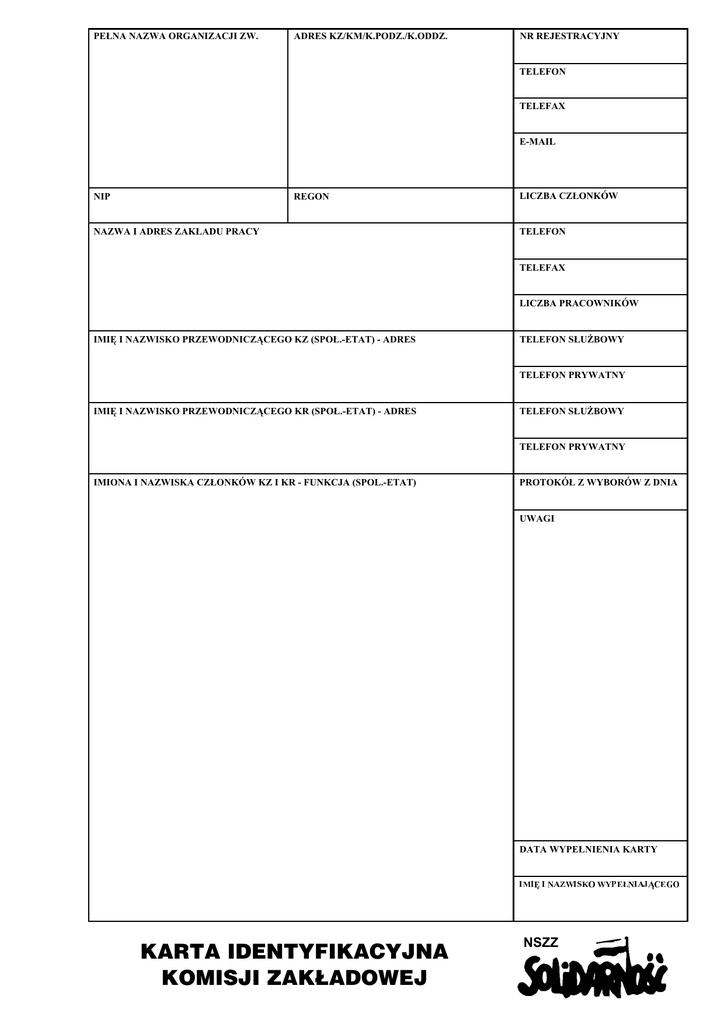 PEŁNA NAZWA ORGANIZACJI ZW. ADRES KZ/KM/K.PODZ./K.ODDZ. NR REJESTRACYJNY TELEFON TELEFAX E-MAIL NIP REGON NAZWA I ADRES ZAKŁADU PRACY LICZBA CZŁONKÓW TELEFON TELEFAX LICZBA PRACOWNIKÓW IMIĘ I NAZWISKO PRZEWODNICZĄCEGO KZ (SPOŁ.-ETAT) - ADRES TELEFON SŁUŻBOWY TELEFON PRYWATNY IMIĘ I NAZWISKO PRZEWODNICZĄCEGO KR (SPOŁ.-ETAT) - ADRES TELEFON SŁUŻBOWY TELEFON PRYWATNY IMIONA I NAZWISKA CZŁONKÓW KZ I KR - FUNKCJA (SPOL.-ETAT) PROTOKÓŁ Z WYBORÓW Z DNIA UWAGI DATA WYPEŁNIENIA KARTY IMIĘ I NAZWISKO WYPEŁNIAJĄCEGO KARTA IDENTYFIKACYJNA KOMISJI ZAK£ADOWEJ NSZZ IMIONA I NAZWISKA CZŁONKÓW KZ I KR - FUNKCJA (SPOL.-ETAT) CD. NAZWA REGIONALNEJ SEKCJI (BRANŻOWEJ, ZAWODOWEJ, PROBLEMOWEJ) SZKOLENIA - IMIONA I NAZWISKA - ZAKRES DELEGACI NA ZJAZD KRAJOWY - IMIONA I NAZWISKA DELEGACI NA WZD REGIONU - IMIONA I NAZWISKA - ADRESY - PROTOKÓŁ Z WYBORÓW Z DNIA ELEKTORZY NA MIĘDZYZAKŁADOWE ZEBRANIE WYBORCZE - IMIONA I NAZWISKA - PROTOKÓŁ Z WYBORÓW Z DNIA IMIĘ I NAZWISKO DELEGATA (ZASTĘPCY) NA ZEBRANIE KOMISJI KOORDYNACYJNEJ PROTOKÓŁ Z WYBORÓW Z DNIA NAZWA I SIEDZIBA BANKU PROWADZĄCEGO KONTO KZ NR KONTA