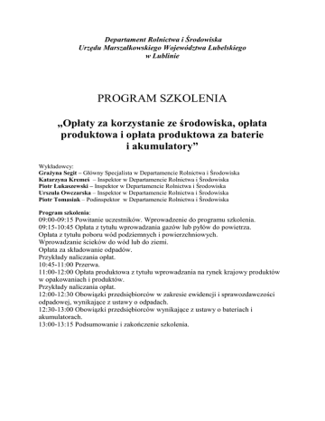 Departament Rolnictwa i Środowiska Urzędu Marszałkowskiego Województwa Lubelskiego w Lublinie PROGRAM SZKOLENIA „Opłaty za korzystanie ze środowiska, opłata produktowa i opłata produktowa za baterie i akumulatory” Wykładowcy: Grażyna Segit – Główny Specjalista w Departamencie Rolnictwa i Środowiska Katarzyna Kremeś – Inspektor w Departamencie Rolnictwa i Środowiska Piotr Łukaszewski – Inspektor w Departamencie Rolnictwa i Środowiska Urszula Owczarska – Inspektor w Departamencie Rolnictwa i Środowiska Piotr Tomasiak – Podinspektor w Departamencie Rolnictwa i Środowiska Program szkolenia: 09:00-09:15 Powitanie uczestników. Wprowadzenie do programu szkolenia. 09:15-10:45 Opłata z tytułu wprowadzania gazów lub pyłów do powietrza. Opłata z tytułu poboru wód podziemnych i powierzchniowych. Wprowadzanie ścieków do wód lub do ziemi. Opłata za składowanie odpadów. Przykłady naliczania opłat. 10:45-11:00 Przerwa. 11:00-12:00 Opłata produktowa z tytułu wprowadzania na rynek krajowy produktów w opakowaniach i produktów. Przykłady naliczania opłat. 12:00-12:30 Obowiązki przedsiębiorców w zakresie ewidencji i sprawozdawczości odpadowej, wynikające z ustawy o odpadach. 12:30-13:00 Obowiązki przedsiębiorców wynikające z ustawy o bateriach i akumulatorach. 13:00-13:15 Podsumowanie i zakończenie szkolenia.