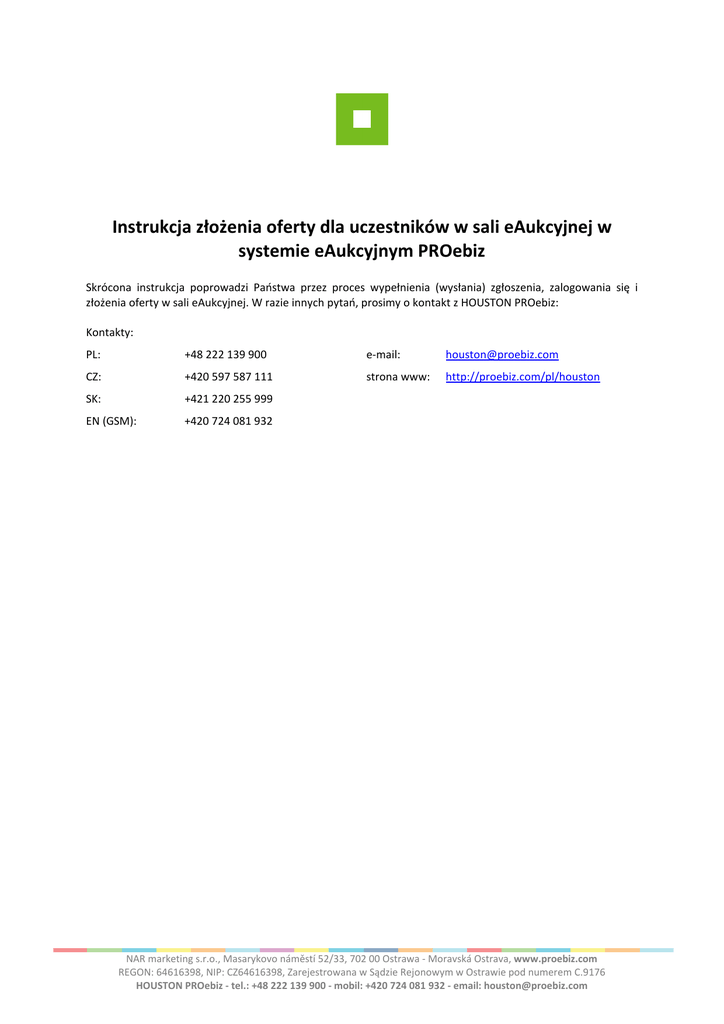Instrukcja złożenia oferty dla uczestników w sali eAukcyjnej w systemie eAukcyjnym PROebiz Skrócona instrukcja poprowadzi Państwa przez proces wypełnienia (wysłania) zgłoszenia, zalogowania się i złożenia oferty w sali eAukcyjnej. W razie innych pytań, prosimy o kontakt z HOUSTON PROebiz: Kontakty: PL: +48 222 139 900 e-mail: [email protected] CZ: +420 597 587 111 strona www: http://proebiz.com/pl/houston SK: +421 220 255 999 EN (GSM): +420 724 081 932 NAR marketing s.r.o., Masarykovo náměstí 52/33, 702 00 Ostrawa - Moravská Ostrava, www.proebiz.com REGON: 64616398, NIP: CZ64616398, Zarejestrowana w Sądzie Rejonowym w Ostrawie pod numerem C.9176 HOUSTON PROebiz - tel.: +48 222 139 900 - mobil: +420 724 081 932 - email: [email protected] Zaproszenie do eAukcji Za pośrednictwem wiadomości e-mail użytkownik otrzymał Zaproszenie do uczestnictwa w eAukcji w systemie eAukcyjnym PROebiz. Pierwszym krokiem jest uważne zapoznanie się z tekstem Zaproszenia (Warunki przetargu i Przedmiot) do udziału w przetargu. Tekst zaproszenia pojawi się po kliknięciu na właściwy link we wiadomości e-mail. Po uzyskaniu klucza dostępu po zalogowaniu się do eAukcji należy wypełnić zgłoszenie. Formularz zgłoszeniowy znajduje się w części Zgłoszenie, pod klawiszem "TUTAJ". W zgłoszeniu należy wypełnić wszystkie pola zaznaczone kolorem czerwonym, czyli tzw. wymagane dane. Zgłoszenie należy wysłać klikając na przycisk "Wyślij". NAR marketing s.r.o., Masarykovo náměstí 52/33, 702 00 Ostrawa - Moravská Ostrava, www.proebiz.com REGON: 64616398, NIP: CZ64616398, Zarejestrowana w Sądzie Rejonowym w Ostrawie pod numerem C.9176 HOUSTON PROebiz - tel.: +48 222 139 900 - mobil: +420 724 081 932 - email: [email protected] NAR marketing s.r.o., Masarykovo náměstí 52/33, 702 00 Ostrawa - Moravská Ostrava, www.proebiz.com REGON: 64616398, NIP: CZ64616398, Zarejestrowana w Sądzie Rejonowym w Ostrawie pod numerem C.9176 HOUSTON PROebiz - tel.: +48 222 139 900 - mobil: +420 724 081 932 - email: [email protected] Po pomyślnym wysłaniu wypełnionego zgłoszenia, administrator po stronie Zleceniodawcy otrzyma e-mail z potwierdzeniem przyjęcia zgłoszenia. Uczestnik następnie otrzyma dziesięcioznakowy klucz dostępu. Klucz jest wymagany do pomyślnego zalogowania się do sali eAukcyjnej wraz z loginem i hasłem wybranym podczas wypełniania zgłoszenia. Logowanie się do sali eAukcyjnej Sala eAukcyjna znajduję się pod adresem podanym w Zaproszeniu lub wiadomości e-mail z kluczem dostępu (standardowo - http://nazwafirmy.proebiz.com). Adres należy otworzyć w przeglądarce internetowej. W niebieskim polu znajdującym się w prawym dolnym rogu należy wpisać login, hasło i klucz dostępu, a następnie kliknąć OK. NAR marketing s.r.o., Masarykovo náměstí 52/33, 702 00 Ostrawa - Moravská Ostrava, www.proebiz.com REGON: 64616398, NIP: CZ64616398, Zarejestrowana w Sądzie Rejonowym w Ostrawie pod numerem C.9176 HOUSTON PROebiz - tel.: +48 222 139 900 - mobil: +420 724 081 932 - email: [email protected] Sala eAukcyjna Po pomyślnym zalogowaniu się w systemie pojawi się sala eAukcyjna. eAukcja zazwyczaj rozpoczyna się Rundą Wstępną, podczas której należy złożyć ofertę wstępną, następnie przebiega Runda Kontrolna lub bezpośrednio Runda Aukcyjna. Informacje o aktualnie przebiegającej rundzie można znaleźć w lewej górnej części sali eAukcyjnej wraz z sygnaturą czasową, która informuje o liczbie dni-godzin-minut-sekund pozostałych do końca danej rundy. Poniżej znajduje się podgląd sali eAukcyjnej podczas przebiegającej Rundy Aukcyjnej z opisem sali eAukcyjnej i instrukcją złożenia oferty. W celu poprawy przejrzystości opisu sala eAukcyjna została podzielona na części. Opis poszczególnych części sali eAukcyjnej podano poniżej. 1. Lista pozycji Po lewej stronie sali eAukcyjnej znajduje się lista pozycji, które stanowią przedmiot eAukcji. Jeżeli tekst pozycji podkreślono, klikając na daną pozycję można ją rozwinąć w celu zapoznania się z bliższą specyfikacją pozycji, ewentualnie możliwe jest pobranie plików (dokumentów PDF, fotografii w formie JPG, itd.). Liczba zamawianych pozycji znajduje się w kolumnie "Ilość". 2. Złożenie oferty Ofertę można złożyć w bardzo prosty sposób, należy wpisać odpowiednią kwotę, a następnie potwierdzić operację klawiszem Enter. Tym samym oferta zostanie zapisana w systemie. Ofertę należy wpisać w prawej kolumnie w wierszu właściwym dla danych pozycji. System automatycznie zsumuje wszystkie pozycje oferty i wygeneruje całkowitą cenę oferty. 3. Warunki zmienne Poza listą pozycji eAukcja może zawierać również Warunki zmienne (Termin płatności faktur, Gwarancję, itd.). Warunki zmienne standardowo można znaleźć pod listą pozycji. Należy pamiętać, by podczas zapisywania oferty wypełnić również pole z Warunkami zmiennymi. Operacja przebiega podobnie do ofert dotyczących poszczególnych pozycji, tzn. poprzez wpisanie kwoty ofery i potwierdzenie klawiszem Enter. Zdarza się, że wartości Warunków zmiennych wypełniono standardowo, należy w takim przypadku kliknąć na przycisk "Wybierz", wybrać odpowiednią wartość i ponownie potwierdzić operację przyciskiem "Zmień". NAR marketing s.r.o., Masarykovo náměstí 52/33, 702 00 Ostrawa - Moravská Ostrava, www.proebiz.com REGON: 64616398, NIP: CZ64616398, Zarejestrowana w Sądzie Rejonowym w Ostrawie pod numerem C.9176 HOUSTON PROebiz - tel.: +48 222 139 900 - mobil: +420 724 081 932 - email: [email protected] 4. Kolejność Zleceniodawca eAukcji podczas Rundy Aukcyjnej ma prawo ujawnić aktualną pozycję Uczestnika. Ujawnienie aktualnej kolejności jest funkcją opcjonalną i jest zależna od wybranej strategii Zleceniodawcy lub obowiązującej przepisami prawa. 5. Najlepsza oferta Zleceniodawca eAukcji może również ujawnić najlepsze oferty dla poszczególnych pozycji. Może w ten sposób 