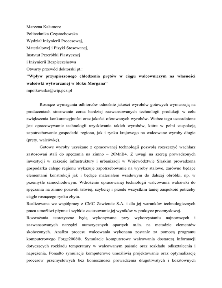 Marzena Kałamorz Politechnika Częstochowska Wydział Inżynierii Procesowej, Materiałowej i Fizyki Stosowanej, Instytut Przeróbki Plastycznej i Inżynierii Bezpieczeństwa Otwarty przewód doktorski pt.: "Wpływ przyspieszonego chłodzenia prętów w ciągu walcowniczym na własności walcówki wytwarzanej w bloku Morgana" [email protected] Rosnące wymagania odbiorców odnośnie jakości wyrobów gotowych wymuszają na producentach stosowanie coraz bardziej zaawansowanych technologii produkcji w celu zwiększenia konkurencyjności oraz jakości oferowanych wyrobów. Wobec tego uzasadnione jest opracowywanie technologii uzyskiwania takich wyrobów, które w pełni zaspokoją zapotrzebowanie gospodarki regionu, jak i rynku krajowego na walcowane wyroby długie (pręty, walcówkę). Gotowe wyroby uzyskane z opracowanej technologii pozwolą rozszerzyć wachlarz zastosowań stali do spęczania na zimno – 20MnB4. Z uwagi na szereg prowadzonych inwestycji w zakresie infrastruktury i urbanizacji w Województwie Śląskim prowadzona gospodarka całego regionu wykazuje zapotrzebowanie na wyroby stalowe, zarówno będące elementami konstrukcji jak i będące materiałem wsadowym do dalszej obróbki, np. w przemyśle samochodowym. Wdrożenie opracowanej technologii walcowania walcówki do spęczania na zimno pozwoli łatwiej, szybciej i przede wszystkim taniej zaspokoić potrzeby ciągle rosnącego rynku zbytu. Realizowana we współpracy z CMC Zawiercie S.A. i dla jej warunków technologicznych praca umożliwi płynne i szybkie zastosowanie jej wyników w praktyce przemysłowej. Rozważania teoretyczne zaawansowanych narzędzi będą wykonywane przy numerycznych opartych wykorzystaniu najnowszych m.in. na metodzie i elementów skończonych. Analiza procesu walcowania wykonana zostanie za pomocą programu komputerowego Forge2008®. Symulacje komputerowe walcowania dostarczą informacji dotyczących rozkładu temperatury w walcowanym paśmie oraz rozkładu odkształcenia i naprężenia. Ponadto symulacje komputerowe umożliwią projektowanie oraz optymalizację procesów przemysłowych bez konieczności prowadzenia długotrwałych i kosztownych doświadczeń w linii technologicznej W numerycznym modelowaniu procesu walcownia zostaną uwzględnione wyniki badań dotyczące poszczególnego gatunku stali – 20MnB4, wykonane za pomocą dylatometru DIL 805A/D i symulatora fizycznego Gleeble 3800, którymi dysponuje Instytut Przeróbki Plastycznej i Inżynierii Bezpieczeństwa Politechniki Częstochowskiej. Na podstawie otrzymanych wyników badań zostaną opracowane modele numeryczne własności stali 20MnB4 jak i również modele umożliwiające zbadanie rozwoju mikrostruktury podczas walcowania z uwzględnieniem przyspieszonego chłodzenia. Na podstawie przeprowadzonych badań zostanie opracowana teoretyczno doświadczalna metodyka optymalizacji parametrów procesów walcowania walcówki, w celu uzyskania żądanych własności mechanicznych gotowego wyrobu dla jednej z Hut Województwa Śląskiego. Wynikiem końcowym projektu będzie wdrożenie opracowanej technologii walcowania walcówki ze stali przeznaczonych do spęczania na zimno w warunkach technologicznych jednej walcowni na terenie Województwa Śląskiego.
