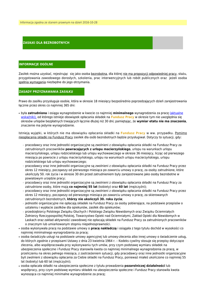 Informacja zgodna ze stanem prawnym na dzień 2016-10-28 ZASIŁKI DLA BEZROBOTNYCH INFORMACJE OGÓLNE Zasiłek można uzyskać, rejestrując się jako osoba bezrobotna, dla której nie ma propozycji odpowiedniej pracy, stażu, przygotowania zawodowego dorosłych, szkolenia, prac interwencyjnych lub robót publicznych oraz jeżeli osoba spełnia wymagania niezbędne do jego otrzymania. ZASADY PRZYZNAWANIA ZASIŁKU Prawo do zasiłku przysługuje osobie, która w okresie 18 miesięcy bezpośrednio poprzedzających dzień zarejestrowania łącznie przez okres co najmniej 365 dni: ● była zatrudniona i osiąga wynagrodzenie w kwocie co najmniej minimalnego wynagrodzenia za pracę (aktualne wskaźniki), od którego istnieje obowiązek opłacania składek na Fundusz Pracy w okresie tym nie uwzględnia się okresów urlopów bezpłatnych trwających łącznie dłużej niż 30 dni; pamiętając, że wymiar etatu nie ma znaczenia, znaczenie ma jedynie wynagrodzenie. Istnieją wyjątki, w których nie ma obowiązku opłacania składki na Fundusz Pracy w ww. przypadku. Pomimo nieopłacania składki na Fundusz Pracy zasiłek dla osób bezrobotnych będzie przysługiwał. Dotyczy to sytuacji, gdy: pracodawcy oraz inne jednostki organizacyjne są zwolnieni z obowiązku opłacania składki na Fundusz Pracy za zatrudnionych pracowników powracających z urlopu macierzyńskiego, urlopu na warunkach urlopu macierzyńskiego, urlopu rodzicielskiego lub urlopu wychowawczego w okresie 36 miesięcy, licząc od pierwszego miesiąca po powrocie z urlopu macierzyńskiego, urlopu na warunkach urlopu macierzyńskiego, urlopu rodzicielskiego lub urlopu wychowawczego; pracodawcy oraz inne jednostki organizacyjne są zwolnieni z obowiązku opłacania składki na Fundusz Pracy przez okres 12 miesięcy, począwszy od pierwszego miesiąca po zawarciu umowy o pracę, za osoby zatrudnione, które ukończyły 50. rok życia i w okresie 30 dni przed zatrudnieniem były zarejestrowane jako osoby bezrobotne w powiatowym urzędzie pracy; pracodawcy oraz inne jednostki organizacyjne są zwolnieni z obowiązku opłacania składki na Fundusz Pracy za zatrudnione osoby, które mają co najmniej 55 lat (kobiety) oraz 60 lat (mężczyźni); pracodawcy oraz inne jednostki organizacyjne są zwolnieni z obowiązku opłacania składki na Fundusz Pracy przez okres 12 miesięcy, począwszy od pierwszego miesiąca po zawarciu umowy o pracę, za skierowanych zatrudnionych bezrobotnych, którzy nie ukończyli 30. roku życia; jednostki organizacyjne nie opłacają składek na Fundusz Pracy za osoby pobierające, na podstawie przepisów o ustaleniu i wypłacie zasiłków dla opiekunów, zasiłek dla opiekunów; przedsiębiorcy Polskiego Związku Głuchych i Polskiego Związku Niewidomych oraz Związku Ociemniałych Żołnierzy Rzeczypospolitej Polskiej, Towarzystwo Opieki nad Ociemniałymi, Zakład Opieki dla Niewidomych w Laskach oraz zakład aktywności zawodowej nie opłacają składek na Fundusz Pracy za zatrudnionych pracowników o znacznym lub umiarkowanym stopniu niepełnosprawności. osoba wykonywała pracę na podstawie umowy o pracę nakładczą i osiągała z tego tytułu dochód w wysokości co najmniej minimalnego wynagrodzenia za pracę; osoba świadczyła usługi na podstawie umowy agencyjnej lub umowy-zlecenia albo innej umowy o świadczenie usług, do których zgodnie z przepisami Ustawy z dnia 23 kwietnia 1964 r. – Kodeks cywilny stosuje się przepisy dotyczące zlecenia, albo współpracowała przy wykonywaniu tych umów, przy czym podstawę wymiaru składek na ubezpieczenia społeczne i Fundusz Pracy stanowiła kwota co najmniej minimalnego wynagrodzenia za pracę, w przeliczeniu na okres pełnego miesiąca, z zastrzeżeniem sytuacji, gdy pracodawcy oraz inne jednostki organizacyjne byli zwolnieni z obowiązku opłacania za Ciebie składki na Fundusz Pracy, ponieważ miałeś ukończone co najmniej 55 lat (kobiety) lub 60 lat (mężczyźni); osoba opłacała składki na ubezpieczenia społeczne z tytułu prowadzenia pozarolniczej działalności lub współpracy, przy czym podstawę wymiaru składek na ubezpieczenia społeczne i Fundusz Pracy stanowiła kwota wynosząca co najmniej minimalne wynagrodzenie za pracę; ❍ ❍ ❍ ❍ ❍ ❍ ● ● ● ● ● ● ● ● wykonywała pracę w okresie tymczasowego aresztowania lub odbywania kary pozbawienia wolności, przy czym podstawę wymiaru składek na ubezpieczenia społeczne i Fundusz Pracy stanowiła kwota co najmniej minimalnego wynagrodzenia za pracę (jeżeli osoba zarejestrowała się w okresie 30 dni od dnia zwolnienia z zakładu karnego lub aresztu śledczego, masz prawo do zasiłku, jeżeli suma okresów uprawniających do zasiłku, przypadających w okresie 18 miesięcy przed ostatnim pozbawieniem wolności oraz wykonywania pracy w okresie pozbawienia wolności wynosiła co najmniej 365 dni, przy czym podstawę wymiaru składek na ubezpieczenia społeczne i Fundusz Pracy stanowiła kwota w wysokości co najmniej minimalnego wynagrodzenia za pracę; w przypadku pozbawienia wolności w okresie pobierania zasiłku – po zwolnieniu z zakładu karnego lub aresztu śledczego przysługuje prawo do zasiłku na okres skrócony o okres pobierania zasiłku przed pozbawieniem wolności i w trakcie przerw w odbywaniu kary); wykonywała pracę w rolniczej spółdzielni produkcyjnej, spółdzielni kółek rolniczych lub spółdzielni usług rolniczych, będąc członkiem tej spółdzielni, przy czym podstawę wymiaru składek na ubezpieczenia społeczne i Fundusz Pracy stanowiła kwota co najmniej minimalnego wynagrodzenia za pracę; opłacała składkę na Fundusz Pracy w związku z zatrudnieniem lub wykonywaniem innej pracy zarobkowej za granicą u pracodawcy zagranicznego (oprócz państw członkowskich Unii Europejskiej) w wysokości 9,75% przeciętnego wynagrodzenia za każdy miesiąc zatrudnienia; była zatrudniona za granicą i przybyła do Rzeczypospolitej Polskie