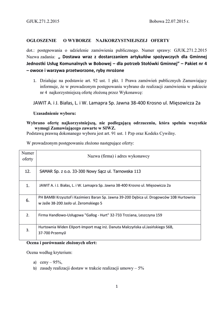GJUK.271.2.2015 OGŁOSZENIE Bobowa 22.07.2015 r. O WYBORZE NAJKORZYSTNIEJSZEJ OFERTY dot.: postępowania o udzielenie zamówienia publicznego. Numer sprawy: GJUK.271.2.2015 Nazwa zadania: „ Dostawa wraz z dostarczaniem artykułów spożywczych dla Gminnej Jednostki Usług Komunalnych w Bobowej – dla potrzeb Stołówki Gminnej” – Pakiet nr 4 – owoce i warzywa przetworzone, ryby mrożone 1. Działając na podstawie art. 92 ust. 1 pkt. 1 Prawa zamówień publicznych Zamawiający informuje, że w prowadzonym postępowaniu wybrano do realizacji zamówienia w pakiecie nr 4 najkorzystniejszą ofertę złożoną przez Wykonawcę: JAWIT A. i J. Białas, L. i W. Lamapra Sp. Jawna 38-400 Krosno ul. Mięsowicza 2a Uzasadnienie wyboru: Wybrano ofertę najkorzystniejszą, nie podlegającą odrzuceniu, która spełnia wszystkie wymogi Zamawiającego zawarte w SIWZ. Podstawą prawną dokonanego wyboru jest art. 91 ust. 1 Pzp oraz Kodeks Cywilny. W prowadzonym postępowaniu złożono następujące oferty: Numer oferty Nazwa (firma) i adres wykonawcy 12. SAMAR Sp. z o.o. 33-300 Nowy Sącz ul. Tarnowska 113 1. JAWIT A. i J. Białas, L. i W. Lamapra Sp. Jawna 38-400 Krosno ul. Mięsowicza 2a 6. PH BAMBI Krzysztof i Kazimierz Baran Sp. Jawna 39-200 Dębica ul. Drogowców 10B Hurtownia w Jaśle 38-200 Jasło ul. Żeromskiego 5 2. Firma Handlowo-Usługowa "Gallog - Hurt" 32-733 Trzciana, Leszczyna 159 3. Hurtownia Widen EXport-Import mag inż. Danuta Malczyńska ul.Jasińskiego 56B, 37-700 Przemyśl Ocena i porównanie złożonych ofert: Ocena według kryterium: a) ceny – 95%, b) zasady realizacji dostaw w trakcie realizacji umowy – 5% 1 Oferta nr 1 liczba punktów – 100,00 Oferta nr 2 liczba punktów – 85,58 Oferta nr 3 liczba punktów – 89,22 Oferta nr 6 liczba punktów - 86,09 Oferta nr 12 liczba punktów - 90,24 Kierownik Zamawiającego Dorota Popiela 2