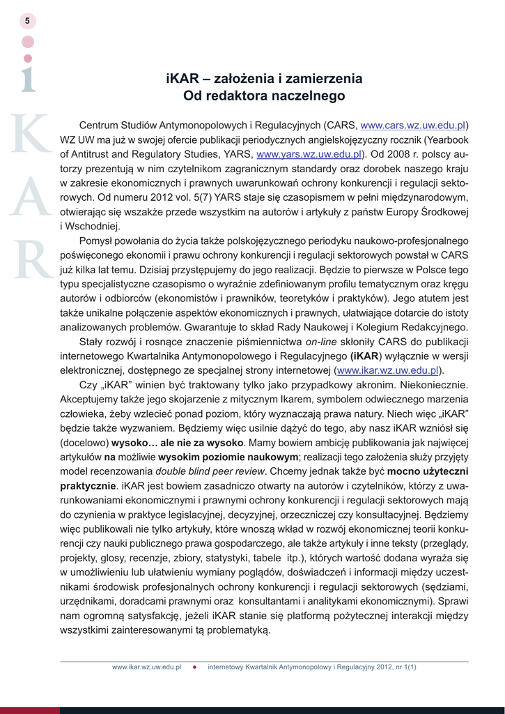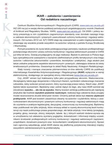 5 iKAR – założenia i zamierzenia Od redaktora naczelnego Centrum Studiów Antymonopolowych i Regulacyjnych (CARS, www.cars.wz.uw.edu.pl) WZ UW ma już w swojej ofercie publikacji periodycznych angielskojęzyczny rocznik (Yearbook of Antitrust and Regulatory Studies, YARS, www.yars.wz.uw.edu.pl). Od 2008 r. polscy autorzy prezentują w nim czytelnikom zagranicznym standardy oraz dorobek naszego kraju w zakresie ekonomicznych i prawnych uwarunkowań ochrony konkurencji i regulacji sektorowych. Od numeru 2012 vol. 5(7) YARS staje się czasopismem w pełni międzynarodowym, otwierając się wszakże przede wszystkim na autorów i artykuły z państw Europy Środkowej i Wschodniej. Pomysł powołania do życia także polskojęzycznego periodyku naukowo-profesjonalnego poświęconego ekonomii i prawu ochrony konkurencji i regulacji sektorowych powstał w CARS już kilka lat temu. Dzisiaj przystępujemy do jego realizacji. Będzie to pierwsze w Polsce tego typu specjalistyczne czasopismo o wyraźnie zdefiniowanym profilu tematycznym oraz kręgu autorów i odbiorców (ekonomistów i prawników, teoretyków i praktyków). Jego atutem jest także unikalne połączenie aspektów ekonomicznych i prawnych, ułatwiające dotarcie do istoty analizowanych problemów. Gwarantuje to skład Rady Naukowej i Kolegium Redakcyjnego. Stały rozwój i rosnące znaczenie piśmiennictwa on-line skłoniły CARS do publikacji internetowego Kwartalnika Antymonopolowego i Regulacyjnego (iKAR) wyłącznie w wersji elektronicznej, dostępnego ze specjalnej strony internetowej (www.ikar.wz.uw.edu.pl). Czy „iKAR” winien być traktowany tylko jako przypadkowy akronim. Niekoniecznie. Akceptujemy także jego skojarzenie z mitycznym Ikarem, symbolem odwiecznego marzenia człowieka, żeby wzlecieć ponad poziom, który wyznaczają prawa natury. Niech więc „iKAR” będzie także wyzwaniem. Będziemy więc usilnie dążyć do tego, aby nasz iKAR wzniósł się (docelowo) wysoko… ale nie za wysoko. Mamy bowiem ambicję publikowania jak najwięcej artykułów na możliwie wysokim poziomie naukowym; realizacji tego założenia służy przyjęty model recenzowania double blind peer review. Chcemy jednak także być mocno użyteczni praktycznie. iKAR jest bowiem zasadniczo otwarty na autorów i czytelników, którzy z uwarunkowaniami ekonomicznymi i prawnymi ochrony konkurencji i regulacji sektorowych mają do czynienia w praktyce legislacyjnej, decyzyjnej, orzeczniczej czy konsultacyjnej. Będziemy więc publikowali nie tylko artykuły, które wnoszą wkład w rozwój ekonomicznej teorii konkurencji czy nauki publicznego prawa gospodarczego, ale także artykuły i inne teksty (przeglądy, projekty, glosy, recenzje, zbiory, statystyki, tabele itp.), których wartość dodana wyraża się w umożliwieniu lub ułatwieniu wymiany poglądów, doświadczeń i informacji między uczestnikami środowisk profesjonalnych ochrony konkurencji i regulacji sektorowych (sędziami, urzędnikami, doradcami prawnymi oraz konsultantami i analitykami ekonomicznymi). Sprawi nam ogromną satysfakcję, jeżeli iKAR stanie się platformą pożytecznej interakcji między wszystkimi zainteresowanymi tą problematyką. www.ikar.wz.uw.edu.pl internetowy Kwartalnik Antymonopolowy i Regulacyjny 2012, nr 1(1) 6 iKAR – założenia i zamierzenia. Od redaktora naczelnego. Dzisiaj, dokładnie w 5. rocznicę wejścia w życie ustawy z 16.02.2007 r. o ochronie konkurencji i konsumentów, prezentujemy Czytelnikom inauguracyjny numert iKAR. I od razu tym numerem staramy się wpisać w rozpoczętą niedawno dyskusję środowiskową wokół potrzeby i zamiarów nowelizacji tej ustawy. Zeszyt otwiera Prezes UOKiK, dr Małgorzata Krasnodębska-Tomkiel, przedstawiając zmiany, jakie zamierza zaproponować Urząd – przede wszystkim w celu podwyższenia skuteczności ochrony konkurencji. Autorzy artykułów, w oparciu o naukową analizę dorobku wybranych obszarów ochrony konkurencji i konsumentów lub własne doświadczenia praktyczne, wskazują na zmiany pożądane z innych powodów, np. dla podwyższenia poziomu pewności prawnej lub realizacji podstawowych wymogów sprawiedliwości proceduralnej. To jednak dopiero początek. Z całą pewnością przynajmniej w dwóch następnych zeszytach iKAR pojawią się artykuły i inne teksty związane z dorobkiem i pożądanymi zmianami uokik z 2007 r., których autorzy będą zarówno odnosić się do zmian proponowanych wstępnie przez UOKiK, jak też wskazywać i uzasadniać inne pożądane zmiany ustawy – tak w sferze norm materialnoprawnych, jak i reguł ich stosowania. Prezentowany numer zawiera również inne teksty – niezwiązane bezpośrednio z planowaną nowelizacją uokik z 2007 r. Dotyczą one różnych kwestii i mają różny charakter. Także w przyszłości będziemy m.in. publikowali opracowania powstałe we współpracy z sądami i władzami administracyjnymi polskimi i unijnymi. Poświęcimy wiele miejsca doświadczeniom innych krajów. Jesteśmy otwarci na inne propozycje – tak autorów, jak i Czytelników. Zachęcamy do współpracy. Prof. UW dr hab. Tadeusz Skoczny Warszawa, 21.04.2012 r. www.ikar.wz.uw.edu.pl internetowy Kwartalnik Antymonopolowy i Regulacyjny 2012, nr 1(1)