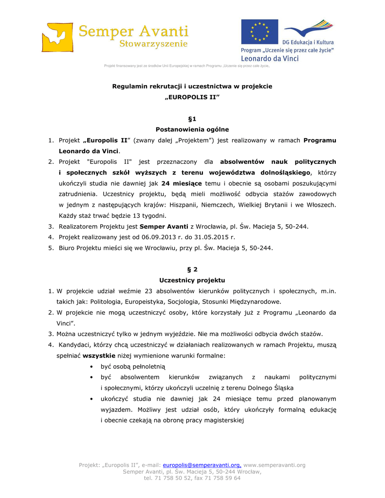 Projekt finansowany jest ze środków Unii Europejskiej w ramach Programu „Uczenie się przez całe życie„ Regulamin rekrutacji i uczestnictwa w projekcie „EUROPOLIS II” §1 Postanowienia ogólne 1. Projekt „Europolis II” (zwany dalej „Projektem”) jest realizowany w ramach Programu Leonardo da Vinci. 2. Projekt "Europolis II" jest przeznaczony dla absolwentów nauk politycznych i społecznych szkół wyższych z terenu województwa dolnośląskiego, którzy ukończyli studia nie dawniej jak 24 miesiące temu i obecnie są osobami poszukującymi zatrudnienia. Uczestnicy projektu, będą mieli możliwość odbycia stażów zawodowych w jednym z następujących krajów: Hiszpanii, Niemczech, Wielkiej Brytanii i we Włoszech. Każdy staż trwać będzie 13 tygodni. 3. Realizatorem Projektu jest Semper Avanti z Wrocławia, pl. Św. Macieja 5, 50-244. 4. Projekt realizowany jest od 06.09.2013 r. do 31.05.2015 r. 5. Biuro Projektu mieści się we Wrocławiu, przy pl. Św. Macieja 5, 50-244. §2 Uczestnicy projektu 1. W projekcie udział weźmie 23 absolwentów kierunków politycznych i społecznych, m.in. takich jak: Politologia, Europeistyka, Socjologia, Stosunki Międzynarodowe. 2. W projekcie nie mogą uczestniczyć osoby, które korzystały już z Programu „Leonardo da Vinci”. 3. Można uczestniczyć tylko w jednym wyjeździe. Nie ma możliwości odbycia dwóch stażów. 4. Kandydaci, którzy chcą uczestniczyć w działaniach realizowanych w ramach Projektu, muszą spełniać wszystkie niżej wymienione warunki formalne: • być osobą pełnoletnią • być absolwentem kierunków związanych z naukami politycznymi i społecznymi, którzy ukończyli uczelnię z terenu Dolnego Śląska • ukończyć studia nie dawniej jak 24 miesiące temu przed planowanym wyjazdem. Możliwy jest udział osób, który ukończyły formalną edukację i obecnie czekają na obronę pracy magisterskiej Projekt: „Europolis II”, e-mail: [email protected], www.semperavanti.org Semper Avanti, pl. Św. Macieja 5, 50-244 Wrocław, tel. 71 758 50 52, fax 71 758 59 64 Projekt finansowany jest ze środków Unii Europejskiej w ramach Programu „Uczenie się przez całe życie„ • być osobą nieaktywną zawodowo1 • zadeklarować chęć udział w całym projekcie, a w tym fazie przygotowawczej (szkoleniowej) oraz ewaluacyjnej (włącznie z ewaluacją odbywającą się po powrocie z wyjazdu) • posiadać znajomość języka angielskiego co najmniej na poziomie B1. §3 Cel i założenia projektu 1. Celem projektu jest nabycie przez absolwentów kierunków politycznych i społecznych nowych kwalifikacji oraz doświadczenia zawodowego umożliwiających im zdobycie pracy po zakończeniu stażu. 2. Celami szczegółowymi projektu są: • polepszenie znajomości języków obcych • nabycie praktycznej umiejętności pracy w zespole międzynarodowym • rozwój umiejętności efektywnego poruszania się po rynku pracy • zwiększenie świadomości dotyczącej korzyści płynących z innych form (współ)pracy 3. Oczekiwanymi rezultatami są: • podniesienie umiejętności pracy w grupie • przygotowanie do pracy w zespołach międzynarodowych • przygotowanie do pracy na stanowiskach innych niż te związane z wykształceniem • zwiększenie świadomości dotyczącej korzyści płynących z nauki języków obcych • zwiększenie szans absolwentów na znalezienie lepszej pracy po zakończeniu stażu • podniesienie samooceny absolwentów. §4 1 Osoba nieaktywna zawodowo to osoba pozostająca bez zatrudnienia (osoba w wieku 15 – 64 lata, niezatrudniona, nie wykonująca innej pracy zarobkowej, zdolna i gotowa do podjęcia zatrudnienia lub innej pracy zarobkowej w co najmniej połowie wymiaru czasu pracy), która jednocześnie nie zalicza się do kategorii bezrobotni. Projekt: „Europolis II”, e-mail: [email protected], www.semperavanti.org Semper Avanti, pl. Św. Macieja 5, 50-244 Wrocław, tel. 71 758 50 52, fax 71 758 59 64 Projekt finansowany jest ze środków Unii Europejskiej w ramach Programu „Uczenie się przez całe życie„ Zakres i organizacja wsparcia 1. 2. 3. W ramach Projektu uczestnicy będą mogli odbyć trzynastotygodniowe staże zawodowe w: • Niemczech – 6 osób • Hiszpanii – 5 osób • Włoszech – 5 osób • Wielkiej Brytanii – 7 osób W ramach projektu Uczestnicy wezmą udział w przygotowaniu: • kulturowym • pedagogicznym • językowym Zajęcia odbywać się będą zgodnie z przyjętym harmonogramem i planem zajęć o ustalonej liczbie godzin. Harmonogram zostanie przekazany Uczestnikom po zakończeniu rekrutacji i przed rozpoczęciem zajęć. 4. W ramach projektu Uczestnicy odbędą 13-tygodniowe staże w organizacjach pozarządowych lub przedsiębiorstwach 5. Decyzja co do formy i miejsca odbycia stażu zostanie ustalona z Uczestnikami, uwzględniając ich preferencje oraz możliwości ich zrealizowania. 6. Realizator nie ponosi za odpowiedzialności za miejsce stażu, a także czas w jakim informacja o nim zostanie przekazana uczestnikowi przed wyjazdem. 7. W znalezieniu miejsca stażowego pośredniczyć będzie organizacja partnerska z kraju stażu. 8. Stażysta może być zobowiązany do odbycia dodatkowych rozmów z potencjalnym pracodawcą jeszcze przed wyjazdem. 9. W ramach projektu Uczestnikom pokryte lub zwrócone zostaną koszty przejazdu i zakwaterowania. Uczestnicy otrzymają kieszonkowe na wyżywienie nie mniejsze niż 450 euro na cały wyjazd oraz dodatkowe fundusze na program kulturowy, tj. wizyty w muzeach, teatrach, wystawach. §5 Rekrutacja 1. Pierwszy etap rekrutacji „Aplikowanie” rozpocznie się w dniu 1.10.2014 i będzie trwać ciągle. W jego czasie kandydaci będą zgłaszać się do udziału w projekcie na wyznaczonych do tego celu formularzach. 2. Uczestnicy, którzy przejdą przez pierwszy etap rekrutacji zostaną dopuszczeni do etapu drugiego, w czasie którego odbędą się rozmowy kwalifikacyjne. Te mogą przep