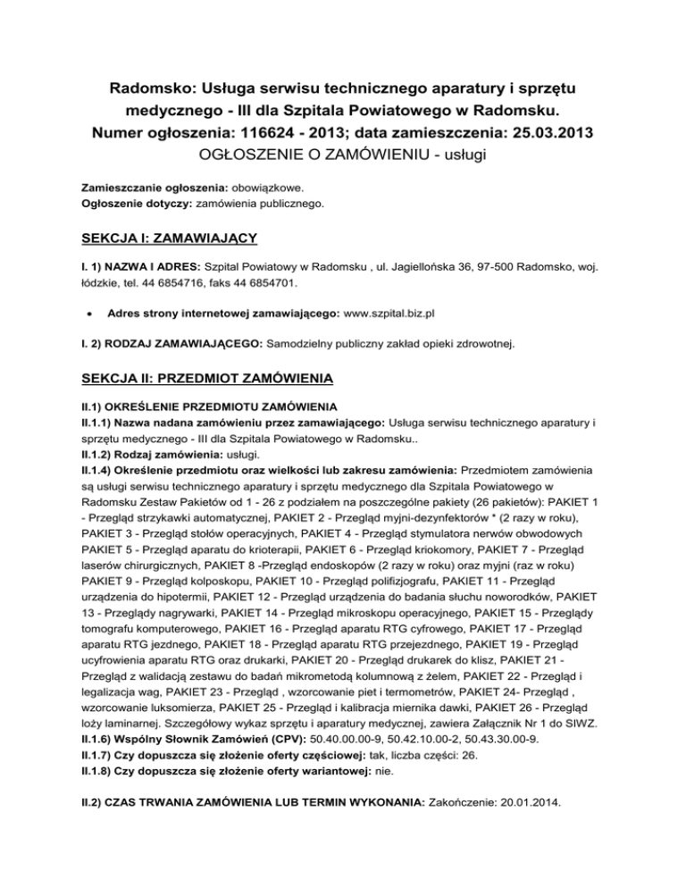 Radomsko: Usługa serwisu technicznego aparatury i sprzętu medycznego - III dla Szpitala Powiatowego w Radomsku. Numer ogłoszenia: 116624 - 2013; data zamieszczenia: 25.03.2013 OGŁOSZENIE O ZAMÓWIENIU - usługi Zamieszczanie ogłoszenia: obowiązkowe. Ogłoszenie dotyczy: zamówienia publicznego. SEKCJA I: ZAMAWIAJĄCY I. 1) NAZWA I ADRES: Szpital Powiatowy w Radomsku , ul. Jagiellońska 36, 97-500 Radomsko, woj. łódzkie, tel. 44 6854716, faks 44 6854701. Adres strony internetowej zamawiającego: www.szpital.biz.pl I. 2) RODZAJ ZAMAWIAJĄCEGO: Samodzielny publiczny zakład opieki zdrowotnej. SEKCJA II: PRZEDMIOT ZAMÓWIENIA II.1) OKREŚLENIE PRZEDMIOTU ZAMÓWIENIA II.1.1) Nazwa nadana zamówieniu przez zamawiającego: Usługa serwisu technicznego aparatury i sprzętu medycznego - III dla Szpitala Powiatowego w Radomsku.. II.1.2) Rodzaj zamówienia: usługi. II.1.4) Określenie przedmiotu oraz wielkości lub zakresu zamówienia: Przedmiotem zamówienia są usługi serwisu technicznego aparatury i sprzętu medycznego dla Szpitala Powiatowego w Radomsku Zestaw Pakietów od 1 - 26 z podziałem na poszczególne pakiety (26 pakietów): PAKIET 1 - Przegląd strzykawki automatycznej, PAKIET 2 - Przegląd myjni-dezynfektorów * (2 razy w roku), PAKIET 3 - Przegląd stołów operacyjnych, PAKIET 4 - Przegląd stymulatora nerwów obwodowych PAKIET 5 - Przegląd aparatu do krioterapii, PAKIET 6 - Przegląd kriokomory, PAKIET 7 - Przegląd laserów chirurgicznych, PAKIET 8 -Przegląd endoskopów (2 razy w roku) oraz myjni (raz w roku) PAKIET 9 - Przegląd kolposkopu, PAKIET 10 - Przegląd polifizjografu, PAKIET 11 - Przegląd urządzenia do hipotermii, PAKIET 12 - Przegląd urządzenia do badania słuchu noworodków, PAKIET 13 - Przeglądy nagrywarki, PAKIET 14 - Przegląd mikroskopu operacyjnego, PAKIET 15 - Przeglądy tomografu komputerowego, PAKIET 16 - Przegląd aparatu RTG cyfrowego, PAKIET 17 - Przegląd aparatu RTG jezdnego, PAKIET 18 - Przegląd aparatu RTG przejezdnego, PAKIET 19 - Przegląd ucyfrowienia aparatu RTG oraz drukarki, PAKIET 20 - Przegląd drukarek do klisz, PAKIET 21 Przegląd z walidacją zestawu do badań mikrometodą kolumnową z żelem, PAKIET 22 - Przegląd i legalizacja wag, PAKIET 23 - Przegląd , wzorcowanie piet i termometrów, PAKIET 24- Przegląd , wzorcowanie luksomierza, PAKIET 25 - Przegląd i kalibracja miernika dawki, PAKIET 26 - Przegląd loży laminarnej. Szczegółowy wykaz sprzętu i aparatury medycznej, zawiera Załącznik Nr 1 do SIWZ. II.1.6) Wspólny Słownik Zamówień (CPV): 50.40.00.00-9, 50.42.10.00-2, 50.43.30.00-9. II.1.7) Czy dopuszcza się złożenie oferty częściowej: tak, liczba części: 26. II.1.8) Czy dopuszcza się złożenie oferty wariantowej: nie. II.2) CZAS TRWANIA ZAMÓWIENIA LUB TERMIN WYKONANIA: Zakończenie: 20.01.2014. SEKCJA III: INFORMACJE O CHARAKTERZE PRAWNYM, EKONOMICZNYM, FINANSOWYM I TECHNICZNYM III.2) ZALICZKI III.3) WARUNKI UDZIAŁU W POSTĘPOWANIU ORAZ OPIS SPOSOBU DOKONYWANIA OCENY SPEŁNIANIA TYCH WARUNKÓW III. 3.1) Uprawnienia do wykonywania określonej działalności lub czynności, jeżeli przepisy prawa nakładają obowiązek ich posiadania Opis sposobu dokonywania oceny spełniania tego warunku Oryginał lub poświadczona przez Wykonawcę za zgodność z oryginałem kopia aktualnego o odpisu z właściwego rejestru, wystawionego nie wcześniej niż 6 miesięcy przed upływem terminu składania ofert. III.3.2) Wiedza i doświadczenie Opis sposobu dokonywania oceny spełniania tego warunku o Na podstawie oświadczenia wg załącznika nr 4 do SIWZ III.3.3) Potencjał techniczny Opis sposobu dokonywania oceny spełniania tego warunku o Na podstawie oświadczenia wg załącznika nr 4 do SIWZ III.3.4) Osoby zdolne do wykonania zamówienia Opis sposobu dokonywania oceny spełniania tego warunku o Na podstawie oświadczenia wg załącznika nr 4 do SIWZ III.3.5) Sytuacja ekonomiczna i finansowa Opis sposobu dokonywania oceny spełniania tego warunku o Na podstawie oświadczenia wg załącznika nr 4 do SIWZ III.4) INFORMACJA O OŚWIADCZENIACH LUB DOKUMENTACH, JAKIE MAJĄ DOSTARCZYĆ WYKONAWCY W CELU POTWIERDZENIA SPEŁNIANIA WARUNKÓW UDZIAŁU W POSTĘPOWANIU ORAZ NIEPODLEGANIA WYKLUCZENIU NA PODSTAWIE ART. 24 UST. 1 USTAWY III.4.1) W zakresie wykazania spełniania przez wykonawcę warunków, o których mowa w art. 22 ust. 1 ustawy, oprócz oświadczenia o spełnianiu warunków udziału w postępowaniu należy przedłożyć: opłaconą polisę, a w przypadku jej braku, inny dokument potwierdzający, że wykonawca jest ubezpieczony od odpowiedzialności cywilnej w zakresie prowadzonej działalności związanej z przedmiotem zamówienia. III.4.2) W zakresie potwierdzenia niepodlegania wykluczeniu na podstawie art. 24 ust. 1 ustawy, należy przedłożyć: oświadczenie o braku podstaw do wykluczenia; III.4.3) Dokumenty podmiotów zagranicznych Jeżeli wykonawca ma siedzibę lub miejsce zamieszkania poza terytorium Rzeczypospolitej Polskiej, przedkłada: III.4.3.1) dokument wystawiony w kraju, w którym ma siedzibę lub miejsce zamieszkania potwierdzający, że: nie otwarto jego likwidacji ani nie ogłoszono upadłości - wystawiony nie wcześniej niż 6 miesięcy przed upływem terminu składania wniosków o dopuszczenie do udziału w postępowaniu o udzielenie zamówienia albo składania ofert; nie orzeczono wobec niego zakazu ubiegania się o zamówienie - wystawiony nie wcześniej niż 6 miesięcy przed upływem terminu składania wniosków o dopuszczenie do udziału w postępowaniu o udzielenie zamówienia albo składania ofert; III.6) INNE DOKUMENTY Inne dokumenty niewymienione w pkt III.4) albo w pkt III.5) Ponadto do oferty należy dołączyć: 1.Zaakceptowany/e Projekt/y umowy/ów - Załącznik Nr 2, 2.1, 2.2, 2.Załącznik nr 2 - Projekt umowy do Zestawu Pakietów (Pakiety 1-14 i 17-26), 3.Załącznik nr 2.1 Projekt umowy do Pakietu nr 15 (Tomograf), 4.Załącznik nr 2.3 - Projekt umowy do Pakietu nr 16 (Apara