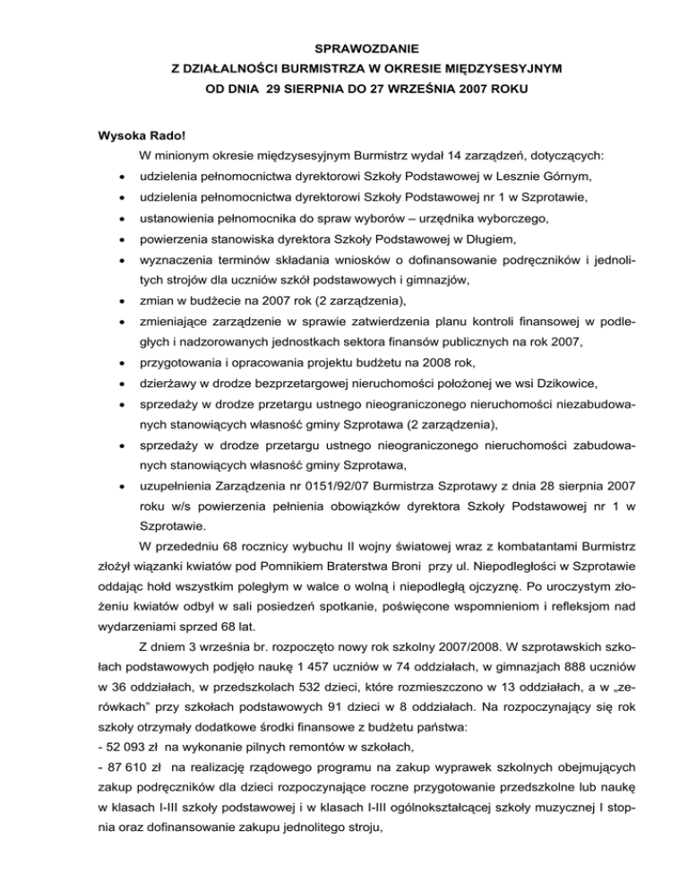 SPRAWOZDANIE Z DZIAŁALNOŚCI BURMISTRZA W OKRESIE MIĘDZYSESYJNYM OD DNIA 29 SIERPNIA DO 27 WRZEŚNIA 2007 ROKU Wysoka Rado! W minionym okresie międzysesyjnym Burmistrz wydał 14 zarządzeń, dotyczących: • udzielenia pełnomocnictwa dyrektorowi Szkoły Podstawowej w Lesznie Górnym, • udzielenia pełnomocnictwa dyrektorowi Szkoły Podstawowej nr 1 w Szprotawie, • ustanowienia pełnomocnika do spraw wyborów – urzędnika wyborczego, • powierzenia stanowiska dyrektora Szkoły Podstawowej w Długiem, • wyznaczenia terminów składania wniosków o dofinansowanie podręczników i jednolitych strojów dla uczniów szkół podstawowych i gimnazjów, • zmian w budżecie na 2007 rok (2 zarządzenia), • zmieniające zarządzenie w sprawie zatwierdzenia planu kontroli finansowej w podległych i nadzorowanych jednostkach sektora finansów publicznych na rok 2007, • przygotowania i opracowania projektu budżetu na 2008 rok, • dzierżawy w drodze bezprzetargowej nieruchomości położonej we wsi Dzikowice, • sprzedaży w drodze przetargu ustnego nieograniczonego nieruchomości niezabudowanych stanowiących własność gminy Szprotawa (2 zarządzenia), • sprzedaży w drodze przetargu ustnego nieograniczonego nieruchomości zabudowanych stanowiących własność gminy Szprotawa, • uzupełnienia Zarządzenia nr 0151/92/07 Burmistrza Szprotawy z dnia 28 sierpnia 2007 roku w/s powierzenia pełnienia obowiązków dyrektora Szkoły Podstawowej nr 1 w Szprotawie. W przededniu 68 rocznicy wybuchu II wojny światowej wraz z kombatantami Burmistrz złożył wiązanki kwiatów pod Pomnikiem Braterstwa Broni przy ul. Niepodległości w Szprotawie oddając hołd wszystkim poległym w walce o wolną i niepodległą ojczyznę. Po uroczystym złożeniu kwiatów odbył w sali posiedzeń spotkanie, poświęcone wspomnieniom i refleksjom nad wydarzeniami sprzed 68 lat. Z dniem 3 września br. rozpoczęto nowy rok szkolny 2007/2008. W szprotawskich szkołach podstawowych podjęło naukę 1 457 uczniów w 74 oddziałach, w gimnazjach 888 uczniów w 36 oddziałach, w przedszkolach 532 dzieci, które rozmieszczono w 13 oddziałach, a w „zerówkach” przy szkołach podstawowych 91 dzieci w 8 oddziałach. Na rozpoczynający się rok szkoły otrzymały dodatkowe środki finansowe z budżetu państwa: - 52 093 zł na wykonanie pilnych remontów w szkołach, - 87 610 zł na realizację rządowego programu na zakup wyprawek szkolnych obejmujących zakup podręczników dla dzieci rozpoczynające roczne przygotowanie przedszkolne lub naukę w klasach I-III szkoły podstawowej i w klasach I-III ogólnokształcącej szkoły muzycznej I stopnia oraz dofinansowanie zakupu jednolitego stroju, - 53 973zł - na realizację zadania „Przed Egzaminami”, z których sfinansuje się dodatkowe zajęcia wyrównawcze w VI klasach szkół podstawowych i w III klasach gimnazjalnych w wymiarze 4 godzin tygodniowo, - 56 510zł - na realizację szkolnych programów edukacyjnych. W związku ze skróceniem obecnej kadencji Sejmu RP Prezydent RP, postanowieniem z dnia 7 września br., zarządził wybory do Sejmu RP i do Senatu RP, które odbędą się 21 października br. Terminy wykonania czynności wyborczych są znacznie krótsze, niż ma to miejsce w przypadku wyborów po upływie czteroletniej kadencji. Gmina Szprotawa należy do okręgu wyborczego nr 8, zarówno w wyborach do Sejmu, jak i do Senatu, obejmującego swym zasięgiem obszar Województwa Lubuskiego, w którym wybieranych będzie 12 posłów i 3 senatorów. Powołany został czteroosobowy Zespół Wyborczy dla Gminy Szprotawy, którego zadaniem jest organizowanie sprawnego przebiegu prac związanych z przygotowaniem i przeprowadzeniem wyborów oraz techniczna obsługa obwodowych komisji wyborczych. W naszej gminie głosowanie przeprowadzone zostanie w jedenastu obwodach. Siedzibami OKW będą te same lokale co w ubiegłorocznych wyborach samorządowych. Obwieszczenia o podziale na obwody głosowania zostało podane do publicznej wiadomości w dniach 20 i 21 września br. Zgodnie z Ordynacją wyborczą składy obwodowych komisji wyborczych mogą liczyć od 7 do 11 osób, wśród których jedna jest wskazana przez burmistrza spośród pracowników samorządowych lub gminnych jednostek organizacyjnych. 21 września upłynął termin zgłaszania kandydatów na członków komisji. Kandydatury zgłosiło siedem komitetów wyborczych, po jednej osobie do każdej komisji. W naszej gminie składy obwodowych komisji wyborczych będą liczyły po 8 członków. W celu przygotowania beneficjentów do absorpcji środków pomocowych w ramach działania „Odnowa i rozwój wsi” Programu Rozwoju Obszarów Wiejskich na lata 2007-2013 Samorząd Województwa Lubuskiego pismem z dnia 5 września wystąpił do burmistrzów i wójtów z prośbą zgłoszenie miejscowości, w których będzie realizowane przedmiotowe działanie oraz podanie nazwisk koordynatorów. Odpowiadając na pismo Zarządu poinformowałem, że w pierwszym naborze nasza gmina planuje złożyć wnioski na wymienione działanie obejmujące dwie miejscowości: Leszno Górne i Dzikowice. Na koordynatora reprezentującego Urząd w zakresie przygotowania wniosku i obligatoryjnych załączników Burmistrz wskazał panią Barbarę Wierzbicką. Aktualnie po uzgodnieniach z sołtysami tych wsi trwają prace nad opracowaniem Planów Odnowy Miejscowości, które będą jednym z obligatoryjnych załączników do wniosku o przyznanie pomocy. Plany te będą również przedmiotem weryfikacji i konsultacji społecznej a następnie na zebraniach wiejskich podlegać będą przyjęciu w formie odrębnej uchwały. Burmistrz zaproponował, aby dalsze wyznaczanie miejscowości do opracowywania Planu Odnowy Miejscowości odbywało się sukcesywnie w miarę zbliżających się kolejnych terminów naboru wniosków aplikacyjnych na to działanie, jak również możliwości zapewnienia środków własnych gminy a także aktywności