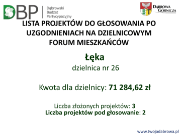 LISTA PROJEKTÓW DO GŁOSOWANIA PO UZGODNIENIACH NA DZIELNICOWYM FORUM MIESZKAŃCÓW Łęka dzielnica nr 26 Kwota dla dzielnicy: 71 284,62 zł Liczba złożonych projektów: 3 Liczba projektów pod głosowanie: 2 www.twojadabrowa.pl www.twojadabrowa.pl Podsumowanie weryfikacji i opiniowania wniosków 236 złożonych wniosków •96 wniosków zostało zakwalifikowanych jako możliwe do realizacji w założeniu wskazanym przez Wnioskodawcę •52 wnioski zostały uznane jako niemożliwe do wykonania w zaproponowanym kształcie •81 wnioski będą jeszcze rozpatrywane co do ich uściślenia albo modyfikacji •7 wniosków odpadło na etapie weryfikacji formalnej www.twojadabrowa.pl Autor: Artur Markot Tytuł: Spotkajmy się Lokalizacja: Teren przy Ochotniczej Straży Pożarnej w Łęce ul. Przelotowa 5 Koszt szacunkowy: 57 000,00 zł Opis: Projekt zakłada budowę zadaszenia nad placem do uroczystości okolicznościowych dla mieszkańców Łęki. Projekt zlokalizowany jest na terenie OSP Łęka www.twojadabrowa.pl Lokalizacja: Teren przy Ochotniczej Straży Pożarnej w Łęce ul. Przelotowa 5 www.twojadabrowa.pl Autor: Agnieszka Pietraszko, Małgorzata Patoleta Tytuł: Od juniora do seniora – doposażenie świetlicy i prowadzenie zajęć dla dzieci, młodzieży oraz seniorów z Łęki oraz doposażenie placu zabaw w Łęce Lokalizacja: Świetlica Środowiskowa ul. Przelotowa 185 A, plac zabaw przy ul. Przelotowej 125 Koszt szacunkowy: 70 979,00 Opis: Projekt zakłada doposażenie świetlicy środowiskowej w sprzęt nagłaśniający, konsolę wraz z grami, stół do tenisa stołowego wraz z wyposażeniem, sprzęt sportowy, nagrody rzeczowe, telewizor, meble, projektor multimedialny itp. Dodatkowo w ramach zadania prowadzone będą działania animacyjne tj. warsztaty szachowe, zajęcia z filcowania, decoupage oraz zajęcia fitness, zumba. Doposażenie placu zabaw polegać będzie na montażu zjeżdżalni z daszkiem oraz kiwaka. Dodatkowo uzupełniony zostanie żywopłot, ogrodzenie oraz przygotowana zostanie dokumentacja techniczna www.twojadabrowa.pl Lokalizacja: Od juniora do seniora – doposażenie świetlicy i prowadzenie zajęć dla dzieci, młodzieży oraz seniorów z Łęki oraz doposażenie placu zabaw w Łęce www.twojadabrowa.pl Biuro Organizacji Pozarządowych i Aktywności Obywatelskiej Urząd Miejski w Dąbrowie Górniczej ul. Graniczna 21, tel. 32 295 67 41, 32 295 96 38 [email protected] www.twojadabrowa.pl