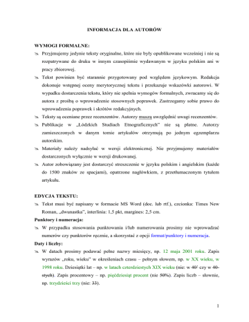 INFORMACJA DLA AUTORÓW WYMOGI FORMALNE: Przyjmujemy jedynie teksty oryginalne, które nie były opublikowane wcześniej i nie są rozpatrywane do druku w innym czasopiśmie wydawanym w języku polskim ani w pracy zbiorowej. Tekst powinien być starannie przygotowany pod względem językowym. Redakcja dokonuje wstępnej oceny merytorycznej tekstu i przekazuje wskazówki autorowi. W wypadku dostarczenia tekstu, który nie spełnia wymogów formalnych, zwracamy się do autora z prośbą o wprowadzenie stosownych poprawek. Zastrzegamy sobie prawo do wprowadzenia poprawek i skrótów redakcyjnych. Teksty są oceniane przez recenzentów. Autorzy muszą uwzględnić uwagi recenzentów. Publikacje w „Łódzkich Studiach Etnograficznych” nie są płatne. Autorzy zamieszczonych w danym tomie artykułów otrzymują po jednym egzemplarzu autorskim. Materiały należy nadsyłać w wersji elektronicznej. Nie przyjmujemy materiałów dostarczonych wyłącznie w wersji drukowanej. Autor zobowiązany jest dostarczyć streszczenie w języku polskim i angielskim (każde do 1500 znaków ze spacjami), opatrzone nagłówkiem, z przetłumaczonym tytułem artykułu. EDYCJA TEKSTU: Tekst musi być napisany w formacie MS Word (doc. lub rtf.), czcionka: Times New Roman, „dwunastka”, interlinia: 1,5 pkt, margines: 2,5 cm. Punktory i numeracja: W przypadku stosowania punktowania i/lub numerowania prosimy nie wprowadzać numerów czy punktorów ręcznie, a skorzystać z opcji format/punktory i numeracja. Daty i liczby: W datach prosimy podawać pełne nazwy miesięcy, np. 12 maja 2001 roku. Zapis wyrazów „roku, wieku” w określeniach czasu – pełnym słowem, np. w XX wieku, w 1998 roku. Dziesiątki lat – np. w latach czterdziestych XIX wieku (nie: w 40’ czy w 40stych). Zapis procentowy – np. pięćdziesiąt procent (nie 50%). Zapis liczb – słownie, np. trzydzieści trzy (nie: 33). 1 Cudzysłowy, cytaty: Tytuły książek, utworów poetyckich, artykułów, filmów, audycji telewizyjnych i radiowych należy pisać kursywą, np. Tożsamość narodowa, kultura popularna i życie codzienne. Tytuły gazet i czasopism pisane w cudzysłowie, krojem prostym, np. „Lud”. W przypadku wstawiania do cytatu uwagi odautorskiej prosimy umieścić ją w nawiasie kwadratowym: „Kultura estetyczna jest jednak [a może przede wszystkim – przyp. A.K.] kulturą granic” [Bachtin 1986: 270]. W przypadku zaznaczania w cytatach fragmentu tekstu prosimy stosować następujący zapis: „Z jakże wielką radością stwierdziłam, że sami pragniecie, aby wszystko w tej książce było prawdziwe [podkreśl. M.M.]” [Zawistowicz-Adamska 1958: 29]. Fotografie, ilustracje: Fotografie (ilustracje) należy załączyć w oddzielnym pliku, a w tekście jedynie zaznaczyć przeznaczone dla nich miejsce. Przypisy i bibliografia: W tekście odniesienia do literatury należy podawać w nawiasach kwadratowych w następujący sposób: [nazwisko autora, rok wydania, strona/strony] [Edensor 2004: 35–54] Bibliografię należy załączać na końcu tekstu w porządku alfabetycznym na oddzielnych stronach według następujących zasad: dla książki nazwisko autora, imię, rok wydania, tytuł, miejsce wydania, wydawnictwo. W przypadku tekstów tłumaczonych należy podać inicjał imienia i nazwisko tłumacza Edensor Tim 2004: Tożsamość narodowa, kultura popularna i życie codzienne. Przekł. A. Sadza. Kraków: Wydawnictwo Uniwersytetu Jagiellońskiego. Edensor Tim 2002: National Identity, Popular Culture and Everyday Life. Oxford – New York: Berg. dla tekstu zamieszczonego w pracy zbiorowej nazwisko autora, imię, rok wydania, tytuł tekstu, tytuł zbiorowej publikacji, inicjał imienia i nazwisko redaktora (redaktorów), miejsce wydania, strony 2 Burszta Wojciech Józef 2003: Zaproszenie do lektury. [W:] Ekran, mit, rzeczywistość. Red. W.J. Burszta. Warszawa, s. 5–9. Booth William 1986: Freedom of Interpretation: Bakhtin and the Challenge of Feminist Criticism. [In:] Bakhtin: Essays and Dialogues on His Work. Ed. G.S. Morson. Chicago, pp. 145–176. Edwards Elizabeth 1997: Beyond the Boundary: A Consideration of the Expressive in Photography and Anthropology. [In:] Rethinking Visual Anthropology. Eds. M. Banks, H. Morphy. New Haven – London, pp. 53–80. dla artykułu w czasopiśmie nazwisko autora, imię, rok wydania, tytuł artykułu, tytuł czasopisma, numer/tom, strony Kula Marcin 2001: Pamiętliwe instytucje, ruchy i systemy polityczne. Rzut oka historyka. „Kultura i Społeczeństwo”, nr 3–4, s. 105–121. Shils Edward 1971: Tradition. “Comparative Studies in Society and History”, vol. 13, no. 2, pp. 122–159. Materiały z Internetu, jeśli są to teksty autorskie, należy umieszczać w bibliografii alfabetycznie, podając oprócz nazwiska autora i tytułu, datę i źródło internetowe. Natomiast w wypadku korzystania ze stron internetowych, a nie autorskich publikacji, należy podawać nazwę domeny i adres na końcu bibliografii (wraz z datą ostatniego dostępu), np. Mika Janina 2006: Dzieje jednego albumu, czyli wielcy ludzie i historia w życiu małej galicyjskiej wioski – Zaborowa oraz jej mieszkańców. www.brzesko.ws/brzesko/documents/historia/zaborow/jmdja.htm [dostęp marzec 2010]. Prosimy także o: Wstawienie numerów stron. 3 Przeszukanie tekstu i usunięcie podwójnych spacji (najlepiej skorzystać z opcji znajdź i zamień, w polu znajdź wpisać dwie spacje, a w polu zamień jedną, po czym przeszukać cały tekst). Zwrócenie uwagi na różnicę między myślnikiem i łącznikiem (znak ”-” stosujemy m.in. przy łączonej pisowni nazwisk, np. Kopczyńska-Jaworska; znak ”–” stosowany jest jako znak interpunkcyjny, np. Postawione zostały pytania o kapitalnym znaczeniu dla naszej profesji – jakiego rodzaju wiedza, jakie umiejętności, jakie cechy osobowościowe potrzebne są antropologowi?). Zapisywanie wyrazów obcojęzycznych kursywą, np. nota bene. Podawanie pełnego 