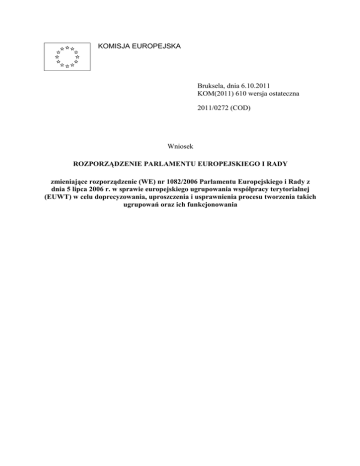 KOMISJA EUROPEJSKA Bruksela, dnia 6.10.2011 KOM(2011) 610 wersja ostateczna 2011/0272 (COD) Wniosek ROZPORZĄDZENIE PARLAMENTU EUROPEJSKIEGO I RADY zmieniające rozporządzenie (WE) nr 1082/2006 Parlamentu Europejskiego i Rady z dnia 5 lipca 2006 r. w sprawie europejskiego ugrupowania współpracy terytorialnej (EUWT) w celu doprecyzowania, uproszczenia i usprawnienia procesu tworzenia takich ugrupowań oraz ich funkcjonowania UZASADNIENIE 1. KONTEKST WNIOSKU Komisja składa niniejszy wniosek, wypełniając drugą część obowiązku określonego w art. 17 rozporządzenia (WE) nr 1082/2006. Dnia 29 lipca 2011 r. Komisja przekazała sprawozdanie na temat stosowania rozporządzenia1. Sprawozdanie wskazuje obszary, które moŜna poprawić, natomiast niniejszy projekt rozporządzenia zmieniającego obejmuje konkretne zmiany wprowadzające te ulepszenia. Istotę tych zmian moŜna ująć w trzech słowach: ciągłość, przejrzystość, elastyczność. – Ciągłość: gdyŜ zasadniczy charakter EUWT nie ulegnie zmianie, a istniejące EUWT nie będą musiały zmieniać swoich statutów ani sposobu działania; – Przejrzystość: poniewaŜ niniejsze rozporządzenie będzie zmienione w celu a) uwzględnienia traktatu lizbońskiego, b) uproszczenia i doprecyzowania niektórych aspektów, które okazały się niejasne, oraz c) zapewnienia większej widoczności i lepszej komunikacji w zakresie tworzenia i funkcjonowania EUWT; – Elastyczność: poprzez otwarcie EUWT na wszelkie aspekty współpracy terytorialnej (a nie „przede wszystkim” na zarządzanie programami i projektami finansowanymi przez EFRR) oraz zapewnienie podstaw prawnych dla uczestnictwa władz i regionów z państw trzecich w charakterze członka. 2. WYNIKI KONSULTACJI Z ZAINTERESOWANYMI STRONAMI Niniejsze rozporządzenie opiera się na szerokich konsultacjach z zainteresowanymi stronami, w tym z państwami członkowskimi, regionami oraz z członkami istniejących i planowanych EUWT. Szczególnie cennym partnerem okazał się Komitet Regionów, który prowadzi „platformę” wymiany informacji na temat EUWT2. Do konkretnych zdarzeń, które wniosły wkład do sprawozdania i treści niniejszego wniosku, naleŜą: szeroko zakrojone konsultacje ze wszystkimi zainteresowanymi stronami, prowadzone we współpracy z Komitetem Regionów, w sprawie funkcjonowania i wartości dodanej instrumentu EUWT3, Europejska konferencja na temat europejskich ugrupowań współpracy terytorialnej (EUWT) z 27–28 stycznia 2011 r., Konferencja na temat EUWT oraz sprawowania rządów na wielu poziomach, zorganizowana przez prezydencję węgierską w dniach 21–23 marca 2011 r. oraz szereg spotkań z komitetami i grupami Parlamentu Europejskiego, z których ostatnie odbyło się w dniu 22 czerwca 2011 r. 1 2 3 PL Sprawozdanie Komisji dla Parlamentu Europejskiego i Rady: Stosowanie rozporządzenia (WE) nr 1082/2006 w sprawie europejskiego ugrupowania współpracy terytorialnej (EUWT), COM(2011)462 wersja ostateczna, 29.7.2011. http://portal.cor.europa.eu/egtc/en-US/Pages/welcome.aspx Wyniki opublikowano we wnioskach Komitetu Regionów ze wspólnych konsultacji – Przegląd rozporządzenia (WE) nr 1082/2006 w sprawie europejskiego ugrupowania współpracy terytorialnej (EUWT), Komitet Regionów, 2010 („The review of regulation (EC) 1082/2006 on the European Grouping of Territorial Cooperation, Committee of the Regions, 2010”), http://www.cor.europa.eu/COR_cms/ui/ViewDocument.aspx?contentid=366960dd-3c03-4efa-9230665455fa6bb5 2 PL Wszyscy zainteresowani, w szczególności działające EUWT i ugrupowania będące w procesie tworzenia, stwierdziły, Ŝe instrument ten jest niewątpliwie przydatny i ma potencjał wykraczający poza przypisane mu zadania, lecz procedury związane z funkcjonowaniem, w szczególności tworzeniem EUWT, są zbyt złoŜone i obarczone nadmierną niepewnością. W opinii przyjętej w styczniu 2011 r.4 Komitet Regionów sugeruje, Ŝe w celu zachęcenia do korzystania z EUWT moŜna by stosować finansowe i innego rodzaju bodźce, za czym opowiedziały się działające ugrupowania, natomiast Komisja jest zdania, Ŝe korzystanie z EUWT powinno być wolnym i nieskrępowanym wyborem zainteresowanych stron, bez innych zachęt niŜ wynikające z uŜyteczności samego instrumentu. 3. ASPEKTY PRAWNE WNIOSKU Artykuł 175 Traktatu o funkcjonowaniu Unii Europejskiej (TFUE) wzywa Radę do przyjęcia szczególnych działań, które mogą okazać się konieczne do wspierania spójności gospodarczej, społecznej i terytorialnej. Artykuły 209 i 212 umoŜliwiają Parlamentowi Europejskiemu i Radzie przyjęcie środków pozwalających na współpracę z państwami trzecimi, w tym współpracę na rzecz rozwoju. 4. WPŁYW NA BUDśET Rozporządzenie w sprawie EUWT nie ma charakteru finansowego i nie pociąga za sobą Ŝadnych konsekwencji finansowych dla budŜetu Unii lub państw członkowskich. EUWT mogą być finansowane ze środków lokalnych, regionalnych bądź krajowych, a takŜe mogą prowadzić działania współfinansowane z funduszy europejskich. 5. STRESZCZENIE TREŚCI ROZPORZĄDZENIA Niniejsze rozporządzenie zmieniające wprowadza zmiany mające na celu, z jednej strony, dostosowanie do terminologii wprowadzonej Traktatem o funkcjonowaniu Unii Europejskiej, a z drugiej strony usunięcie słabości i wprowadzenie usprawnień wskazanych w sprawozdaniu, o którym mowa powyŜej. Zmiany te dotyczą członkostwa, treści konwencji i statutu EUWT, jego celu, procesu zatwierdzania przez władze krajowe, prawa właściwego w zakresie zatrudnienia i udzielania zamówień, EUWT, których członkowie mają róŜne zakresy odpowiedzialności za swoje działania, oraz bardziej przejrzystych procedur w zakresie komunikacji. W kwestii członkostwa wprowadza się nowe podstawy prawne, pozwalające regionom i władzom w państwach trzecich na członkostwo w EUWT, niezaleŜnie od tego, czy pozostali członkowie pochodzą z jednego lub wielu pań
