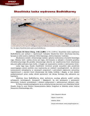 SPRZĘT TRENINGOWY Shaolińska laska wędrowna Bodhidharmy Fot. Na zdjęciu Shaolińska laska wędrowna Bodhidharmy Shàolín Zhī Dámó Zhàng; 少林之达摩杖 (少林之達摩杖). Shaolińska laska wędrowna Bodhidharmy jest jednym z najstarszych rodzajów klasztornej broni obuchowo-siecznej, łączącej w sobie walory użytkowe młota bojowego, siekiery bojowej i nadziaka. Zbudowana została z drewnianego styliska i głowicy wykonanej w kształcie bawolego rogu. Głowica laski z jednej strony jest tępa, uformowana w rękojeść o kształcie grzybka, charakterystycznego dla grzybka stosowanego obecnie we współczesnej broni obuchowej jaką jest pałka policyjna typu tonfa, z drugiej zaś wyposażona została w zakrzywiony kolec. Laska tego typu służyła shaolińskim mnichom przede wszystkim jako przedmiot wspomagający piesze podróże oraz wspinaczkę po szlakach wysokogórskich. Jej obronne zastosowanie odnajdujemy w sytuacjach związanych z potrzebami odpierania zamachów napastniczych z użyciem broni drzewcowej lub białej, krótkiej i długiej, w tym działań podejmowanych przez osoby okryte pancerzem lub zbroją tłumiącą siłę uderzenia czy kopnięcia. Właściwe lasce Bodhidharmy akcje techniczne oscylują głównie wokół ruchów pchających, omiatających, tłuczących i dźgających. Są one powiązane z postawami obronnymi, krokami, przeskokami i skokami połączonymi z jednoczesnym obrotem ciała. W Polsce metody posługiwania się tą unikalną bronią nauczane są w Gdyńskiej Szkole Shaolin Kung Fu oraz Polskim Stowarzyszeniu Boksu Yongchun w Gdańsku przez mistrza Sławomira Pawłowskiego sifu. Tekst: Sławomir Oleszek Zdjęcie: Leszek Hus Gdańsk; 2016r. Strona internetowa: www.yongchunquan.eu