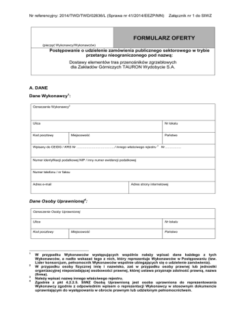 Załącznik nr 1 do SIWZ Nr referencyjny: 2014/TWD/TWD/02636/L (Sprawa nr 41/2014/EEZP/MN) FORMULARZ OFERTY (pieczęć Wykonawcy/Wykonawców) Postępowanie o udzielenie zamówienia publicznego sektorowego w trybie przetargu nieograniczonego pod nazwą: Dostawy elementów tras przenośników zgrzebłowych dla Zakładów Górniczych TAURON Wydobycie S.A. A. DANE Dane Wykonawcy1: Oznaczenie Wykonawcy2 Ulica Kod pocztowy Nr lokalu Miejscowość Państwo Wpisany do CEIDG / KRS Nr ……………………………../ innego właściwego rejestru 3 Nr…………… Numer identyfikacji podatkowej NIP / inny numer ewidencji podatkowej Numer telefonu / nr faksu Adres e-mail Adres strony internetowej Dane Osoby Uprawnionej4: Oznaczenie Osoby Uprawnionej Ulica Kod pocztowy 1 2 3 4 Nr lokalu Miejscowość Państwo W przypadku Wykonawców występujących wspólnie należy wpisać dane każdego z tych Wykonawców, a nadto wskazać tego z nich, który reprezentuje Wykonawców w Postępowaniu (tzw. Lider konsorcjum, pełnomocnik Wykonawców wspólnie ubiegających się o udzielenie zamówienia). W przypadku osoby fizycznej imię i nazwisko, zaś w przypadku osoby prawnej lub jednostki organizacyjnej nieposiadającej osobowości prawnej, której ustawa przyznaje zdolność prawną, nazwa (firma). Należy wpisać nazwę innego właściwego rejestru. Zgodnie z pkt 4.2.2.5. SIWZ Osobą Uprawnioną jest osoba uprawniona do reprezentowania Wykonawcy zgodnie z odpowiednim wpisem o reprezentacji Wykonawcy w stosownym dokumencie uprawniającym do występowania w obrocie prawnym lub udzielonym pełnomocnictwem. Nr referencyjny: 2014/TWD/TWD/02636/L (Sprawa nr 41/2014/EEZP/MN) Załącznik nr 1 do SIWZ Numer telefonu / nr faksu Adres e-mail Adres strony internetowej Adres do korespondencji: Ulica Kod pocztowy Nr lokalu Miejscowość Państwo Dane użytkownika uprawnionego do udziału ze strony Wykonawcy w aukcji elektronicznej5: Imię Nazwisko e-mail Numer telefonu Dodatkowe dane PESEL lub NIP niezbędny do weryfikacji podpisu elektronicznego B. PARAMETRY OFERTY STANOWIĄCE KRYTERIA OCENY OFERT Nawiązując do ogłoszenia o zamówieniu publicznym mającym charakter zamówienia sektorowego, prowadzonym w trybie przetargu nieograniczonego na realizację zamówienia pod nazwą „Dostawy elementów tras przenośników zgrzebłowych dla Zakładów Górniczych TAURON Wydobycie S.A.” oznaczonego numerem referencyjnym: 2014/TWD/TWD/02636/L (Sprawa nr 41/2014/EEZP/MN) dla TAURON Wydobycie S.A. w Jaworznie i dopuszczeniem przez Zamawiającego możliwości składania Ofert częściowych. 1. 5 Oświadczamy, że składamy ofertę na następujące części Przedmiotu Zamówienia: 1.1. Część nr 1 ……………………………………… 1.2. Część nr 2 ……………………………………… 1.3. Część nr 3 ……………………………………… 1.4. Część nr 4 ……………………………………… Dane powinny być zgodne z danymi umieszczonymi w podpisie elektronicznym. Nr referencyjny: 2014/TWD/TWD/02636/L (Sprawa nr 41/2014/EEZP/MN) Załącznik nr 1 do SIWZ W ramach oferty dotyczącej Części nr 1: ………………………………………. zamówienie zostanie przez nas wykonane za Cenę brutto: ……..………………………..PLN (słownie: ……………………………………) Na Cenę brutto składa się: Cena netto w wysokości: ………………………..…..PLN (słownie: …………………….) Kwota podatku VAT w wysokości ……………..…..PLN (słownie: ……………………) wyliczona zgodnie z aktualnie obowiązującymi przepisami prawa, według obowiązującej stawki 23 %. W ramach oferty dotyczącej Części nr 2: ………………………………………. zamówienie zostanie przez nas wykonane za Cenę brutto: ……..………………………..PLN (słownie: ……………………………………) Na Cenę brutto składa się: Cena netto w wysokości: ………………………..…..PLN (słownie: …………………….) Kwota podatku VAT w wysokości ……………..…..PLN (słownie: ……………………) wyliczona zgodnie z aktualnie obowiązującymi przepisami prawa, według obowiązującej stawki 23 %. W ramach oferty dotyczącej Części nr 3: ………………………………………. zamówienie zostanie przez nas wykonane za Cenę brutto: ……..………………………..PLN (słownie: ……………………………………) Na Cenę brutto składa się: Cena netto w wysokości: ………………………..…..PLN (słownie: …………………….) Kwota podatku VAT w wysokości ……………..…..PLN (słownie: ……………………) wyliczona zgodnie z aktualnie obowiązującymi przepisami prawa, według obowiązującej stawki 23 %. W ramach oferty dotyczącej Części nr 4: ………………………………………. zamówienie zostanie przez nas wykonane za Cenę brutto: ……..………………………..PLN (słownie: ……………………………………) Na Cenę brutto składa się: Cena netto w wysokości: ………………………..…..PLN (słownie: …………………….) Kwota podatku VAT w wysokości ……………..…..PLN (słownie: ……………………) wyliczona zgodnie z aktualnie obowiązującej stawki 23 %. obowiązującymi przepisami prawa, według Nr referencyjny: 2014/TWD/TWD/02636/L (Sprawa nr 41/2014/EEZP/MN) C. Załącznik nr 1 do SIWZ OŚWIADCZENIA I ZAPEWNIENIA WYKONAWCY 1. Podana przez nas Cena zawiera wszelkie koszty niezbędne do zrealizowania zamówienia wynikające z zakresów i warunków określonych w SIWZ. 2. Oświadczamy, że niedoszacowanie, pominięcie lub brak należytego rozpoznania przez nas zakresu Przedmiotu Zamówienia nie jest podstawą do żądania zmiany wysokości wynagrodzenia. 3. Oświadczamy, że jesteśmy zdolni do wykonania Przedmiotu Zamówienia zgodnie z wymaganiami podanymi w SIWZ. 4. Oświadczamy, że prz