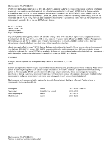 Obwieszczenie RIK.6733.21.2016 Wójt Gminy Łańcut zawiadamia że w dniu 30.12.2016r. została wydana decyzja odmawiająca ustalenia lokalizacji inwestycji celu publicznego dla inwestycji pn. „Stacja bazowa telefonii cyfrowej" 52738 Kosina. Budowa wieży stalowej kratowej H=52m z trzema antenami sektorowymi typu Kathrein 80010647v01 o mocy EIRP 9502W na wysokości środka elektrycznego anteny 51,5m n.p.t., jedną anteną radiolinii o średnicy 0,6m i mocy 19953W na wysokości 51,Om n.p.t. ramy stalowej pod urządzenia techniczne i ogrodzenia z siatki stalowej na fundamentach betonowych na części dz. nr ew. gr. 2155/2 w m. Kosina RIK. 6733.21.2016 Łańcut, 2016-12-30 OBWIESZCZENIE Wójta Gminy Łańcut Wójt Gminy Łańcut działając na postawie art. 53 ust.1 ustawy z dnia 27 marca 2003r. o planowaniu i zagospodarowaniu przestrzennym /j.t. Dz. U., z 2016r., poz. 778 ze zm./ oraz art. 49 ustawy z dnia 14 czerwca 1960 r. Kodeksu Postępowania Administracyjnego /j.t. Dz. U. z 2016r., poz. 23 ze zm./ zawiadamia że w dniu 30.12.2016r. została wydana decyzja odmawiająca ustalenia lokalizacji inwestycji celu publicznego dla inwestycji pn. „Stacja bazowa telefonii cyfrowej" 52738 Kosina. Budowa wieży stalowej kratowej H=52m z trzema antenami sektorowymi typu Kathrein 80010647v01 o mocy EIRP 9502W na wysokości środka elektrycznego anteny 51,5m n.p.t., jedną anteną radiolinii o średnicy 0,6m i mocy 19953W na wysokości 51,Om n.p.t. ramy stalowej pod urządzenia techniczne i ogrodzenia z siatki stalowej na fundamentach betonowych na części dz. nr ew. gr. 2155/2 w m. Kosina. POUCZENIE Z decyzją można zapoznać się w Urzędzie Gminy Łańcut ul. Mickiewicza 2a, 37-100 Łańcut. Stronom postępowania, którym decyzja bezpośrednio nie została doręczona, przysługuje odwołanie od decyzji Wójta Gminy Łańcut do Samorządowego Kolegium Odwoławczego w Rzeszowie. Odwołanie składa się za pośrednictwem Wójta Gminy Łańcut ul. Mickiewicza2a, 37-100 Łańcut w terminie 14 dni po upływie czternastu dni od publicznego obwieszczenia. Odwołanie od decyzji o ustaleniu lokalizacji inwestycji powinno zawierać zarzuty odnoszące się do decyzji, określać istotę i zakres żądania będącego przedmiotem odwołania oraz wskazywać dowody uzasadniające to żądanie), Obwieszczenie umieszczono na tablicy ogłoszeń w Urzędzie Gminy Łańcut, Biuletynie Informacji Publicznej oraz w miejscowości Kosina na okres 14 dni. Udostępnił: Admin 2017-01-09 15:58:26 Wytworzył: Urząd Gminy Łańcut 2016-12-30 Data wygaśnięcia: Admin 2017-01-24 Modyfikował: Admin 2017-01-11 Obwieszczenie RIK.6733.21.2016 Pobrane ze strony www.bip.gminalancut.pl