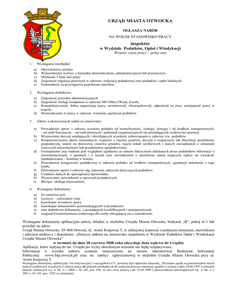 URZĄD MIASTA OTWOCKA OGŁASZA NABÓR NA WOLNE STANOWISKO PRACY inspektor w Wydziale Podatków, Opłat i Windykacji Wymiar czasu pracy – pełny etat 1. Wymagania niezbędne: a) b) c) d) e) 2. Obywatelstwo polskie Wykształcenie wyŜsze o kierunku ekonomicznym, administracyjnym lub prawniczym Minimum 3 letni staŜ pracy Znajomość regulacji prawnych w zakresie: ordynacji podatkowej oraz podatków i opłat lokalnych Niekaralność za przestępstwa popełnione umyślnie. Wymagania dodatkowe: a) b) c) d) 3. Znajomość procedur administracyjnych Znajomość obsługi komputera w zakresie MS Office (Word, Excel), Komunikatywność, dobra organizacja pracy, terminowość, obowiązkowość, odporność na stres, umiejętność pracy w zespole, Doświadczenie w pracy w zakresie wymiaru, egzekucji podatków. Zakres wykonywanych zadań na stanowisku: a) b) c) d) e) f) g) h) i) 4. Prowadzenie spraw z zakresu wymiaru podatku od nieruchomości, rolnego, leśnego i od środków transportowych: - od osób fizycznych; - od osób prawnych i jednostek organizacyjnych nie posiadających osobowości prawnej. Wystawianie decyzji ustalających i określających wysokość zobowiązania w zakresie ww. podatków. Rozpracowywanie aktów notarialnych, wypisów z rejestru gruntów, decyzji o rozpoczęciu lub likwidacji działalności gospodarczej, umów na dzierŜawę czasową gruntów, najem lokali uŜytkowych i innych zawiadomień o zmianach właścicieli nieruchomości lub przedmiotów opodatkowania. Gromadzenie oraz badanie pod względem zgodności ze stanem faktycznym składanych przez podatników informacji o nieruchomościach, o gruntach i o lasach oraz zawiadomień o zaistnieniu zmian mających wpływ na wysokość opodatkowania – kontrola w terenie. Prowadzenie księgowości podatkowej w zakresie podatku od środków transportowych, egzekucja naleŜności z tego tytułu. Prowadzenie spraw z zakresie ulg, umorzeń, odroczeń dotyczących podatków. Ustalanie danych do sporządzania sprawozdań. Wystawianie zaświadczeń w sprawach podatkowych. BieŜąca obsługa interesantów. Wymagane dokumenty: a) b) c) d) e) f) list motywacyjny Ŝyciorys – curriculum vitae kserokopie świadectw pracy kserokopie dokumentów potwierdzających wykształcenie inne dodatkowe dokumenty, o posiadanych kwalifikacjach i umiejętnościach oryginał kwestionariusza osobowego dla osoby ubiegającej się o zatrudnienie. Wymagane dokumenty aplikacyjne naleŜy składać w siedzibie Urzędu Miasta Otwocka, budynek „B”, pokój nr 1 lub przesłać na adres: Urząd Miasta Otwocka 05-400 Otwock, ul. Armii Krajowej 5; w zaklejonej kopercie z podanym imieniem, nazwiskiem i adresem nadawcy i dopiskiem: „Dotyczy naboru na stanowisko inspektora w Wydziale Podatków Opłat i Windykacji Urzędu Miasta Otwocka” w terminie do dnia 20 czerwca 2008 roku (decyduje data wpływu do Urzędu) Aplikacje, które wpłyną do tut. Urzędu po wyŜej określonym terminie nie będą rozpatrywane. Informacja o wyniku naboru zostanie umieszczona na stronie internetowej Biuletynu Informacji Publicznej /www.bip.otwock.pl/ oraz na tablicy ogłoszeniowej w siedzibie Urzędu Miasta Otwocka przy ul. Armii Krajowej 5. Wymagane dokumenty aplikacyjne: list motywacyjny i szczegółowe CV, powinny być opatrzone klauzulą: „WyraŜam zgodę na przetwarzanie moich danych osobowych zawartych w ofercie pracy dla potrzeb niezbędnych do realizacji procesu rekrutacji zgodnie z ustawą z dnia 29.08.1997 o ochronie danych osobowych (t.j. w Dz .U z 2002 r. Nr 101, poz. 926, ze zm.) oraz ustawą z dn. 22.03.1990 o pracownikach samorządowych (tj. w Dz. U z 2001 r. Nr 142, poz. 1593 ze zmianami)