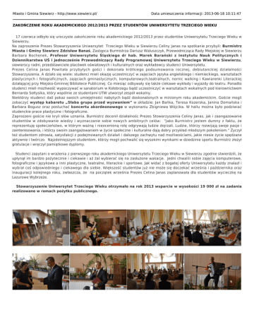 Miasto i Gmina Siewierz - http://www.siewierz.pl/ Data umieszczenia informacji: 2013-06-18 10:11:47 ZAKOŃCZENIE ROKU AKADEMICKIEGO 2012/2013 PRZEZ STUDENTÓW UNIWERSYTETU TRZECIEGO WIEKU 17 czerwca odbyło się uroczyste zakończenie roku akademickiego 2012/2013 przez studentów Uniwersytetu Trzeciego Wieku w Siewierzu. Na zaproszenie Prezes Stowarzyszenia Uniwersytet Trzeciego Wieku w Siewierzu Celiny Janas na spotkanie przybyli: Burmistrz Miasta i Gminy Siewierz Zdzisław Banaś, Zastępca Burmistrza Dariusz Waluszczyk, Przewodnicząca Rady Miejskiej w Siewierzu Barbara Bochenek, Profesor Uniwersytetu Śląskiego dr hab. Marek Barański z Instytutu Nauk Politycznych i Dziennikarstwa UŚ i jednocześnie Przewodniczący Rady Programowej Uniwersytetu Trzeciego Wieku w Siewierzu, siewierscy radni, przedstawiciele placówek oświatowych i kulturalnych oraz wykładowcy studenci Uniwersytetu. Prezes Celina Janas Powitała przybyłych gości i dokonała krótkiego podsumowania rocznej, debiutanckiej działalności Stowarzyszenia. A działo się wiele: studenci mieli okazję uczestniczyć w zajęciach języka angielskiego i niemieckiego, warsztatach plastycznych i fotograficznych, zajęciach gminastycznych, komputerowych,teatralnych, nornic walking i Kawiarenki Literackiej działającej przy Miejsko-Gminnej Bibliotece Publicznej. Co miesiąc odbywały się także ciekawe wykłady i wyjazdy do teatru. Ponadto studenci mieli możliwość wypoczywać w sanatorium w Kołobrzegu bądź uczestniczyć w warsztatach wokalnych pod kierownictwem Bernarda Sołtysika, który wspólnie ze studentami UTW utworzył zespół wokalny. Niektórzy studenci dali pokaz swoich umiejętności nabytych bądź doskonalonych w minionym roku akademickim. Goście mogli zobaczyć występ kabaretu „Słaba grupa przed wyzwaniem” w składzie: Jan Bańka, Teresa Kozerska, Janina Domańska i Barbara Bogusz oraz posłuchać koncertu akordeonowego w wykonaniu Zbigniewa Wójcika. W hallu można było podziwiać studenckie prace plastyczne i fotograficzne. Zaproszeni goście nie kryli słów uznania. Burmistrz docenił działalnośc Prezes Stowarzyszenia Celiny Janas, jak i zaangazowanie studentów w zdobywanie wiedzy i wyznaczanie sobie nowych ambitnych celów: "Jako Burmistrz jestem dumny z faktu, że reprezentuję społeczeństwo, w którym ważną i nieocenioną rolę odgrywają ludzie dojrzali. Ludzie, którzy rozwijają swoje pasje i zainteresowania, i którzy swoim zaangażowaniem w życie społeczne i kulturalne dają dobry przykład młodszym pokoleniom." Życzył też studentom zdrowia, satysfakcji z podejmowanych działań i dalszego zachwytu nad możliwościami, jakie niesie życie spędzane aktywnie i twórczo. Najzdolniejszym studentom, którzy mogli pochwalić się wysokimi wynikami w dziedzinie sportu Burmistrz złożył gratulacje i wręczył pamiątkowe dyplomy. Studenci zapytani o wrażenia z pierwszego roku akademickiego Uniwersytetu Trzeciego Wieku w Siewierzu zgodnie stwierdzili, że upłynął im bardzo pożytecznie i ciekawie i aż żal wybierać się na zasłużone wakacje. Jedni chwalili sobie zajęcia komputerowe, fotograficzne i językowe a inni plastyczne, teatralne, literackie i sportowe. Jak widać z bogatej oferty Uniwersytetu każdy znalazł i wybrał coś odpowiedniego i ciekawego dla siebie. Większość studentów już nie może się doczekać września i października oraz inauguracji kolejnego roku, zwłaszcza, że na początek września Prezes Celina Janas zaplanowała dla studentów wycieczkę na Lazurowe Wybrzeże. Stowarzyszenie Uniwersytet Trzeciego Wieku otrzymało na rok 2013 wsparcie w wysokości 19 000 zł na zadania realizowane w ramach pożytku publicznego. Urząd Miasta i Gminy Siewierz, 42-470 Siewierz, ul. Żwirki i WIgury 16, tel. 32 64 99 400, e-mail: [email protected] Burmistrz Miasta i Gminy Siewierz mgr Zdzisław Banaś