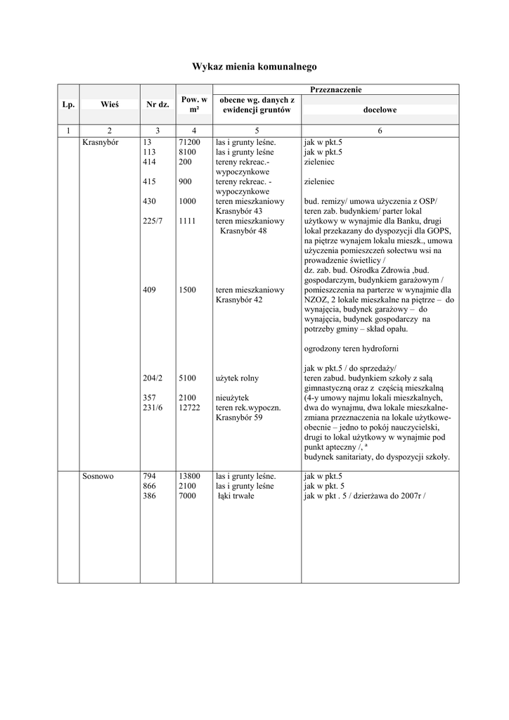 Wykaz mienia komunalnego Przeznaczenie Lp. 1 Wieś 2 Krasnybór Nr dz. Pow. w m² 3 13 113 414 4 71200 8100 200 415 900 430 1000 225/7 1111 409 1500 obecne wg. danych z ewidencji gruntów 5 las i grunty leśne. las i grunty leśne tereny rekreac.wypoczynkowe tereny rekreac. wypoczynkowe teren mieszkaniowy Krasnybór 43 teren mieszkaniowy Krasnybór 48 teren mieszkaniowy Krasnybór 42 docelowe 6 jak w pkt.5 jak w pkt.5 zieleniec zieleniec bud. remizy/ umowa uŜyczenia z OSP/ teren zab. budynkiem/ parter lokal uŜytkowy w wynajmie dla Banku, drugi lokal przekazany do dyspozycji dla GOPS, na piętrze wynajem lokalu mieszk., umowa uŜyczenia pomieszczeń sołectwu wsi na prowadzenie świetlicy / dz. zab. bud. Ośrodka Zdrowia ,bud. gospodarczym, budynkiem garaŜowym / pomieszczenia na parterze w wynajmie dla NZOZ, 2 lokale mieszkalne na piętrze – do wynajęcia, budynek garaŜowy – do wynajęcia, budynek gospodarczy na potrzeby gminy – skład opału. ogrodzony teren hydroforni Sosnowo 204/2 5100 uŜytek rolny 357 231/6 2100 12722 nieuŜytek teren rek.wypoczn. Krasnybór 59 794 866 386 13800 2100 7000 las i grunty leśne. las i grunty leśne łąki trwałe jak w pkt.5 / do sprzedaŜy/ teren zabud. budynkiem szkoły z salą gimnastyczną oraz z częścią mieszkalną (4-y umowy najmu lokali mieszkalnych, dwa do wynajmu, dwa lokale mieszkalnezmiana przeznaczenia na lokale uŜytkoweobecnie – jedno to pokój nauczycielski, drugi to lokal uŜytkowy w wynajmie pod punkt apteczny /, ª budynek sanitariaty, do dyspozycji szkoły. jak w pkt.5 jak w pkt. 5 jak w pkt . 5 / dzierŜawa do 2007r / 56 9400 pastwisko i las Krasnoborki 6b dz. zab. budynkiem świetlicy, budynkiem garaŜowym 223 70 72 531 530 55 6200 9900 13700 2500 2000 10500 pastwisko i las lasy i grunty leśne nieuŜytki las i grunty leśne las i grunty leśne teren mieszkaniowy Krasnoborki 6a jak w pkt. 5 – do sprzedaŜy wyrobisko Ŝwiru grunty leśne jak w pkt. 5 / do sprzedaŜy/ jak w pkt. 5 /do sprzedaŜy/ teren zab. bud. byłej szkoły /trzy umowy najmu /, bud. gospodarczym /dwie umowy najmu , jeden boks przeznaczony do wynajmu, budynek wymaga remontu zmiana pokrycia dachowego/ jak w pkt. 5 516 1600 pastwisko 252 700 grunt orny/pas drogowy/ 91 75 112/8 1000 4000 3000 77/4 95/2 6572 6000 356/4 21170 las i grunty leśne 24/5 23 25 22236 2570 5900 uŜytki kopalne nieuŜytki tereny rek. wypocz. 120/1 95/4 120/4 151 94/9 98 1100 13520 5200 1800 1141 12200 nieuŜytek teren mieszkaniowy teren hydroforni nieuŜytek nieuŜytek teren mieszkaniowy Kamień 29 90/3 1142 grunt orny zabud. 33/1 25/4 30 470 uŜytek rolny uŜytek rolny 123/2 55 211 103 392 393 611 5760 2550 11700 3060 5700 17000 600 pastwisko uŜytek kopalny uŜytek kopalny grunty zadrzewiony nieuŜytek las i grunty leśne teren rek. wypocz. Krasnoborki Huta Kunicha Kamień las i grynty leśne las i grunty leśne teren mieszkaniowy las i grunty leśne teren mieszkaniowy Huta 4 poszerzenie drogi jak w pkt. 5 /do sprzedaŜy / jak w pkt. 5 dz. zabud. / budynek i grunt obce uregulować własność / jak w pkt. 5 / teren zab. bud. byłej szkoły, bud. gospodarczym /umowy najmu na dwa lokale socjalne i dwa pomieszczenia gospodarcze, jeden lokal socjalny i pomieszczenie gospodarcze do wynajmu, uŜyczenie sołectwu wsi pomieszczeń na kaplicę / umowa uŜyczenia / jak w pkt. 5- zrekultywowany teren po wysypisku śmieci, las grunty leśne jak w pkt. 5 grunty leśne jak w pkt. 5 – do sprzedaŜy Ŝwirownia jak w pkt. 5+ studnia głębinowa grunty leśne – do sprzedaŜy jak w pkt. 5 /wędoły, zalesiona / dz. zabudowana bud. byłej szkoły , budynkiem gosp. /umowa najmu lokalu mieszkalnego , uŜyczenie sołectwu wsi pomieszczeń na świetlicę wiejską/ jak w pkt. 5 /studnia głębinowa / Mogilnice Cisów przystankiem PKS zab. bud. remizy/ umowa uŜyczenia z sołectwem wsi Mogilnice / jak w pkt. 5 / sprzedaŜ / jak w pkt. 5 / do sprzedaŜy/ jak w pkt. 5 / do sprzedaŜy / jak w pkt. 5 /do sprzedaŜy/ jak w pkt. 5 jak w pkt. 5 grunt leśny /do sprzedaŜy /dawne grzeb. zwierząt 9. Lipowo 33/1 18 17 30 4534 2698 grunty orne uŜytek kopalny teren rek. wypocz. teren zab. przystankiem PKS jak w pkt. 5 ,grunty leśne grunty leśne - / do sprzedaŜy/ 10 Jastrzębna Druga 179/1 8100 tereny mieszkaniowe Jastrzębna Druga 45 11. Czarniewo 85 8140 łąka trwała teren zab. budynkiem szkoły z częścią mieszkalną/ 2 lokale mieszkalne na piętrze do wynajmu / , umowa uŜyczenia pomieszczeń na parterze budynku Stowarzyszeniu Rozwoju Wsi i GBP w Sztabinie jako filia Gminnej Biblioteki. budynek gospodarczy – pustostan, do wynajmu jak w pkt. 5 -dzierŜawa do 2007r 12. Dębowo 9 3500 pastwiska trwałe jak w pkt.5 /do sprzedaŜy/ 13. Jagłowo 403 12400 nieuŜytek 65 700 156 3600 teren mieszkaniowy Jagłowo 2 nieuŜytek jak w pkt. 5/wyrobisko po Ŝwirowni zrekultywować dz. zab. budynkiem remizy /umowa uŜyczenia z OSP/ jak w pkt. 5 62/4 127 teren mieszkaniowy Jaminy 19 64/3 1665 teren mieszkaniowy Jaminy 21B 62/5 221 teren mieszkaniowy 14. 15. 16. Jaminy Kryłatka Jaziewo 57 9560 teren mieszkaniowy Jaminy 25A 64/2 139 2131 760 grunty orne teren rekr. wypocz 138 203 111/2 77/1 76 3500 4320 3490 1232 1000 uŜytek kopalny las i grunty leśne teren mieszkaniowy teren mieszkaniowy teren mieszkaniowy Jaziewo 31 41/2 206 uŜytek rolny 83/10 3541 79 5362 teren mieszkaniowy Jaziewo 47A teren mieszkaniowy Jaziewo 31 dz. wydzielona pod budynkiem wielorodzinnym nr 19, dwa mieszkania sprzedane, umowa najmu lokalu uŜytkowego z TPSA pod centralę telefoniczną / umowa uŜyczenia dla OSP, oraz filia Gminnej Biblioteki Publicznej w Sztabinie. zbycie nieruchomości niezabudowanej nastąpi przy sprzedaŜy lokalu uŜytkowego mieszczącego się w budynku Jaminy 19 dz. zabud. budynkiem szkoły , budynkiem gospodarczym - umowa uŜyczenia Stowarzyszeniu Edukator umowa najmu lokalu mieszkalnego. znajdującego się na piętrze. część bud. gospod. w wynajmie, pozostała część do dyspozycji szkoły zieleniec / przystan