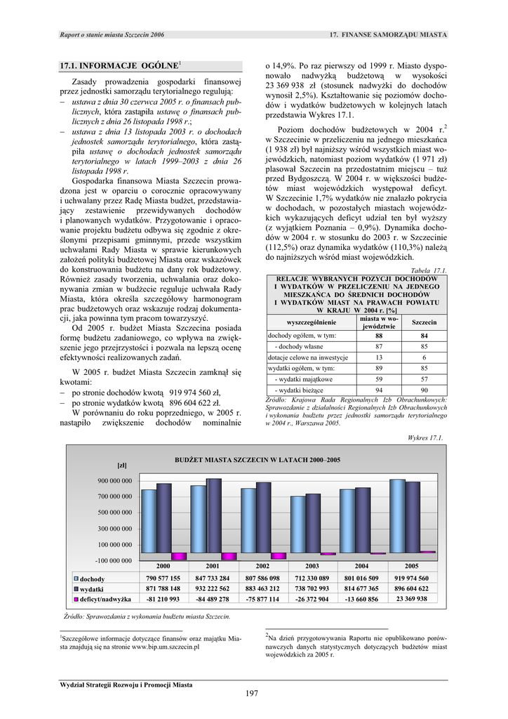 Raport o stanie miasta Szczecin 2006 17. FINANSE SAMORZĄDU MIASTA 17.1. INFORMACJE OGÓLNE1 o 14,9%. Po raz pierwszy od 1999 r. Miasto dysponowało nadwyżką budżetową w wysokości 23 369 938 zł (stosunek nadwyżki do dochodów wynosił 2,5%). Kształtowanie się poziomów dochodów i wydatków budżetowych w kolejnych latach przedstawia Wykres 17.1. Zasady prowadzenia gospodarki finansowej przez jednostki samorządu terytorialnego regulują: − ustawa z dnia 30 czerwca 2005 r. o finansach publicznych, która zastąpiła ustawę o finansach publicznych z dnia 26 listopada 1998 r.; − ustawa z dnia 13 listopada 2003 r. o dochodach jednostek samorządu terytorialnego, która zastąpiła ustawę o dochodach jednostek samorządu terytorialnego w latach 1999–2003 z dnia 26 listopada 1998 r. Gospodarka finansowa Miasta Szczecin prowadzona jest w oparciu o corocznie opracowywany i uchwalany przez Radę Miasta budżet, przedstawiający zestawienie przewidywanych dochodów i planowanych wydatków. Przygotowanie i opracowanie projektu budżetu odbywa się zgodnie z określonymi przepisami gminnymi, przede wszystkim uchwałami Rady Miasta w sprawie kierunkowych założeń polityki budżetowej Miasta oraz wskazówek do konstruowania budżetu na dany rok budżetowy. Również zasady tworzenia, uchwalania oraz dokonywania zmian w budżecie reguluje uchwała Rady Miasta, która określa szczegółowy harmonogram prac budżetowych oraz wskazuje rodzaj dokumentacji, jaka powinna tym pracom towarzyszyć. Od 2005 r. budżet Miasta Szczecina posiada formę budżetu zadaniowego, co wpływa na zwiększenie jego przejrzystości i pozwala na lepszą ocenę efektywności realizowanych zadań. Poziom dochodów budżetowych w 2004 r.2 w Szczecinie w przeliczeniu na jednego mieszkańca (1 938 zł) był najniższy wśród wszystkich miast wojewódzkich, natomiast poziom wydatków (1 971 zł) plasował Szczecin na przedostatnim miejscu – tuż przed Bydgoszczą. W 2004 r. w większości budżetów miast wojewódzkich występował deficyt. W Szczecinie 1,7% wydatków nie znalazło pokrycia w dochodach, w pozostałych miastach wojewódzkich wykazujących deficyt udział ten był wyższy (z wyjątkiem Poznania – 0,9%). Dynamika dochodów w 2004 r. w stosunku do 2003 r. w Szczecinie (112,5%) oraz dynamika wydatków (110,3%) należą do najniższych wśród miast wojewódzkich. Tabela 17.1. RELACJE WYBRANYCH POZYCJI DOCHODÓW I WYDATKÓW W PRZELICZENIU NA JEDNEGO MIESZKAŃCA DO ŚREDNICH DOCHODÓW I WYDATKÓW MIAST NA PRAWACH POWIATU W KRAJU W 2004 r. [%] miasta w wowyszczególnienie Szczecin jewództwie dochody ogółem, w tym: 88 84 - dochody własne W 2005 r. budżet Miasta Szczecin zamknął się kwotami: − po stronie dochodów kwotą 919 974 560 zł, − po stronie wydatków kwotą 896 604 622 zł. W porównaniu do roku poprzedniego, w 2005 r. nastąpiło zwiększenie dochodów nominalnie 87 85 dotacje celowe na inwestycje 13 6 wydatki ogółem, w tym: 89 85 59 57 - wydatki majątkowe - wydatki bieżące 94 90 Źródło: Krajowa Rada Regionalnych Izb Obrachunkowych: Sprawozdanie z działalności Regionalnych Izb Obrachunkowych i wykonania budżetu przez jednostki samorządu terytorialnego w 2004 r., Warszawa 2005. Wykres 17.1. BUDŻET MIASTA SZCZECIN W LATACH 2000–2005 [zł] 900 000 000 700 000 000 500 000 000 300 000 000 100 000 000 -100 000 000 2000 2001 2002 2003 2004 2005 dochody 790 577 155 847 733 284 807 586 098 712 330 089 801 016 509 919 974 560 wydatki deficyt/nadwyżka 871 788 148 932 222 562 883 463 212 738 702 993 814 677 365 896 604 622 -81 210 993 -84 489 278 -75 877 114 -26 372 904 -13 660 856 23 369 938 Źródło: Sprawozdania z wykonania budżetu miasta Szczecin. 2 1 Na dzień przygotowywania Raportu nie opublikowano porównawczych danych statystycznych dotyczących budżetów miast wojewódzkich za 2005 r. Szczegółowe informacje dotyczące finansów oraz majątku Miasta znajdują się na stronie www.bip.um.szczecin.pl Wydział Strategii Rozwoju i Promocji Miasta 197 Raport o stanie miasta Szczecin 2006 17. FINANSE SAMORZĄDU MIASTA czy powierzchnia dróg publicznych w przeliczeniu na jednego mieszkańca. Ma to na celu jak najbardziej racjonalne kierowanie strumienia środków wyrównawczych. Wprowadzone w 2004 r. zmiany w systemie finansowania z jednej strony oznaczają zwiększenie samodzielności samorządów w dysponowaniu środkami publicznymi, z drugiej strony bardziej uzależniają strumień dochodów budżetowych od kondycji lokalnej gospodarki. Zmiany nie zapewniły jednak takiego udziału w dochodach publicznych, jaki byłby odpowiedni dla przypisanych Miastu w drodze ustaw zadań z zakresu użyteczności publicznej. Formułowanie i wdrażanie przedsięwzięć sprzyjających lokalnemu i regionalnemu rozwojowi społeczno-gospodarczemu wymaga uruchomienia dodatkowych źródeł finansowania przy utrzymywaniu bezpiecznego poziomu zadłużenia Miasta. Stąd też konieczne jest podejmowanie przez samorządy aktywnej polityki zmierzającej do wzrostu dochodów ze źródeł, na które mają one bezpośredni wpływ i kształtowania korzystnej relacji w stosunku do transferów z budżetu centralnego. Zdecydowanie w lepszej sytuacji finansowej będą zawsze JST o wyższym stopniu rozwoju społeczno-gospodarczego, co wiąże się zarówno z występowaniem w szerszym zakresie źródeł przyznanych dochodów, jak i z możliwością zwiększania ich wydajności. 17.2. DOCHODY MIASTA Zgodnie z Konstytucją RP na dochody jednostek samorządu terytorialnego (JST) składają się trzy podstawowe elementy: − dochody własne, − subwencje oraz − dotacje celowe z budżetu państwa. Szczegółowe źródła dochodów JST oraz zasady ustalania i tryb przekazywania subwencji ogólnych, jak również sposób udzielania dotacji określa wspomniana wcześniej ustawa z dnia 13 listopada 2003 r. o dochodach jednostek samorządu terytorialnego. Zgodnie z zapisami przedmiotowej ustawy dochodami JST 