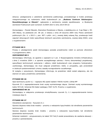 awa, 10.10.2014 r. dotyczy: post powania o udzielenie zamówienia publicznego, prowadzonego w trybie przetargu nieograniczonego na wykonanie robót budowlanych pn. „Budowa Centrum EdukacyjnoRewalidacyjnego w O awie”, og oszenie o zamóweniu zosta o opublikowane w Biuletynie Zamówie Publicznych pod numerem 313504-2014 w dniu 2014-09-22 Zamawiaj cy – Powiat O awski, Starostwo Powiatowe w O awie, z siedzib przy ul. 3-go Maja 1, 55200 O awa, na podstawie art. 38 ust. 2 Ustawy z dnia 29 stycznia 2004 roku Prawo zamówie publicznych (Dz. U. z 2013 r., poz. 907 z pó n. zm.), zwanej dalej ustaw zapyta Pzp, przekazuje tre dotycz cych tre ci specyfikacji istotnych warunków zamówienia, zwanej dalej SIWZ, wraz z wyja nieniami: PYTANIE NR 9 Prosz o udost pnienie je eli Zamawiaj cy posiada przedmiarów robót co pomo e oferentom w przygotowaniu ofert. ODPOWIED NR 9 Zamawiaj cy informuje, e zgodnie z zapisami § 3 ust. 3 Rozporz dzenia ministra Infrastruktury z dnia 2 wrze nia 2004 r. w sprawie szczegó owego zakresu i formy dokumentacji projektowej, specyfikacji technicznych wykonania i odbioru robót budowlanych oraz programu funkcjonalnoytkowego, Zamawiaj cy nie musi za cza przedmiaru robót, w przypadku, gdy przewidzia w istotnych postanowieniach umowy zasad wynagrodzenia rycza towego. W zwi zku z powy szym, Zamawiaj cy informuje, e przedmiar robót zosta za czony, ale nie stanowi on opisu przedmiotu zamówienia. PYTANIE NR 26 Opis techniczny punkt 4,1 - napisano RG zasili kablem YAKXS 4x240 z ZK4a-lPP Rysunek Z1.1 zagospodarowanie brak wy ej wymienionego z cza. Zamiast wy ej wymienionego kabla YKY120. Schemat RG Kabel zasilaj cy YAKY 4x70. Prosimy o wyja nienie. ODPOWIED NR 26 Zamawiaj cy w za czeniu przekazuje zmodyfikowany rysunek ZII 1.1 zagospodarowanie terenu instalacje etap II. PYTANIE NR 27 wietlenie zewn trzne - Rysunek Z1.1 Oprawa s upowa niska brak modelu - prosimy o wskazanie typu/modelu lub okre lenie parametrów technicznych. Oprawa s upowa wysoka brak modelu - prosimy o wskazanie typu/modelu lub okre lenie parametrów technicznych. Schemat rozdzielni - przypuszczamy e kabel YKY 5x2,5 zosta przewidziany do zasilania elewacji prosimy o potwierdzenie. ODPOWIED NR 27 Zamawiaj cy w za czeniu przekazuje zmodyfikowany rysunek ZII 1.1 zagospodarowanie terenu instalacje etap II. PYTANIE NR 29 Instalacja ETB/KNX - brak schematów (nie wiadomo czym i jak ma sterowa ), brak opisu technicznego - prosimy o uzupe nienie. ODPOWIED NR 29 Zamawiaj cy informuje, i w zakresie opisu windy osobowej udzieli odpowiedzi nr 25 z dnia 3 pa dziernika 2014 roku, zamieszczaj c równie zestawienie urz dze wchodz cych w sk ad systemy KNX/EiB wraz z elewacj szaf. PYTANIE NR 31 Prosz o za czenie do dokumentacji projektowej projektu wykonawczego w ODPOWIED a cieplnego, NR 31 Zamawiaj cy w za czeniu przekazuje zmodyfikowany rysunki: T1z technologia w T2z technologia w a cieplnego opis, T3z technologia w a cieplnego, a cieplnego schemat regulacji c.o. PYTANIE NR 33 W imieniu Wykonawcy zwracam si z zapytaniem czy Zamawiaj cy wyrazi zgod na cesj wierzytelno ci z instytucj finansowa/bankiem dla zabezpieczenia kredytu. W zwi zku z powy szym prosz o jednoznaczn odpowied czy Zamawiaj cy wyrazi zgod na tak cesj . Je li zgoda taka jest czym ograniczona to prosz równie o podanie warunków przy których Zamawiaj cy wyrazi zgod na cesj wierzytelno ci. ODPOWIED NR 33 Zamawiaj cy informuje i tre zapytanie nie stanowi pytania do tre ci SIWZ, zgodnie z zapisami art. 38 ust. 1 Ustawy Pzp. Zamawiaj cy równocze nie informuje, e nie wyra a zgody na cesje wierzytelno ci dla zabezpieczenia kredytu. PYTANIE NR 34 Z uwagi na du ilo za czników do SIWZ Wykonawca zwraca si z pro o udost pnienie ich w wersji edytowalnej. ODPOWIED NR 34 Zamawiaj cy zamieszcza za czniki do SIWZ w wersji edytowalnej. Zamawiaj cy równocze nie informuje, e dodatkowo w za czeniu przekazuje tre technicznej wykonania i odbioru robót budowlanych, któr specyfikacji nale y traktowa jako integralna cz OPZ. Zamawiaj cy jednocze nie informuje, i przedmiotowe zmiany nie prowadz do zmiany tre ci og oszenia o zamówieniu oraz, e przedmiotowe zmiany nale y traktowa jako jedyne obowi zuj ce natomiast pozosta e zapisy SIWZ pozostaj bez zmian. W za czeniu: 1. Przedmiary robót; 2. Rysunek ZII 1.1 zagospodarowanie terenu instalacje etap II; 3. T1z technologia w a cieplnego; 4. T2z technologia w a cieplnego opis; 5. T3z technologia w a cieplnego schemat regulacji c.o.; 6. Specyfikacja techniczna wykonania i odbioru robót budowlanych w zakresie szczelno ci budynków i termowizji;
