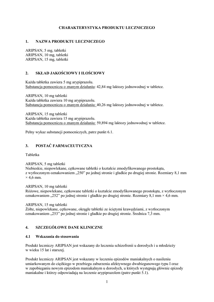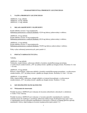 CHARAKTERYSTYKA PRODUKTU LECZNICZEGO 1. NAZWA PRODUKTU LECZNICZEGO ARIPSAN, 5 mg, tabletki ARIPSAN, 10 mg, tabletki ARIPSAN, 15 mg, tabletki 2. SKŁAD JAKOŚCIOWY I ILOŚCIOWY Każda tabletka zawiera 5 mg arypiprazolu. Substancja pomocnicza o znanym działaniu: 42,84 mg laktozy jednowodnej w tabletce. ARIPSAN, 10 mg tabletki Każda tabletka zawiera 10 mg arypiprazolu. Substancja pomocnicza o znanym działaniu: 40,26 mg laktozy jednowodnej w tabletce. ARIPSAN, 15 mg tabletki Każda tabletka zawiera 15 mg arypiprazolu. Substancja pomocnicza o znanym działaniu: 59,894 mg laktozy jednowodnej w tabletce. Pełny wykaz substancji pomocniczych, patrz punkt 6.1. 3. POSTAĆ FARMACEUTYCZNA Tabletka ARIPSAN, 5 mg tabletki Niebieskie, niepowlekane, cętkowane tabletki o kształcie zmodyfikowanego prostokąta, z wytłoczonym oznakowaniem „250” po jednej stronie i gładkie po drugiej stronie. Rozmiary 8,1 mm × 4,6 mm. ARIPSAN, 10 mg tabletki Różowe, niepowlekane, cętkowane tabletki o kształcie zmodyfikowanego prostokąta, z wytłoczonym oznakowaniem „252” po jednej stronie i gładkie po drugiej stronie. Rozmiary 8,1 mm × 4,6 mm. ARIPSAN, 15 mg tabletki Żółte, niepowlekane, cętkowane, okrągłe tabletki ze ściętymi krawędziami, z wytłoczonym oznakowaniem „253” po jednej stronie i gładkie po drugiej stronie. Średnica 7,3 mm. 4. SZCZEGÓŁOWE DANE KLINICZNE 4.1 Wskazania do stosowania Produkt leczniczy ARIPSAN jest wskazany do leczenia schizofrenii u dorosłych i u młodzieży w wieku 15 lat i starszej. Produkt leczniczy ARIPSAN jest wskazany w leczeniu epizodów maniakalnych o nasileniu umiarkowanym do ciężkiego w przebiegu zaburzenia afektywnego dwubiegunowego typu I oraz w zapobieganiu nowym epizodom maniakalnym u dorosłych, u których występują głównie epizody maniakalne i którzy odpowiadają na leczenie arypiprazolem (patrz punkt 5.1). 1 Produkt leczniczy ARIPSAN jest wskazany w leczeniu epizodów maniakalnych o nasileniu umiarkowanym do ciężkiego w przebiegu zaburzenia afektywnego dwubiegunowego typu I u młodzieży w wieku 13 lat i starszej, w leczeniu trwającym do 12 tygodni (patrz punkt 5.1). 4.2 Dawkowanie i sposób podawania Dawkowanie Dorośli Schizofrenia: zalecana dawka początkowa produktu ARIPSAN to 10 lub 15 mg na dobę, z dawką podtrzymującą 15 mg na dobę. Lek należy podawać raz na dobę, o stałej porze, niezależnie od posiłków. Produkt leczniczy ARIPSAN jest skuteczny w dawkach od 10 do 30 mg na dobę. Chociaż nie potwierdzono większej skuteczności dawek większych, niż dawka dobowa 15 mg, jednak u poszczególnych pacjentów większa dawka może być korzystna. Maksymalna dawka dobowa nie może być większa, niż 30 mg. Epizody maniakalne w zaburzeniu afektywnym dwubiegunowym typu I: zalecana dawka początkowa to 15 mg arypiprazolu podawane w schemacie raz na dobę, niezależnie od posiłków jako monoterapia lub w leczeniu skojarzonym (patrz punkt 5.1). U niektórych pacjentów może być korzystne zastosowanie większej dawki. Maksymalna dawka dobowa nie może być większa, niż 30 mg. Zapobieganie nawrotom epizodów maniakalnych w zaburzeniu afektywnym dwubiegunowym typu I: w celu zapobiegania nawrotom epizodów maniakalnych u pacjentów, którzy stosują arypiprazol w monoterapii lub w terapii skojarzonej, należy kontynuować leczenie stosując ustaloną dawkę. Dostosowanie dawki dobowej, w tym jej zmniejszenie, należy rozważyć na podstawie stanu klinicznego. Dzieci i młodzież Schizofrenia u młodzieży w wieku 15 lat i starszej: zalecana dawka produktu ARIPSAN, to 10 mg na dobę podawane w schemacie raz na dobę, niezależnie od posiłków. Leczenie powinno być rozpoczęte od dawki 2 mg (stosując arypiprazol w postaci roztworu doustnego o mocy 1 mg/ml) przez 2 dni, stopniowo zwiększanej do 5 mg przez kolejne 2 dni, aż do osiągnięcia zalecanej dawki dobowej wynoszącej 10 mg. W przypadkach gdzie zwiększenie dawki jest właściwe, należy podawać kolejne dawki zwiększone jednorazowo o 5 mg, nie przekraczając maksymalnej dawki dobowej 30 mg (patrz punkt 5.1). Produkt leczniczy ARIPSAN jest skuteczny w przedziale dawek 10 do 30 mg na dobę. Nie wykazano większej skuteczności dla dawek dobowych większych, niż 10 mg, chociaż niektórzy pacjenci mogą odnieść korzyść z zastosowania większych dawek. Produkt leczniczy ARIPSAN nie jest zalecany do stosowania u pacjentów ze schizofrenią w wieku poniżej 15 lat, z powodu braku wystarczających danych dotyczących bezpieczeństwa stosowania i skuteczności (patrz punkty 4.8 i 5.1). Epizody maniakalne w zaburzeniu afektywnym dwubiegunowym typu I u młodzieży w wieku 13 lat i starszej: zalecana dawka produktu ARIPSAN to 10 mg na dobę, podawana w schemacie raz na dobę, niezależnie od posiłków. Leczenie należy rozpocząć od dawki 2 mg (stosując arypiprazol w postaci roztworu doustnego) przez 2 dni, stopniowo zwiększanej do 5 mg przez kolejne 2 dni, aż do osiągnięcia zalecanej dawki dobowej wynoszącej 10 mg. Czas trwania leczenia powinien być możliwie najkrótszy, konieczny do uzyskania kontroli objawów i nie może być dłuższy, niż 12 tygodni. Nie wykazano większej skuteczności leczenia po zastosowaniu dawek dobowych większych, niż 10 mg, a dawka dobowa wynosząca 30 mg jest związana ze znacząco większą częstością występowania istotnych działań niepożądanych, włączając zdarzenia związane z objawami pozapiramidowymi (ang. EPS), senność, zmęczenie oraz zwiększenie masy ciała (patrz punkt 4.8). Z tego powodu dawki większe, niż 10 mg na dobę, należy stosować tylko 2 w wyjątkowych przypadkach oraz z zachowaniem ścisłej kontroli klinicznej (patrz punkty 4.4, 4.8 i 5.1). Młodsi pacjenci są narażeni na zwiększone ryzyko doświadczenia działań niepożądanych, związanych z arypiprazolem. Z tego powodu produkt ARIPSAN nie jest zalecany do stosowania u pacjentów w wieku poniżej 13 lat (patrz punkty 4.8 i 5.1). Dra
