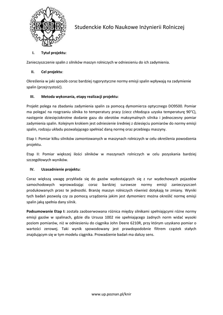 Studenckie Koło Naukowe Inżynierii Rolniczej I. Tytuł projektu: Zanieczyszczenie spalin z silników maszyn rolniczych w odniesieniu do ich zadymienia. II. Cel projektu: Określenia w jaki sposób coraz bardziej rygorystyczne normy emisji spalin wpływają na zadymienie spalin (przejrzystośd). III. Metoda wykonania, etapy realizacji projektu: Projekt polega na zbadaniu zadymienia spalin za pomocą dymomierza optycznego DO9500. Pomiar ma polegad na rozgrzaniu silnika to temperatury pracy (ciecz chłodząca uzyska temperaturę 90°C), następnie dziesięciokrotne dodanie gazu do obrotów maksymalnych silnika i jednoczesny pomiar zadymienia spalin. Kolejnym krokiem jest odniesienie średniej z dziesięciu pomiarów do normy emisji spalin, rodzaju układu pozwalającego spełniad daną normę oraz przebiegu maszyny. Etap I: Pomiar kilku silników zamontowanych w maszynach rolniczych w celu określenia powodzenia projektu. Etap II: Pomiar większej ilości silników w maszynach rolniczych w celu pozyskania bardziej szczegółowych wyników. IV. Uzasadnienie projektu: Coraz większą uwagę przykłada się do gazów wydostających się z rur wydechowych pojazdów samochodowych wprowadzając coraz bardziej surowsze normy emisji zanieczyszczeo produkowanych przez te jednostki. Branżę maszyn rolniczych również dotykają te zmiany. Wyniki tych badao pozwolą czy za pomocą urządzenia jakim jest dymomierz można określid normę emisji spalin jaką spełnia dany silnik. Podsumowanie Etap I: została zaobserwowana różnica między silnikami spełniającymi różne normy emisji gazów w spalinach, gdzie dla Ursusa 1002 nie spełniającego żadnych norm widad wysoki poziom pomiarów, niż w odniesieniu do ciągnika John Deere 6210R, przy którym uzyskano pomiar o wartości zerowej. Taki wynik spowodowany jest prawdopodobnie filtrem cząstek stałych znajdującym się w tym modelu ciągnika. Prowadzenie badao ma dalszy sens. www.up.poznan.pl/knir