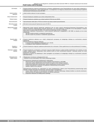 Załącznik nr 2 do Regulaminu udzielania przez Bank Zachodni WBK S.A. kredytów hipotecznych dla ludności POśYCZKA HIPOTECZNA Cel kredytu 1 PoŜyczki hipoteczne mogą być przeznaczone na dowolny zadeklarowany przez PoŜyczkobiorcę cel, poza celami związanymi z działalnością gospodarczą i celami spekulacyjnymi, w szczególności nie mogą być przeznaczone na zakup bankowych papierów wartościowych emitowanych przez BZ WBK. Udział środków własnych 2 Udział środków własnych nie jest wymagany. Okres kredytowania 3 PoŜyczki hipoteczne udzielane są na okres maksymalnie 20 lat. Waluta kredytu 4 PoŜyczki hipoteczne udzielane są w złotych polskich (PLN) lub euro (EUR). Oprocentowanie 5 Oprocentowanie stałe (tylko w PLN) lub zmienne wg wykazu stawek oprocentowania. Minimalna kwota kredytu 6 Minimalna kwota poŜyczki hipotecznej wynosi 20.000 zł. Maksymalna kwota kredytu 7 Maksymalna kwota poŜyczki hipotecznej uzaleŜniona jest od oceny sytuacji ekonomiczno-finansowej PoŜyczkobiorcy oraz wartości przedmiotu zabezpieczenia poŜyczki hipotecznej i nie moŜe przekroczyć 10.000.000 zł lub równowartości w walucie obcej (wg kursu kupna dewiz BZ WBK z dnia złoŜenia kompletnego wniosku w Oddziale). Maksymalne zadłuŜenie PoŜyczkobiorcy z tytułu poŜyczek hipotecznych zaciągniętych w BZ WBK na dowolny cel nie moŜe przekroczyć: 250.000 zł jeŜeli prowadzi on działalność gospodarczą, 500.000 zł jeŜeli nie prowadzi on działalności gospodarczej Sposób spłaty kredytu 8 PoŜyczki hipoteczne spłacane są w ratach miesięcznych począwszy od następnego miesiąca po uruchomieniu poŜyczki hipotecznej. PoŜyczki hipoteczne mogą być spłacane: w równych ratach kapitałowo-odsetkowych, tzw. annuita, w malejących ratach kapitałowo-odsetkowych. Wypłata w transzach 9 PoŜyczki hipoteczne mogą być wypłacane jednorazowo lub w transzach. Okres wypłat transz nie moŜe przekraczać 24 miesięcy. Karencja w spłacie kapitału 10 PoŜyczki hipoteczne uruchamiane w transzach mogą być objęte karencją w spłacie kapitału standardowo do 6 miesięcy od dnia wypłaty ostatniej transzy. Maksymalny okres karencji liczony od dnia uruchomienia poŜyczki / pierwszej transzy nie moŜe przekroczyć 36 miesięcy. Karencja nie dotyczy rat odsetkowych, które wymagalne są począwszy od następnego miesiąca po uruchomieniu poŜyczki/ pierwszej transzy. Zabezpieczenie spłaty kredytu 11 Obligatoryjnym docelowym zabezpieczeniem jest: - hipoteka do sumy stanowiącej 150% kwoty udzielonego kredytu; Do stosowanych zabezpieczeń podstawowych naleŜą takŜe: Pełnomocnictwo do dysponowania kontem osobistym PoŜyczkobiorcy w BZ WBK, Cesja praw z polisy ubezpieczenia nieruchomości od ognia i innych zdarzeń losowych, Ustanowienie Banku jako uposaŜonego z polisy ubezpieczenia na Ŝycie PoŜyczkobiorcy, Przelew wierzytelności w stosunku do spółdzielni mieszkaniowej lub developera, Weksel in blanco nie na zlecenie Zabezpieczenie pomostowe tzn. ustanawiane do czasu przedstawienia w Banku przez PoŜyczkobiorcę prawomocnego wpisu hipoteki w księdze wieczystej nieruchomości, stanowić mogą w szczególności: kaucja, zastaw rejestrowy na wierzytelności wynikającej z rachunku bankowego, blokada środków na rachunku bankowym, pełnomocnictwo do dysponowania środkami na rachunku bankowym, poręczenie wekslowe lub według prawa cywilnego. Załącznik nr 2 do Regulaminu udzielania przez BZ WBK S.A. kredytów hipotecznych dla ludności