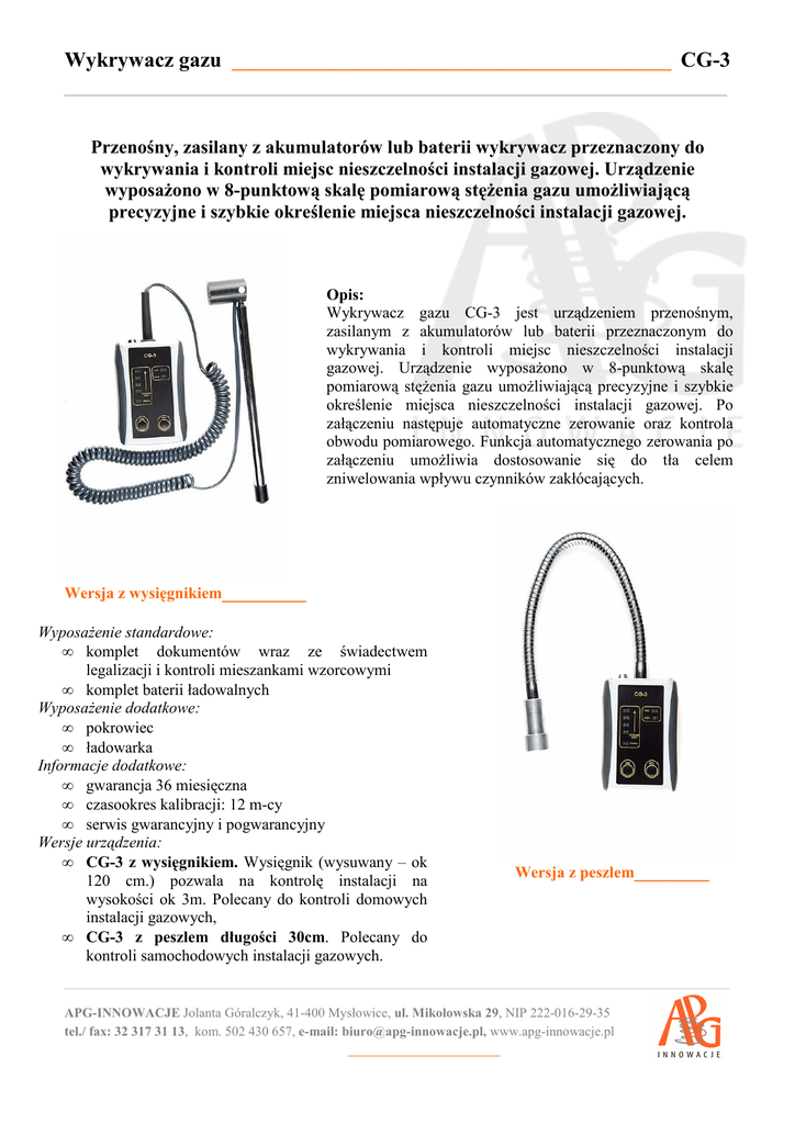 Wykrywacz gazu _______________________________________________ CG-3 ______________________________________________________________ Przenośny, zasilany z akumulatorów lub baterii wykrywacz przeznaczony do wykrywania i kontroli miejsc nieszczelności instalacji gazowej. Urządzenie wyposażono w 8-punktową skalę pomiarową stężenia gazu umożliwiającą precyzyjne i szybkie określenie miejsca nieszczelności instalacji gazowej. Opis: Wykrywacz gazu CG-3 jest urządzeniem przenośnym, zasilanym z akumulatorów lub baterii przeznaczonym do wykrywania i kontroli miejsc nieszczelności instalacji gazowej. Urządzenie wyposażono w 8-punktową skalę pomiarową stężenia gazu umożliwiającą precyzyjne i szybkie określenie miejsca nieszczelności instalacji gazowej. Po załączeniu następuje automatyczne zerowanie oraz kontrola obwodu pomiarowego. Funkcja automatycznego zerowania po załączeniu umożliwia dostosowanie się do tła celem zniwelowania wpływu czynników zakłócających. Wersja z wysięgnikiem_________ Wyposażenie standardowe: • komplet dokumentów wraz ze świadectwem legalizacji i kontroli mieszankami wzorcowymi • komplet baterii ładowalnych Wyposażenie dodatkowe: • pokrowiec • ładowarka Informacje dodatkowe: • gwarancja 36 miesięczna • czasookres kalibracji: 12 m-cy • serwis gwarancyjny i pogwarancyjny Wersje urządzenia: • CG-3 z wysięgnikiem. Wysięgnik (wysuwany – ok 120 cm.) pozwala na kontrolę instalacji na wysokości ok 3m. Polecany do kontroli domowych instalacji gazowych, • CG-3 z peszlem długości 30cm. Polecany do kontroli samochodowych instalacji gazowych. Wersja z peszlem________ ___________________________________________________________________________________ APG-INNOWACJE Jolanta Góralczyk, 41-400 Mysłowice, ul. Mikołowska 29, NIP 222-016-29-35 tel./ fax: 32 317 31 13, kom. 502 430 657, e-mail: [email protected], www.apg-innowacje.pl ___________________ Wykrywacz gazu _______________________________________________ CG-3 ______________________________________________________________ Dane techniczne: • zastosowany sensor: półprzewodnikowy • rodzaj pomiaru: ciągły dyfuzyjny • wykrywane gazy: metan, propan, izobutan, LPG • wykrywane opary: benzyny, alkoholu, rozpuszczalników • stężenie wykrywane: ~40÷50ppm Zakresy pomiarowe: • wykrycie: < 2% DGP w zakresie do 10% DGP • temperatury pracy: od -5°C do +40°C • temperatury przechowywania: od -20°C do +40°C • wilgotności pracy: 30-70%Rh bez kondensacji • ciśnienia pracy: 900-1100hPa Sygnalizacja: • wykrycia gazu (8-punktowa skala): optyczna i akustyczna • nagłego wzrostu stężenia gazu: optyczna i akustyczna • przekroczenia progów alarmowych: optyczna i akustyczna • uszkodzenia w obwodzie pomiarowym: optyczna i akustyczna • stanu wyczerpania akumulatorów: optyczna • automatyczne wyłączenie przyrządu przy spadku napięcia akumulatorów poniżej wartości dopuszczalnej • rodzaj sygnalizacji optycznej: linijka diodowa Czas: • pracy urządzenia: około 10h ciągłego pomiaru (dla akumulatorów 2400mAh), • ładowania akumulatorów: zależny od typu używanej ładowarki, • reakcji po podaniu mieszanki (obieg wymuszony): <= 2s, • reakcji po podaniu mieszanki (obieg niewymuszony): <= 4s, Pozostałe parametry: • zasilanie: 2 baterie rozmiar AA lub akumulatory Ni-MH - wyjmowane, ładowane w zewnętrznej ładowarce • wymiary (długość/szerokość/wysokość): 94mm/63mm/27mm • waga: ~ 240g ___________________________________________________________________________________ APG-INNOWACJE Jolanta Góralczyk, 41-400 Mysłowice, ul. Mikołowska 29, NIP 222-016-29-35 tel./ fax: 32 317 31 13, kom. 502 430 657, e-mail: [email protected], www.apg-innowacje.pl ___________________