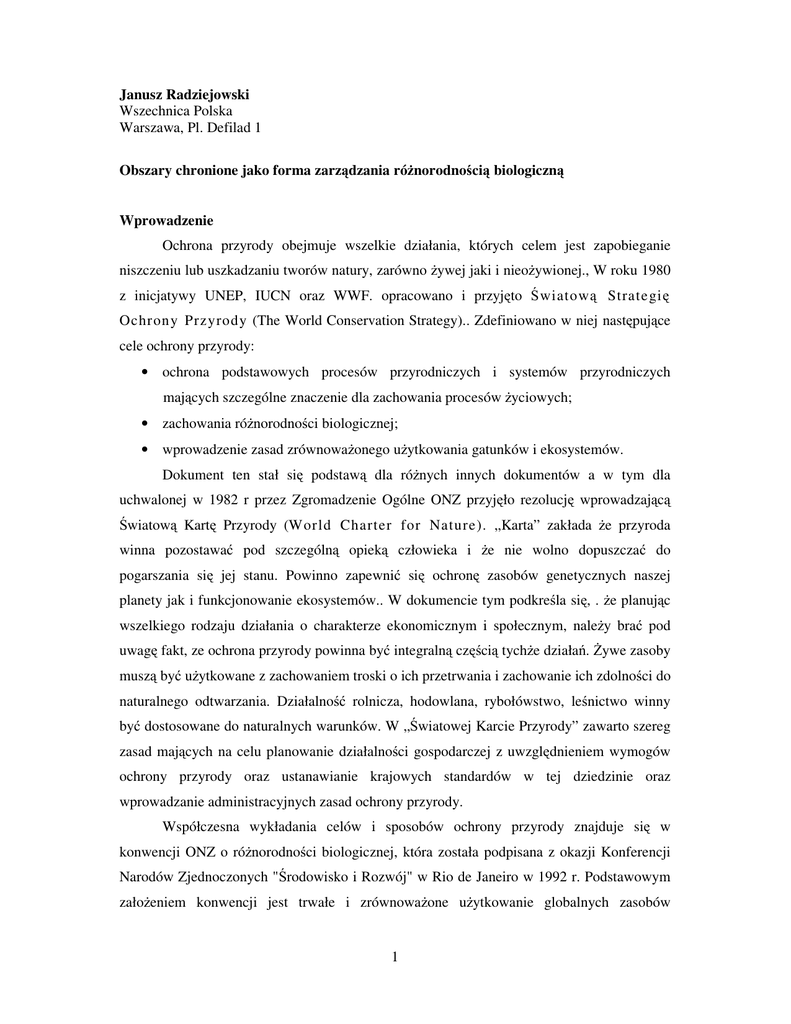 Janusz Radziejowski Wszechnica Polska Warszawa, Pl. Defilad 1 Obszary chronione jako forma zarządzania róŜnorodnością biologiczną Wprowadzenie Ochrona przyrody obejmuje wszelkie działania, których celem jest zapobieganie niszczeniu lub uszkadzaniu tworów natury, zarówno Ŝywej jaki i nieoŜywionej., W roku 1980 z inicjatywy UNEP, IUCN oraz WWF. opracowano i przyjęto Światową Strategię Ochrony Przyrody (The World Conservation Strategy).. Zdefiniowano w niej następujące cele ochrony przyrody: • ochrona podstawowych procesów przyrodniczych i systemów przyrodniczych mających szczególne znaczenie dla zachowania procesów Ŝyciowych; • zachowania róŜnorodności biologicznej; • wprowadzenie zasad zrównowaŜonego uŜytkowania gatunków i ekosystemów. Dokument ten stał się podstawą dla róŜnych innych dokumentów a w tym dla uchwalonej w 1982 r przez Zgromadzenie Ogólne ONZ przyjęło rezolucję wprowadzającą Światową Kartę Przyrody (World Charter for Nature). „Karta” zakłada Ŝe przyroda winna pozostawać pod szczególną opieką człowieka i Ŝe nie wolno dopuszczać do pogarszania się jej stanu. Powinno zapewnić się ochronę zasobów genetycznych naszej planety jak i funkcjonowanie ekosystemów.. W dokumencie tym podkreśla się, . Ŝe planując wszelkiego rodzaju działania o charakterze ekonomicznym i społecznym, naleŜy brać pod uwagę fakt, ze ochrona przyrody powinna być integralną częścią tychŜe działań. śywe zasoby muszą być uŜytkowane z zachowaniem troski o ich przetrwania i zachowanie ich zdolności do naturalnego odtwarzania. Działalność rolnicza, hodowlana, rybołówstwo, leśnictwo winny być dostosowane do naturalnych warunków. W „Światowej Karcie Przyrody” zawarto szereg zasad mających na celu planowanie działalności gospodarczej z uwzględnieniem wymogów ochrony przyrody oraz ustanawianie krajowych standardów w tej dziedzinie oraz wprowadzanie administracyjnych zasad ochrony przyrody. Współczesna wykładania celów i sposobów ochrony przyrody znajduje się w konwencji ONZ o róŜnorodności biologicznej, która została podpisana z okazji Konferencji Narodów Zjednoczonych "Środowisko i Rozwój" w Rio de Janeiro w 1992 r. Podstawowym załoŜeniem konwencji jest trwałe i zrównowaŜone uŜytkowanie globalnych zasobów 1 przyrodniczych, wyraŜające się niedopuszczeniem do nieodwracalnej zagłady jakichkolwiek gatunków zwierząt i roślin oraz całych ekosystemów. Obecnie, w świetle doświadczeń międzynarodowych, coraz bardziej oczywiste jest, Ŝe szczególne znaczenie dla zapewnienia warunków dla ochrony przyrody ma tworzenie obszarów chronionych prawem. Tylko takie rozwiązania chronią skutecznie unikalne i zagroŜone wyginięciem gatunki zwierząt i roślin, min poprzez ochronę całych ekosystemów, zachowania warunków ich funkcjonowania. Ostatnio, Międzynarodowa Unia Ochrony Przyrody - IUCN zaproponowała nową definicję obszarów chronionych jako „Ściśle zdefiniowaną przestrzeń geograficzną, uznaną (przez odpowiednie władze i społeczność lokalną), przeznaczoną i zarządzaną poprzez środki prawne lub teŜ inne efektywne środki dla osiągnięcia długoterminowych celów w zakresie ochrony przyrody, wraz z występującymi tam usługami ekosystemowymi i walorami kulturowymi” (Dudley, 2008). Definicja ta ma zdaniem autorów podkreślić, Ŝe głównym celem obszarów chronionych jest ochrona przyrody, a w tym róŜnych gatunków zwierząt i roślin, tworów i zjawisk przyrody nieoŜywionej, funkcjonalnych jednostek przyrodniczych (ekosystemów) oraz wytwarzanych przez nie „dóbr”, niezbędnych dla funkcjonowania samej przyrody jak i ludzkości (usługi ekosytemowe). Ochronie przyrody towarzyszyć powinna ochrona walorów kulturowych danego obszaru jak i ochrona dóbr i walorów słuŜących zrównowaŜonemu jego uŜytkowaniu przez człowieka. Obszary chronione przybierają szereg form organizacyjnych. W powszechnym uŜyciu są takŜe inne kategorie ochronne jak parki natury, parki krajobrazowe, rezerwaty przyrody, obszary chronionego krajobrazu, pomniki przyrody, obszary krajobrazowo – przyrodnicze, uŜytki ekologiczne i inne. Obecnie moŜna juŜ mówić o globalnej sieci parków narodowych i innych terenów chronionych. obejmujących takŜe akweny mórz i oceanów. Obszary chronione są bardzo często ostatnimi ostojami dzikich zwierząt i roślin, które poza nimi nie występują juŜ nigdzie w przyrodzie. MoŜna więc powiedzieć, Ŝe stanowią one waŜne naturalne banki genów. Mają teŜ olbrzymie znaczenie dla ochrony ukształtowanych historycznie krajobrazów, pomników historii, kultury i obiektów kultów religijnych a takŜe miejsc bytowania tradycyjnych społeczności plemiennych. Rok 2010 został ogłoszony przez UNESCO jako rok RóŜnorodności Biologicznej. Celem niniejszych uwag jest zwrócenie uwagi na znaczenie, jakie światowy system obszarów chronionych ma dla ochrony róŜnorodności biologicznej oraz na problemy związane z jego funkcjonowaniem. 2 Stan obszarów chronionych JuŜ na początku XIX w. powstawały pierwsze obiekty, które moŜna uznać za obszary chronione w dzisiejszym rozumieniu. Jednak dopiero ustanowienie przez Prezydenta USA Granta w roku 1872 pierwszego parku narodowego, uchodzi za fakt fundamentalny dla rozwoju światowego systemu obszarów chronionych. W Europie pierwszymi parkami narodowymi były: połoŜony w Szwajcarii Park Narodowy Suisse, ostatecznie zatwierdzony przez władze federalne tego kraju w 1914 r., oraz parki narodowe utworzone w 1909 r. w Szwecji (Abisko, Sarek i in.)1. Obszary chronione powstawały równieŜ w krajach Europy Środkowej, które odzyskały niepodległość po I Wojnie Światowej – jak np. w Polsce czy Czechosłowacji, parki narodowe powstawały równieŜ we Włoszech. JednakŜe z gwałtownym rozwojem obszarów chronionych mieliśmy do czynienia dopiero w drugiej połowie XX wieku. WaŜnym