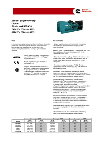 Zespół prądotwórczy Diesel Silnik serii KTA38 748kW - 1000kW 50Hz 837kW - 1020kW 60Hz Opis Właściwości Przemysłowy zespół prądotwórczy Cummins Power Generation jest w pełni zintegrowanym urządzeniem, zapewniającym optymalną pracę, niezawodność i wszechstronność zastosowania jako stacjonarne awaryjne i główne źródło zasilania. • Zespół prądotwórczy z certyfikatem CE - Kompletny zestaw zespołu prądotwórczego dostępny jest z certyfikatem CE. Zespół prądotwórczy jest zaprojektowany i wytworzony w zakładach posiadających certyfikat ISO9001. Zespół prądotwórczy jest dostępny z certyfikatem CE. Program Prototype Test Support (PTS) weryfikuje integralność pracy konstrukcji zespołu prądotwórczego. Produkty Cummins Power Generation oznaczone symbolem PTS spełniają wymagania NFPA 110 dla systemów I stopnia. • Emisja spalin - Opcjonalnie silnik z certyfikatem U.S. EPA Nonroad Source Emmision Standards, CFR 40 dla wszystkich modeli 60Hz. • Silnik Cummins® Heavy-Duty - Wytrzymały czterosuwowy przemysłowy diesel niezawodnie dostarczający moc, o niskiej emisji spalin i szybkiej odpowiedzi na zmiany obciążenia. • Generator z magnesem stałym (PMG) - Oferuje wydajniejszy rozruch zapewniając prąd wzbudzenia na właściwym poziomie. • Alternator - Kilka rozmiarów alternatorów oferuje selektywne zdolności rozruchowe z nisko reaktantywnym uzwojeniem o poskoku 2/3; niskim zniekształceniem kształtu fali przy nieliniowym obciążeniu i izolacją klasy H. • System kontroli - Elektroniczny panel kontrolny PowerCummins® stanowi standardowe wyposażenie i zapewnia całkowitą integralność systemowi zespołu prądotwórczego, automatyczne zdalne włączanie/wyłączanie, precyzyjną regulację częstotliwości i napięcia, monitowanie alarmów i statusu urządzenia, zabezpieczenie AmpSentry, pomiar mocy wyjściowej, automatyczne wyłączenie przy wystąpieniu błędów i zgodność z NFPA 110. • System chłodzenia - Standardowy system chłodzenia stanowiący integralną część zestawu, zaprojektowany i testowany w nominalnych temperaturach otoczenia, uproszczone wymaganie projektowe dla pomieszczeń z uwagi na oddawane ciepło. • Kształtownikowa stalowa rama - Solidna kształtownikowa rama stanowiąca podparcie dla silnika, alternatora i chłodnicy. • Gwarancja i serwis - Zapewnione przez całościową gwarancję i ogólnoświatową sieć dystrybutorów. Model C825D5E C900D5E C1000D5E DFJC DFCD C1250D5A Moc awaryjna (LTP) 50 Hz 60 Hz kW (kVA) kW (kVA) 660 (825) 720 (900) 800 (1000) 832 (1040) 906 (1132) 1000 (1250) NA NA NA NA NA NA Moc ciągła (PRP) 50 Hz 60 Hz kW (kVA) kW (kVA) 600 (750) 656 (820) 728 (910) 748 (936) 823 (1029) 900 (1125) NA NA NA NA NA NA Źródło główne (COP) 50 Hz 60 Hz kW (kVA) kW (kVA) NA NA NA NA NA NA NA NA NA NA NA NA Specyfikacja zespołu prądotwórczego Klasa regulacji regulatora Regulacja napięcia, bez obciążenia do pełnego obciążenia Zmienna wariacja napięcia Regulacja częstotliwości Zmienna wariacja częstotliwości Emisja częstotliwości radiowej ISO8528 ± 1% ± 1% Izochroniczna ± 0.25% IEC 801.2 do IEC 801.5; MIL STD 461C, cz. 9 Specyfikacja silnika Konstrukcja Cylinder Skok Pojemność Blok cylindrów Pojemność akumulatora Alternator ładowania akumulatora Napięcie rozruchowe Układ paliwowy Filtr paliwa Filtr powietrza Filtr oleju smarującego Standardowy system chłodzenia Czterotaktowy, rzędowy, turbodoładowany, chłodzony powietrzem 159 mm (6,25”) 159 mm (6,25”) 38 litrów Dwunastocylindrowy V, wtrysk bezpośredni, czterotaktowy diesel 890 A/godz. minimum w temperaturze otoczenia 0˚C (32˚F) 55 A 24 V, ujemny uziemiony Wtrysk bezpośredni Podwójne odśrodkowe papierowe filtry paliwa z separatorem wody Suchy wymienny element Odśrodkowe papierowe pełnoprzepływowe i obejściowe filtry oleju 50˚C (122˚F) Specyfikacja prądnicy Konstrukcja Twornik Wirnik System izolacyjny Standardowy wzrost temperatury Typ wzbudnicy Obrót faz Chłodzenie alternatora Całkowite zakłócenia harmoniczne fali prądu przemiennego Współczynnik zakłóceń telefonicznych (TIF) Współczynnik harmoniczności telefonicznej (THF) Bezszczotkowy, czterobiegunowy, kroploszczelny Poskok 2/3 Bezpośrednio sprzężony, elastyczny Klasa H 150˚C w zastosowaniu awaryjnym Generator z magnesem stałym (PMG) A (U), B (V), C (W) Bezpośrednio napędzany wentylator odśrodkowy Nieobciążony < 1,5%. Niezakłócone zrównoważone obciążenie liniowe < 5% < 50 na NEMA MG1-22.43 < 3% Dostępne napięcie 50 Hz Fazowe / Międzyfazowe 110/190 240/416 115/200 255/440 120/208 127/220 220/380 230/400 Uwaga: Skonsultuj się z wytwórcą dla innych napięć. 60 Hz Fazowe / Międzyfazowe 110/190 115/200 120/208 127/220 139/240 220/380 230/380 240/416 255/440 277/480 347/600 Opcje zestawu prądotwórczego Silnik • Filtr powietrza H/D • Grzałka płynu bloku silnika z termostatem • Akumulator ołowiowy • Pompa do opróżniania miski olejowej • Kurki spustowe oleju i wody • Certyfikat CE Monitoring temp. spalin (tylko PCCP) • Zestaw narzędziowy • Zgodność z TA Luft Chłodzenie • Chłodnica 50˚C • Zdalne chłodzenie • Wskaźnik temperatury oleju Alternator • Grzałka antykondensacyjna • Termistory Wylot spalin • Tłumik - podstawowy (9dB) • Tłumik - o podwyższonym tłumieniu (25dB) • Elastyczny wylot spalin i kompensator mieszkowy Układ paliwowy • Ręczna pompa paliwowa • Automatyczna pompa paliwowa • Wolnostojący zbiornik paliwa ze stojanem • Przełącznik poziomu paliwa w zbiorniku • Ostrzeżenie o wysokim poziomie paliwa • Wyłączenie przy niskim poziomie paliwa Zespół prądotwórczy • Obudowa odporna na wpływy atmosferyczne • Wyciszona obudowa Kontroler • 3 lub 4-biegunowy wyłącznik • Prostownik baterii startowych • Certyfikat CE i systemy PCC • Skrzynka wejścia okablowania Uwaga: Niektóre opcje mogą być niedostępne we wszystkich model