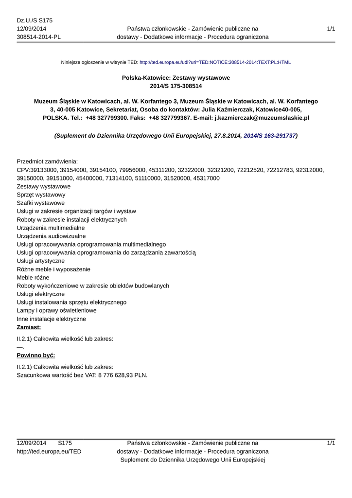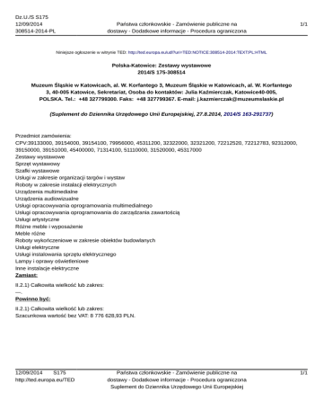Dz.U./S S175 12/09/2014 308514-2014-PL Państwa członkowskie - Zamówienie publiczne na dostawy - Dodatkowe informacje - Procedura ograniczona 1/1 Niniejsze ogłoszenie w witrynie TED: http://ted.europa.eu/udl?uri=TED:NOTICE:308514-2014:TEXT:PL:HTML Polska-Katowice: Zestawy wystawowe 2014/S 175-308514 Muzeum Śląskie w Katowicach, al. W. Korfantego 3, Muzeum Śląskie w Katowicach, al. W. Korfantego 3, 40-005 Katowice, Sekretariat, Osoba do kontaktów: Julia Kaźmierczak, Katowice40-005, POLSKA. Tel.: +48 327799300. Faks: +48 327799367. E-mail: [email protected] (Suplement do Dziennika Urzędowego Unii Europejskiej, 27.8.2014, 2014/S 163-291737) Przedmiot zamówienia: CPV:39133000, 39154000, 39154100, 79956000, 45311200, 32322000, 32321200, 72212520, 72212783, 92312000, 39150000, 39151000, 45400000, 71314100, 51110000, 31520000, 45317000 Zestawy wystawowe Sprzęt wystawowy Szafki wystawowe Usługi w zakresie organizacji targów i wystaw Roboty w zakresie instalacji elektrycznych Urządzenia multimedialne Urządzenia audiowizualne Usługi opracowywania oprogramowania multimedialnego Usługi opracowywania oprogramowania do zarządzania zawartością Usługi artystyczne Różne meble i wyposażenie Meble różne Roboty wykończeniowe w zakresie obiektów budowlanych Usługi elektryczne Usługi instalowania sprzętu elektrycznego Lampy i oprawy oświetleniowe Inne instalacje elektryczne Zamiast: II.2.1) Całkowita wielkość lub zakres: —. Powinno być: II.2.1) Całkowita wielkość lub zakres: Szacunkowa wartość bez VAT: 8 776 628,93 PLN. 12/09/2014 S175 http://ted.europa.eu/TED Państwa członkowskie - Zamówienie publiczne na dostawy - Dodatkowe informacje - Procedura ograniczona Suplement do Dziennika Urzędowego Unii Europejskiej 1/1