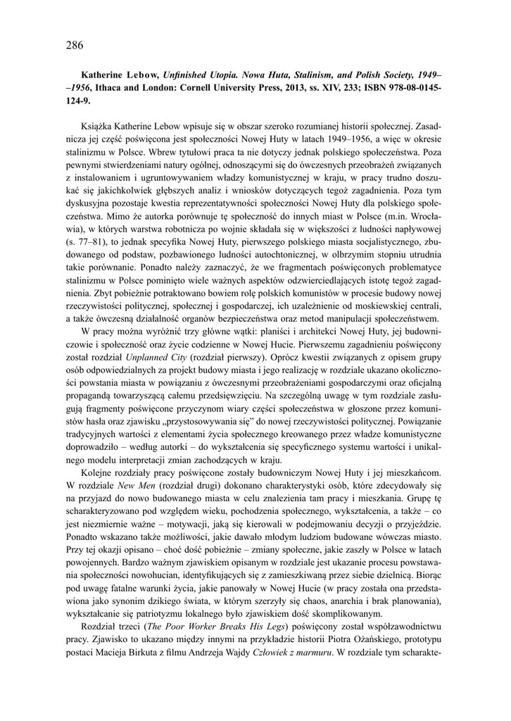 286 Katherine Lebow, Unfinished Utopia. Nowa Huta, Stalinism, and Polish Society, 1949– –1956, Ithaca and London: Cornell University Press, 2013, ss. XIV, 233; ISBN 978-08-0145124-9. Książka Katherine Lebow wpisuje się w obszar szeroko rozumianej historii społecznej. Zasadnicza jej część poświęcona jest społeczności Nowej Huty w latach 1949–1956, a więc w okresie stalinizmu w Polsce. Wbrew tytułowi praca ta nie dotyczy jednak polskiego społeczeństwa. Poza pewnymi stwierdzeniami natury ogólnej, odnoszącymi się do ówczesnych przeobrażeń związanych z instalowaniem i ugruntowywaniem władzy komunistycznej w kraju, w pracy trudno doszukać się jakichkolwiek głębszych analiz i wniosków dotyczących tegoż zagadnienia. Poza tym dyskusyjna pozostaje kwestia reprezentatywności społeczności Nowej Huty dla polskiego społeczeństwa. Mimo że autorka porównuje tę społeczność do innych miast w Polsce (m.in. Wrocławia), w których warstwa robotnicza po wojnie składała się w większości z ludności napływowej (s. 77–81), to jednak specyfika Nowej Huty, pierwszego polskiego miasta socjalistycznego, zbudowanego od podstaw, pozbawionego ludności autochtonicznej, w olbrzymim stopniu utrudnia takie porównanie. Ponadto należy zaznaczyć, że we fragmentach poświęconych problematyce stalinizmu w Polsce pominięto wiele ważnych aspektów odzwierciedlających istotę tegoż zagadnienia. Zbyt pobieżnie potraktowano bowiem rolę polskich komunistów w procesie budowy nowej rzeczywistości politycznej, społecznej i gospodarczej, ich uzależnienie od moskiewskiej centrali, a także ówczesną działalność organów bezpieczeństwa oraz metod manipulacji społeczeństwem. W pracy można wyróżnić trzy główne wątki: planiści i architekci Nowej Huty, jej budowniczowie i społeczność oraz życie codzienne w Nowej Hucie. Pierwszemu zagadnieniu poświęcony został rozdział Unplanned City (rozdział pierwszy). Oprócz kwestii związanych z opisem grupy osób odpowiedzialnych za projekt budowy miasta i jego realizację w rozdziale ukazano okoliczności powstania miasta w powiązaniu z ówczesnymi przeobrażeniami gospodarczymi oraz oficjalną propagandą towarzyszącą całemu przedsięwzięciu. Na szczególną uwagę w tym rozdziale zasługują fragmenty poświęcone przyczynom wiary części społeczeństwa w głoszone przez komunistów hasła oraz zjawisku „przystosowywania się” do nowej rzeczywistości politycznej. Powiązanie tradycyjnych wartości z elementami życia społecznego kreowanego przez władze komunistyczne doprowadziło – według autorki – do wykształcenia się specyficznego systemu wartości i unikalnego modelu interpretacji zmian zachodzących w kraju. Kolejne rozdziały pracy poświęcone zostały budowniczym Nowej Huty i jej mieszkańcom. W rozdziale New Men (rozdział drugi) dokonano charakterystyki osób, które zdecydowały się na przyjazd do nowo budowanego miasta w celu znalezienia tam pracy i mieszkania. Grupę tę scharakteryzowano pod względem wieku, pochodzenia społecznego, wykształcenia, a także – co jest niezmiernie ważne – motywacji, jaką się kierowali w podejmowaniu decyzji o przyjeździe. Ponadto wskazano także możliwości, jakie dawało młodym ludziom budowane wówczas miasto. Przy tej okazji opisano – choć dość pobieżnie – zmiany społeczne, jakie zaszły w Polsce w latach powojennych. Bardzo ważnym zjawiskiem opisanym w rozdziale jest ukazanie procesu powstawania społeczności nowohucian, identyfikujących się z zamieszkiwaną przez siebie dzielnicą. Biorąc pod uwagę fatalne warunki życia, jakie panowały w Nowej Hucie (w pracy została ona przedstawiona jako synonim dzikiego świata, w którym szerzyły się chaos, anarchia i brak planowania), wykształcanie się patriotyzmu lokalnego było zjawiskiem dość skomplikowanym. Rozdział trzeci (The Poor Worker Breaks His Legs) poświęcony został współzawodnictwu pracy. Zjawisko to ukazano między innymi na przykładzie historii Piotra Ożańskiego, prototypu postaci Macieja Birkuta z filmu Andrzeja Wajdy Człowiek z marmuru. W rozdziale tym scharakte- 287 ryzowano także formy agitacji oraz konkretne efekty, jakie przyniósł ruch stachanowców w Nowej Hucie. Mimo dość wnikliwej analizy tych zagadnień zbyt pobieżnie potraktowano jednak kwestię politycznej kontroli nad realizacją zadań wytyczonych przez partię. W kolejnym rozdziale pracy (Women of Steel) dokonano analizy sytuacji kobiet pracujących i mieszkających w Nowej Hucie, zarówno w odniesieniu do ich działalności zawodowej, jak i roli, jaką spełniały w rodzinie. K. Lebow wykazała, że mimo pewnej emancypacji kobiet w dziedzinie zawodowej (praca zarobkowa) komunizm nie zmienił tradycyjnego postrzegania pozycji kobiety w sferze publicznej i prywatnej. Rozdział piąty (The Enlightenment of Kasza) ukazał Nową Hutę jako miejsce, w którym szerzyły się deprawacja, alkoholizm i prostytucja oraz rozwijały się ówczesne subkultury młodzieżowe (m.in. bikiniarze). Wykazano przy tym całkowite fiasko ówczesnych władz w dziedzinie kształtowania nowego społeczeństwa w nowym mieście. Klęska ta była w dużej mierze wynikiem nieskuteczności i prowizoryczności większości akcji podejmowanych przez władze w odniesieniu do mieszkańców Nowej Huty. Organizacja czasu wolnego nowohucian, zgodnie z oficjalną wizją tamtejszej społeczności jako ostoi proletariatu, nie mogła przynieść zadawalających efektów, chociażby z uwagi na niemal całkowicie nieatrakcyjną ofertę budowanych tam, w niewielkiej liczbie, instytucji kulturalnych (świetlice, teatr itp.). Przy opisie spędzania wolnego czasu zbyt pobieżnie potraktowano jednak wątek religii w życiu codziennym mieszkańców Nowej Huty. Kreowane przez władze miasto bez Boga było bowiem zamieszkiwane w zdecydowanej większości przez ludzi wierzących, co niewątpliwie kolidowało z oficjalną w