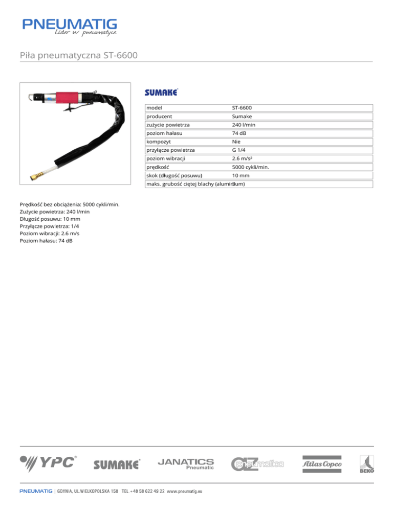 Piła pneumatyczna ST-6600 model ST-6600 producent Sumake zużycie powietrza 240 l/min poziom hałasu 74 dB kompozyt Nie przyłącze powietrza G 1/4″ poziom wibracji 2.6 m/s² prędkość 5000 cykli/min. skok (długość posuwu) 10 mm maks. grubość ciętej blachy (aluminium) 3 Prędkość bez obciążenia: 5000 cykli/min. Zużycie powietrza: 240 l/min Długość posuwu: 10 mm Przyłącze powietrza: 1/4″ Poziom wibracji: 2.6 m/s Poziom hałasu: 74 dB
