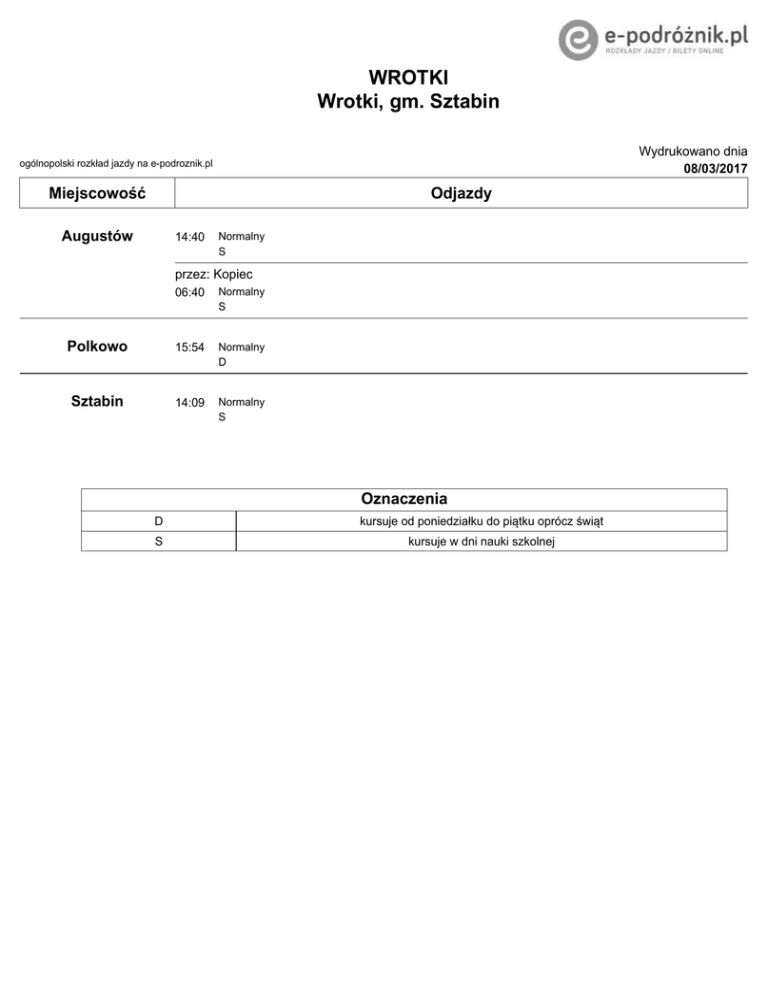 WROTKI Wrotki, gm. Sztabin Wydrukowano dnia 08/03/2017 ogólnopolski rozkład jazdy na e-podroznik.pl Miejscowość Odjazdy Augustów 14:40 Normalny S przez: Kopiec 06:40 Normalny S Polkowo 15:54 Normalny D Sztabin 14:09 Normalny S Oznaczenia D kursuje od poniedziałku do piątku oprócz świąt S kursuje w dni nauki szkolnej