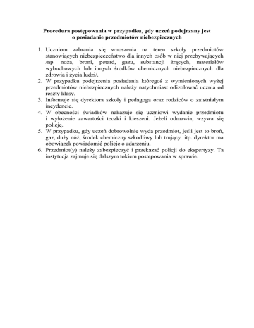 Procedura postępowania w przypadku, gdy uczeń podejrzany jest o posiadanie przedmiotów niebezpiecznych 1. Uczniom zabrania się wnoszenia na teren szkoły przedmiotów stanowiących niebezpieczeństwo dla innych osób w niej przebywających /np. noża, broni, petard, gazu, substancji żrących, materiałów wybuchowych lub innych środków chemicznych niebezpiecznych dla zdrowia i życia ludzi/. 2. W przypadku podejrzenia posiadania któregoś z wymienionych wyżej przedmiotów niebezpiecznych należy natychmiast odizolować ucznia od reszty klasy. 3. Informuje się dyrektora szkoły i pedagoga oraz rodziców o zaistniałym incydencie. 4. W obecności świadków nakazuje się uczniowi wydanie przedmiotu i wyłożenie zawartości teczki i kieszeni. Jeżeli odmawia, wzywa się policję. 5. W przypadku, gdy uczeń dobrowolnie wyda przedmiot, jeśli jest to broń, gaz, duży nóż, środek chemiczny szkodliwy lub trujący itp. dyrektor ma obowiązek powiadomić policję o zdarzeniu. 6. Przedmiot(y) należy zabezpieczyć i przekazać policji do ekspertyzy. Ta instytucja zajmuje się dalszym tokiem postępowania w sprawie.