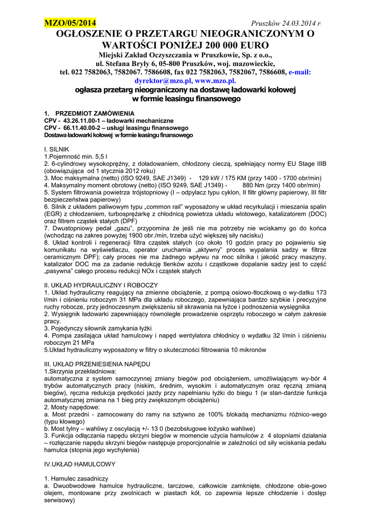 MZO/05/2014 Pruszków 24.03.2014 r. OGŁOSZENIE O PRZETARGU NIEOGRANICZONYM O WARTOŚCI PONIŻEJ 200 000 EURO Miejski Zakład Oczyszczania w Pruszkowie, Sp. z o.o., ul. Stefana Bryły 6, 05-800 Pruszków, woj. mazowieckie, tel. 022 7582063, 7582067. 7586608, fax 022 7582063, 7582067, 7586608, e-mail: [email protected], www.mzo.pl. ogłasza przetarg nieograniczony na dostawę ładowarki kołowej w formie leasingu finansowego 1. PRZEDMIOT ZAMÓWIENIA CPV - 43.26.11.00-1 – ładowarki mechaniczne CPV - 66.11.40.00-2 – usługi leasingu finansowego Dostawa ładowarki kołowej w formie leasingu finansowego I. SILNIK 1.Pojemność min. 5,5 l 2. 6-cylindrowy wysokoprężny, z doładowaniem, chłodzony cieczą, spełniający normy EU Stage IIIB (obowiązująca od 1 stycznia 2012 roku) 3. Moc maksymalna (netto) (ISO 9249, SAE J1349) - 129 kW / 175 KM (przy 1400 - 1700 obr/min) 4. Maksymalny moment obrotowy (netto) (ISO 9249, SAE J1349) 880 Nm (przy 1400 obr/min) 5. System filtrowania powietrza trójstopniowy (I – odpylacz typu cyklon, II filtr główny papierowy, III filtr bezpieczeństwa papierowy) 6. Silnik z układem paliwowym typu „common rail” wyposażony w układ recyrkulacji i mieszania spalin (EGR) z chłodzeniem, turbosprężarkę z chłodnicą powietrza układu wlotowego, katalizatorem (DOC) oraz filtrem cząstek stałych (DPF) 7. Dwustopniowy pedał „gazu”, przypomina że jeśli nie ma potrzeby nie wciskamy go do końca (wchodząc na zakres powyżej 1900 obr./min, trzeba użyć większej siły nacisku) 8. Układ kontroli i regeneracji filtra cząstek stałych (co około 10 godzin pracy po pojawieniu się komunikatu na wyświetlaczu, operator uruchamia „aktywny” proces wypalania sadzy w filtrze ceramicznym DPF); cały proces nie ma żadnego wpływu na moc silnika i jakość pracy maszyny, katalizator DOC ma za zadanie redukcję tlenków azotu i cząstkowe dopalanie sadzy jest to część „pasywna” całego procesu redukcji NOx i cząstek stałych II. UKŁAD HYDRAULICZNY I ROBOCZY 1. Układ hydrauliczny reagujący na zmienne obciążenie, z pompą osiowo-tłoczkową o wy-datku 173 l/min i ciśnieniu roboczym 31 MPa dla układu roboczego, zapewniająca bardzo szybkie i precyzyjne ruchy robocze, przy jednoczesnym zwiększeniu sił skrawania na łyżce i podnoszenia wysięgnika 2. Wysięgnik ładowarki zapewniający równoległe prowadzenie osprzętu roboczego w całym zakresie pracy. 3. Pojedynczy siłownik zamykania łyżki 4. Pompa zasilająca układ hamulcowy i napęd wentylatora chłodnicy o wydatku 32 l/min i ciśnieniu roboczym 21 MPa 5.Układ hydrauliczny wyposażony w filtry o skuteczności filtrowania 10 mikronów III. UKŁAD PRZENIESIENIA NAPĘDU 1.Skrzynia przekładniowa: automatyczna z system samoczynnej zmiany biegów pod obciążeniem, umożliwiającym wy-bór 4 trybów automatycznych pracy (niskim, średnim, wysokim i automatycznym oraz ręczną zmianą biegów), ręczna redukcja prędkości jazdy przy napełnianiu łyżki do biegu 1 (w stan-dardzie funkcja automatycznej zmiana na 1 bieg przy zwiększonym obciążeniu) 2. Mosty napędowe: a. Most przedni - zamocowany do ramy na sztywno ze 100% blokadą mechanizmu różnico-wego (typu kłowego) b. Most tylny – wahliwy z oscylacją +/- 13 0 (bezobsługowe łożysko wahliwe) 3. Funkcja odłączania napędu skrzyni biegów w momencie użycia hamulców z 4 stopniami działania – rozłączanie napędu skrzyni biegów następuje proporcjonalnie w zależności od siły wciskania pedału hamulca (stopnia jego wychylenia) IV.UKŁAD HAMULCOWY 1. Hamulec zasadniczy a. Dwuobwodowe hamulce hydrauliczne, tarczowe, całkowicie zamknięte, chłodzone obie-gowo olejem, montowane przy zwolnicach w piastach kół, co zapewnia lepsze chłodzenie i dostęp serwisowy) b. Przy każdym kole zamontowany mechaniczny czujnik zużycia tarcz hamulcowych c. Automatyczny test skuteczności siły hamowania w układzie monitorowania w kabinie z komunikatami w języku polskim 2. Hamulec postojowy a. Tarczowy, suchy, zamontowany na wale wyjściowym skrzyni przekładniowej, załącza się automatycznie po zgaszeniu silnika V.UKŁAD SKRĘTU 1. Reagujący na zmienne obciążenie układ hydrostatyczny, z priorytetowym zasilaniem z pompy osiowo-tłoczkowej o zmiennym wydatku z układu roboczego 2. Skręt ramy przegubowej ± 40o realizowany za pomocą dwóch siłowników dwustronnego działania 3. Awaryjny napęd układu skrętu uruchamiany automatycznie (zasilanie pompy wspomagają-cej silnikiem elektrycznym) VI. DANE OGÓLNE 1.Masa robocza - min.15 000 KG a. Wysokość transportowa – min. 3 000 mm b. Szerokość transportowa bez łyżki - max 2 500 mm 2.Kabina i wyposażenie a. Kabina spełniająca normy ROPS i FOPS. Filtr kabiny z wkładem węglowym dwustopniowy z wentylacją utrzymują lekkie nadciśnienie powietrza, co zapobiega przedostawaniu się kurzu do wnętrza b. Zdalny system monitorowanie pracy maszyny satelitarny lub GSM z możliwością dostępu przez internet. c. Układ monitorowania maszyny z wyświetlaczem w kabinie i informacją w języku polskim, oprócz informacji o wszystkich podzespołach maszyny pokazuje również zużycie paliwa i ilość cykli roboczych. d. Klimatyzacja kabiny operatora z automatycznym sterowaniem e. Poziom hałasu w kabinie nie przekracza 68 dB (A), wg ISO 6396/SAE J2105 f. Ergonomiczny fotel operatora z wielopozycyjną regulacją, pneumatycznym zawieszeniem, podgrzewaniem, wyposażony w zwijany pas bezpieczeństwa szerokości 50 mm g. Zmiana kierunku jazdy i biegów w jednej dźwigni przy kierownicy lub przełącznikiem na prawej konsoli sterowania h. Elektrohydrauliczne sterowanie ruchami maszyny za pośrednictwem dwóch krótkich dźwigienek na prawej konsoli i. Automatyczne ustawianie i programowanie przez operatora wysokości podnoszenia wysięgnika, poziomowania łyżki oraz funkcji tzw. „powrotu do kopania” czyli powrotu do pozycji dolnej łyżki j. Lusterka zewnętrzne k. Wycieraczka sz