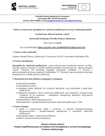 Ośrodek Pomocy Społecznej w Czerwonce Czerwonka 38A, 06-232 Czerwonka tel./fax. 029 7179824, e-mail: [email protected], [email protected] Nabór na stanowisko specjalista ds. zamówień publicznych na rzecz realizacji projektu systemowego „Razem możemy więcej” Kierownik Gminnego Ośrodka Pomocy Społecznej OGŁASZA NABÓR NA STANOWISKO SPECJALISTA DS. ZAMÓWIEŃ PUBLICZNYCH 1. Nazwa i adres jednostki: Gminny Ośrodek Pomocy Społecznej w Czerwonce, 06-232 Czerwonka włościańska 38A 2. Forma zatrudnienia: Specjalista ds. zamówień publicznych – praca wykonywana na podstawie umowy cywilnoprawnej (umowa zlecenie) w ramach realizacji projektu systemowego pn. „Razem możemy więcej”. Priorytet VII Promocja integracji społecznej, Działanie 7.1 Rozwój i upowszechnianie aktywnej integracji, Poddziałanie 7.1.1 Rozwój i upowszechnianie aktywnej integracji przez ośrodki pomocy społecznej. 3. Kandydaci powinni spełniać następujące wymagania: • obywatelstwo polskie • wykształcenie wyższe • posiadanie pełnej zdolności do czynności prawnych, oraz korzystanie z pełni praw publicznych • znajomość przepisów: Prawo zamówień publicznych oraz przepisów wykonawczych wydanych na jej podstawie – umiejętność interpretacji przepisów dotyczących zamówień publicznych • samodzielność i dobra organizacja pracy • doświadczenie w przeprowadzaniu procedury zamówień publicznych- 2 lata 4. Zakres działań: • udział w wykonywaniu zadań i czynności w zakresie formalno-prawnego przygotowywania i przeprowadzania postępowań o udzielenie zamówień publicznych, • sporządzanie umów o zamówienie publiczne, • udział w pracach komisji przetargowej, „Razem możemy więcej” Projekt współfinansowany ze środków Unii Europejskiej w ramach Europejskiego Funduszu Społecznego Ośrodek Pomocy Społecznej w Czerwonce Czerwonka 38A, 06-232 Czerwonka tel./fax. 029 7179824, e-mail: [email protected], [email protected] • prowadzenie korespondencji (odpowiedzi na zapytania, zawiadomienia, pisma wynikające z procedur odwoławczych itp.), • ocena formalno-prawna składanych ofert (weryfikacja prawidłowości i kompletności dokumentacji przetargowej sporządzonej w postępowaniach o zamówienie publiczne), • sporządzanie opinii prawnych dotyczących zamówień publicznych, • udział w opracowywaniu wzorów dokumentacji stosowanych w Dziale Zamówień Publicznych. 5. Wymagane dokumenty: • aktualne CV • list motywacyjny • kserokopie dyplomów potwierdzających wykształcenie oraz kserokopie zaświadczeń o ukończonych kursach i szkoleniach • oświadczenie o niekaralności następującej treści: „Oświadczam, że nie byłem/am karany/a za przestępstwo popełnione umyślnie i nie toczy się przeciwko mnie postępowanie karne. Oświadczam, że posiadam pełną zdolność do czynności prawnych i korzystam z pełni praw publicznych (zgodnie z art. 6 ust. 3 pkt. 2 ustawy o pracownikach samorządowych/Dz. U. z 2008 r. Nr 223 poz. 14580. • oświadczenie dotyczące zgody na przetwarzanie danych osobowych o treści: „ Wyrażam zgodę na przetwarzanie danych osobowych zawartych w ofercie pracy dla potrzeb niezbędnych do realizacji procesu rekrutacji na stanowisko specjalisty ds. zamówień publicznych na rzecz realizacji projektu systemowego „Aktywizacja społeczno-zawodowa bezrobotnych jako sposób zapobiegania wykluczeniu społecznemu”, zgodnie z ustawą z dnia 29.08.1997r. o ochronie danych osobowych (tekst jednolity Dz. U. z 2008 r. Nr. 223, poz. 1458)” 6. Miejsce i termin składania dokumentów: Wymagane dokumenty aplikacyjne należy składać osobiście lub korespondencyjnie, w zamkniętej kopercie, w terminie do dnia 28.05.2014r. do godziny 14.00 na adres: Gminny Ośrodek Pomocy Społecznej w Czerwonce, 06-232 Czerwonka Włościańska 38A z dopiskiem: „specjalista ds. zamówień publicznych”. Aplikacje, które wpłyną do Gminnego Ośrodka Pomocy Społecznej w Czerwonce po wyżej określonym terminie nie będą rozpatrywane. Informacja o wyniku naboru będzie umieszczona na tablicy ogłoszeń GOPS Czerwonka. „Razem możemy więcej” Projekt współfinansowany ze środków Unii Europejskiej w ramach Europejskiego Funduszu Społecznego