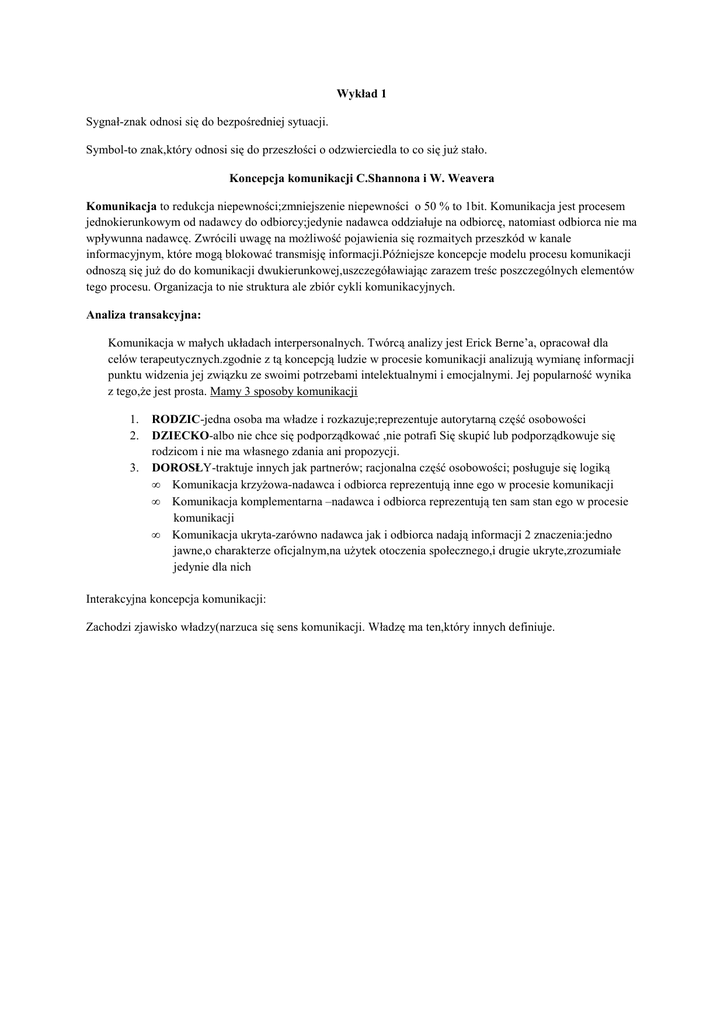 Wykład 1 Sygnał-znak odnosi się do bezpośredniej sytuacji. Symbol-to znak,który odnosi się do przeszłości o odzwierciedla to co się juŜ stało. Koncepcja komunikacji C.Shannona i W. Weavera Komunikacja to redukcja niepewności;zmniejszenie niepewności o 50 % to 1bit. Komunikacja jest procesem jednokierunkowym od nadawcy do odbiorcy;jedynie nadawca oddziałuje na odbiorcę, natomiast odbiorca nie ma wpływunna nadawcę. Zwrócili uwagę na moŜliwość pojawienia się rozmaitych przeszkód w kanale informacyjnym, które mogą blokować transmisję informacji.Późniejsze koncepcje modelu procesu komunikacji odnoszą się juŜ do do komunikacji dwukierunkowej,uszczegóławiając zarazem treśc poszczególnych elementów tego procesu. Organizacja to nie struktura ale zbiór cykli komunikacyjnych. Analiza transakcyjna: Komunikacja w małych układach interpersonalnych. Twórcą analizy jest Erick Berne’a, opracował dla celów terapeutycznych.zgodnie z tą koncepcją ludzie w procesie komunikacji analizują wymianę informacji punktu widzenia jej związku ze swoimi potrzebami intelektualnymi i emocjalnymi. Jej popularność wynika z tego,Ŝe jest prosta. Mamy 3 sposoby komunikacji 1. 2. 3. RODZIC-jedna osoba ma władze i rozkazuje;reprezentuje autorytarną część osobowości DZIECKO-albo nie chce się podporządkować ,nie potrafi Się skupić lub podporządkowuje się rodzicom i nie ma własnego zdania ani propozycji. DOROSŁY-traktuje innych jak partnerów; racjonalna część osobowości; posługuje się logiką • Komunikacja krzyŜowa-nadawca i odbiorca reprezentują inne ego w procesie komunikacji • Komunikacja komplementarna –nadawca i odbiorca reprezentują ten sam stan ego w procesie komunikacji • Komunikacja ukryta-zarówno nadawca jak i odbiorca nadają informacji 2 znaczenia:jedno jawne,o charakterze oficjalnym,na uŜytek otoczenia społecznego,i drugie ukryte,zrozumiałe jedynie dla nich Interakcyjna koncepcja komunikacji: Zachodzi zjawisko władzy(narzuca się sens komunikacji. Władzę ma ten,który innych definiuje. Akcjonaty Wacławika: 1. Nie moŜna nie komunikować 2. KaŜda komunikacja jest digitalna(cyfrowa) i kontekstualna(zaleŜna od kontekstu sytuacji) 3. KaŜda komunikacja ma zarówno zawartość jak i stosunek(znaki interpunkcyjne). KaŜdy komunikat jest do kogoś skierowany 4. Kazda reakcja jest jednocześnie prowokacją 5. KaŜda komunikacja jest albo komplementarna(obie strony są partnerami i kaŜda ze stron moŜe zakwestionować decyzje) albo symetryczna (jedna ze stron narzuca sens komunikacji) Wykład 2 Postawy zachowań indywidualnych: • • Osobowośćwartości,emocje,wiedza->zachowania->postawa Sytuacja(czynniki zewnętrzne determinują jak się zachować)wynalazcą pojęcia był Zygmund Freud OSOBOWOŚĆ-składa się z: • Ego-ja • Id-to ono • Superego- uzewnętrznione nakazy moralno-prawne. OSOBOWOŚĆ: 1. WG Freuda- człowiek działa nieracjonalnie,sam się często oszukuje 2. Behawioryzm- człowiek to osoba,która nabywa nawyki;to jednostka,która adoptuje się do środowiska. Zakład się Ŝe człowiek reaguje na nagrody i kary. Gdy jest nagradzany to powtarza swe zachowanie. Gdy jest karany to zaniechuje swe zachowanie;waŜna jest konsekwencja zachowania. Kara i nagroda jest postrzegana przez pryzmat kultury. Kiedy kara zanika to negatywne zachowanie powraca. Nagroda „wycisza” złe zachowanie i jest bardziej skuteczna niŜ kara. Konsekwencje zachowania są zawsze dwoiste. Kryteria sprawdzania zachowania: -jeśli zachowanie negatywne utrzymuje się w długim okresie to pytamy:Jakie nagrody zaniechają temu zachowaniu? 3. Koncepcja kognitywno-poznawcza- człowiek minimalizuje straty a maksymalizuje zyski. Dobiera cel do posiadanych zasobów lub dobiera optymalne nakłady by zrealizować cel. Człowiek ekonomiczny. Człowiek stara się odkryć prawdę o swojej sytuacji. Człowiek jest racjonalny. POSTAWA1. Behawioralyzm-względnie stała skłonność do oceny zachowań. Postawa to reakcja na zachowanie. Człowiek pracuje by zaspokoić swoje potrzeby,dąŜy do samorealizacji LUDZKA POTRZEBA1) Koncepcja prakseologiczna- Abraham Maslov twierdzi Ŝe potrzeby mają charakter hierarchiczny. Człowiek zaspokaja wszystkie potrzeby w środowisku pracy. Jeśli nie zaspokaja potrzeb, nie ma motywacji do pracy. 2) A. Schutz- to co człowiek robi wynika z jego faz zycia. Fundamentalną potrzebą człowieka jest bezpieczeństwo *koncepcja FIRO: a)musimy przynaleŜeć(aktywnie lub biernie) b)musimy mieć kontrolę nad sytuacją(aktywnie lub biernie) c) potrzeba afektywna-równowaga o charakterze emocjonalnym *teorie średniego zasięgu-oceny ludzkich zachowań: a)proces atrybucji-to gdy przypisujemy komuś jakieś cechy,atrybuty,których on nie posiada(wg.Heidera);mamy przyczyna wewnętrzne i zewnętrzne; atrybucja pojawia się tam gdzie mamy nadmiar informacji b)Leon Festinger- dysonans poznawczy- gdy jesteśmy w sytuacji z której są 2 wyjścia ale oba są złe. Staramy się wybrnąć z tej sytuacji, Ŝe „atakujemy” jedno wyjście;zgodnie z tą teorią ludzie dąŜą do unikania stanu wątpliwości. Stwierdzenie sprzeczności między poznawanymi faktami lub opiniami okazuje się być irytujące-czyli szkodliwe dla jednostki. Człowiek Ŝle postrzega rzeczywistośc i źle pracuje. Człowiek odczuwający dysonans poznawczy moŜe zareagować: -zmienić swój dotychczasowy pogląd -zignorować bodziec -zlekcewaŜyć źródło bodźca -wycofać się całkowicie z sytuacji komunikacyjnej c) umiejscowienie kontroli-wewnątrz lub zewnątrz d)stopień makiawelizmu- cel uświęca środki e)stopień autorytaryzmu-ktoś kto się „rozpłaszcza”przed władzą. TEORIE MOTYWACJI: 1) Teoria X- D. McGregor w ksiąŜce opublikowanej w 1960 roku pt. "The Human Side of Enterprise" zestawił załoŜenia określające istotę człowieka występujące w nauce o organizacji w dwóch zbiorach i nazwał je teoriami X i Y. 1) Przeciętna istota ludzka 