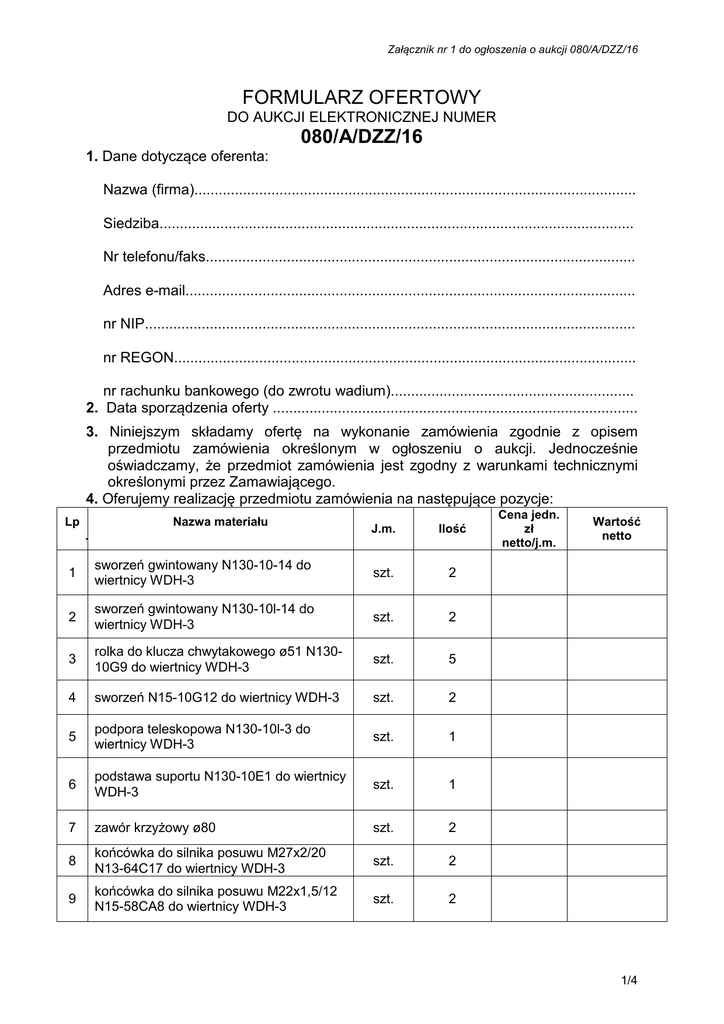 Załącznik nr 1 do ogłoszenia o aukcji 080/A/DZZ/16 FORMULARZ OFERTOWY DO AUKCJI ELEKTRONICZNEJ NUMER 080/A/DZZ/16 1. Dane dotyczące oferenta: Nazwa (firma)............................................................................................................. Siedziba..................................................................................................................... Nr telefonu/faks.......................................................................................................... Adres e-mail............................................................................................................... nr NIP......................................................................................................................... nr REGON.................................................................................................................. nr rachunku bankowego (do zwrotu wadium)............................................................ 2. Data sporządzenia oferty .......................................................................................... 3. Niniejszym składamy ofertę na wykonanie zamówienia zgodnie z opisem przedmiotu zamówienia określonym w ogłoszeniu o aukcji. Jednocześnie oświadczamy, że przedmiot zamówienia jest zgodny z warunkami technicznymi określonymi przez Zamawiającego. 4. Oferujemy realizację przedmiotu zamówienia na następujące pozycje: Lp Nazwa materiału . J.m. Ilość 1 sworzeń gwintowany N130-10-14 do wiertnicy WDH-3 szt. 2 2 sworzeń gwintowany N130-10l-14 do wiertnicy WDH-3 szt. 2 3 rolka do klucza chwytakowego ø51 N13010G9 do wiertnicy WDH-3 szt. 5 4 sworzeń N15-10G12 do wiertnicy WDH-3 szt. 2 5 podpora teleskopowa N130-10l-3 do wiertnicy WDH-3 szt. 1 6 podstawa suportu N130-10E1 do wiertnicy WDH-3 szt. 1 7 zawór krzyżowy ø80 szt. 2 8 końcówka do silnika posuwu M27x2/20 N13-64C17 do wiertnicy WDH-3 szt. 2 9 końcówka do silnika posuwu M22x1,5/12 N15-58CA8 do wiertnicy WDH-3 szt. 2 Cena jedn. zł netto/j.m. Wartość netto 1/4 Załącznik nr 1 do ogłoszenia o aukcji 080/A/DZZ/16 Lp Nazwa materiału . J.m. Ilość 10 końcówka do silnika posuwu M12x1,5/10 N15-55CD28 do wiertnicy WDH-3 szt. 2 11 końcówka do silnika posuwu M14x1,5/10 N130-10-57 do wiertnicy WDH-3 szt. 2 12 końcówka do silnika posuwu M22x1,5/12 (L-75) N130-10-61 do wiertnicy WDH-3 szt. 2 13 klucz 41 G14-9-15/1 do ręcznego rozkręcania żerdzi ø51 do wiertnicy WDH3 szt. 2 14 dwuzłączka z sitkiem G1"/"25" N1364A27/A do wiertnicy WDH-3 szt. 1 15 krążek G14-32E6A do wiertnicy WDH-3 szt. 2 16 zbiornik cementacyjny ø150 kat.ZUM OWP 1201 do wiertnicy EDH-3 szt. 2 17 kostka klucza chwytakowego N15-10G4B do wiertnicy WDP-1C szt. 2 18 korek M12x1,5 N15-10B32D do wiertnicy WDH-3 szt. 2 19 korek M12x1,5 DIN 910(BN 439) do wiertnicy WDH-3 szt. 2 20 korek M27x2 DIN 910(BN 439) do wiertnicy WDH-3 szt. 2 korek M22x1,5 DIN 910(BN439) do wiertnicy WDH-3 szt. 2 22 korek odpowietrzający N15-10D47 do wiertnicy WDH-3 szt. 2 23 uszczelka N130-10A22 do wiertnicy WDH3 szt. 2 24 pierścień uszczelniający B20/35x10 PN81/M-86960 do wiertnicy WDH-3 szt. 5 25 nakrętka N130-10B7 do wiertnicy WDH-3 szt. 2 21 Cena jedn. zł netto/j.m. Wartość netto 2/4 Załącznik nr 1 do ogłoszenia o aukcji 080/A/DZZ/16 Lp Nazwa materiału . J.m. Ilość 26 pierścień uszczelniający A48/62x8 PN72/M-86964 do wiertnicy WDH-3 szt. 5 27 pokrywa N130-10B8/A do wiertnicy WDH3 szt. 2 28 uszczelka ø45/58x5 kat.CBKLT nr 10 do wiertnicy WDH-3 szt. 5 29 podkładka regulacyjna N15-10E13 do wiertnicy WDH-3 szt. 24 30 śruba dociskowa F-M12x45-33H PN87/M-82307 do wiertnicy WDH-3 szt. 24 31 listwa prowadząca N15-10E3 do wiertnicy WDH-3 szt. 2 listwa prowadząca N15-10E5 do wiertnicy WDH-3 szt. 2 33 podkładka odginana 13 PN-82/M-82021 do wiertnicy WDH-3 szt. 20 34 smarowniczka M10x1 PN-76/M-86007 do wiertnicy WDH-3 szt. 4 35 podkładka zabezpieczająca N15-10G14/A do wiertnicy WDH-3 szt. 2 36 pierścień uszczelniający 2-70-I-19,3x2,4 do wiertnicy WDH-3 szt. 2 37 rozdzielacz N15-10H4/A do wiertnicy WDP-1C szt. 1 38 rozdzielacz N15-10H5 do wiertnicy WDP1C szt. 1 39 mechanizm sterowania posuwem N15-3216D do wiertnicy WDP-1C szt. 1 40 sworzeń N13-64G11 do wiertnicy WDP1C szt. 2 41 sworzeń N15-10G12 do wiertnicy WDP1C szt. 2 32 Cena jedn. zł netto/j.m. Wartość netto 3/4 Załącznik nr 1 do ogłoszenia o aukcji 080/A/DZZ/16 Lp Nazwa materiału . J.m. Ilość 42 pokrywa N15-10A40 do wiertnicy WDP-1C szt. 1 43 zderzak N15-32-15/A do wiertnicy WDP1C szt. 1 44 pierścień dystansowy N15-10A41 do wiertnicy WDP-1C szt. 2 Cena jedn. zł netto/j.m. Wartość netto Razem wartość netto: 5. Niniejszym udzielamy …………. miesięcy gwarancji jakości oferowanych materiałów. ………………………………… Miejscowość, data …………………………… Podpis upoważnionej osoby 4/4