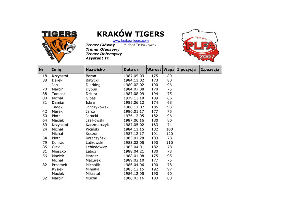 KRAKÓW TIGERS www.krakowtigers.com Trener Główny Michał Truszkowski Trener Ofensywy Trener Defensywy Asystent Tr. Nr 18 38 70 88 80 81 42 50 64 89 24 34 79 85 31 56 82 32 Imię Nazwisko Data ur. Krzysztof Darek Jan Marcin Tomasz Michał Damian Tadek Marek Piotr Maciek Krzysztof Michał Michał Piotr Konrad Olek Mieszko Maciek Michał Przemek Rysiek Maciek Marcin Baran Batycki Dierking Dybus Dziura Gibas Iskra Janczykowski Jarco Jarocki Jasikowski Kaczmarczyk Kiciński Koczur Krzaczyński Latkowski Lebiedowicz Łabuz Marosz Mazurek Michalik Mihułka Miksztal Mucha 1987.05.03 1984.11.02 1980.02.02 1984.07.08 1987.08.09 1979.12.10 1985.06.12 1988.11.07 1986.01.17 1976.12.05 1987.06.16 1987.05.02 1984.11.15 1987.12.17 1983.01.28 1983.02.05 1983.04.01 1988.04.21 1988.01.08 1989.02.10 1986.04.06 1985.12.15 1986.12.05 1986.03.16 Wzrost Waga 1.pozycja 175 173 190 178 194 189 174 185 177 182 180 183 182 191 183 190 182 180 175 177 190 192 190 183 80 80 96 75 75 86 68 93 75 96 80 74 100 120 78 110 78 73 95 75 78 97 90 80 2.pozycja 55 62 51 86 96 69 19 60 77 53 44 16 83 68 15 11 Kamil Łukasz Jakub Zbigniew Michał Paweł John Marek Paweł Łukasz Michał Maciek Bartek Bartek Grzegorz Marcin Grzesiek Damian Murdza Niedzielski Niepsuj Przetacznik Rusin Rusin Skulski Spólnik Szefer Szewczyk Truszkowski Turzański Wardęga Wójcicki Woźniak Zając Zimmer Zych 1986.08.15 1983 .07.01 1984.09.18 1984.04.29 1988.02.14 1986.01.16 1982.01.06 1984.09.25 1988.04.27 1984.03.13 1986.07.26 1987.04.26 1985.04.14 1985.06.12 1986.07.09 1986.01.06 1985.05.13 1987.12.08 178 187 192 176 178 178 167 174 178 180 195 183 175 192 180 176 180 170 94 98 105 73 77 76 75 95 89 85 112 95 71 85 80 80 110 75