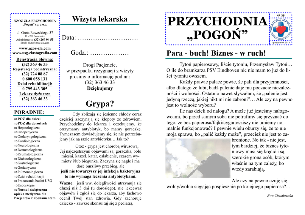 NZOZ ZLA PRZYCHODNIA „Pogoń” sp. z o.o. Wizyta lekarska ul. Grota Roweckiego 37 41 - 200 Sosnowiec Administracja: (32) 269 04 55 Data: ………………………. PRZYCHODNIA „POGOŃ” 1 październik 2013 Email: [email protected] www.nzoz-zla.com www.usg-elastografia.com Rejestracja główna: (32) 363 46 33 Rejestracja pediatryczna: (32) 724 08 87 0 600 058 131 Dział rehabilitacji: 0 795 443 305 Lekarz dyżurny: (32) 363 46 33 PORADNIE: ⇒POZ dla dzieci ⇒POZ dla dorosłych ⇒Hepatologiczna ⇒Ortopedyczna ⇒Otolaryngologiczna ⇒Kardiologiczna ⇒Neurologiczna ⇒Dermatologiczna ⇒Reumatologiczna ⇒Diabetologiczna ⇒Gastrologiczna ⇒Geriatryczna ⇒Pulmonologiczna ⇒Dział rehabilitacji ⇒Pracowania badań USG ⇒Endoskopie ⇒Nocna i świąteczna opieka medyczna dla Pacjentów z abonamentem NR 35 Godz.: ……………… Drogi Pacjencie, w przypadku rezygnacji z wizyty prosimy o informację pod nr.: (32) 363 46 33 Dziękujemy Grypa? Gdy zbliżają się jesienne chłody coraz częściej zaczynają się kłopoty ze zdrowiem. Przychodzimy do lekarza i oczekujemy, że otrzymamy antybiotyk, bo mamy gorączkę. Tymczasem dowiadujemy się, że nie potrzebujemy jak na razie antybiotyku… Jak to? Otóż - grypa jest chorobą wirusową. Jej najczęstszymi objawami są: gorączka, bóle mięśni, kaszel, katar, osłabienie, czasem wymioty i/lub biegunka. Zaczyna się nagle i ma dość burzliwy przebieg, ale jeśli nie towarzyszy jej infekcja bakteryjna to nie wymaga leczenia antybiotykami. Ważne: jeśli ww. dolegliwości utrzymują się dłużej niż 3 dni (u dorosłego), nie lekceważ objawów i zgłoś się do lekarza, aby fachowo ocenił Twój stan zdrowia. Gdy zachoruje dziecko - zawsze skonsultuj się z pediatrą. Para - buch! Biznes - w ruch! Tytoń papierosowy, liście tytoniu, Przemysław Tytoń… O ile do bramkarza PSV Eindhoven nic nie mam to już do liści tytoniu owszem. Każdy prawie palacz powie, że pali dla przyjemności, albo dlatego że lubi, bądź palenie daje mu poczucie niezależności i wolności. Ostatnio nawet słyszałam, że „palenie jest jedyną rzeczą, jakiej nikt mi nie zabroni”… Ale czy na pewno jest to wolność wyboru? Ile nas dzieli od nałogu? A może już jesteśmy nałogowcami, bo przed samym sobą nie potrafimy się przyznać do tego, że bez papierosa/fajki/cygara/sziszy nie umiemy normalnie funkcjonować? I pewnie wielu oburzy się, że to nie moja sprawa, bo „palić każdy może”, przecież nie jest to zabronione. No tak - nie jest, tym bardziej, że biznes tytoniowy musi się kręcić i są szerokie grona osób, którym właśnie na tym zależy, bo wtedy zarabiają. Ale czy na pewno czuję się wolny/wolna sięgając pospiesznie po kolejnego papierosa?... Ewa Chwałowska Biała sobota - 12 październik Serdecznie zapraszamy na profilaktyczne przesiewowe BADANIA USG: ⇒ SERCA (echo), ⇒ TARCZYCY, ⇒ TĘTNIC KRĘGOWYCH SZYI. dłowego przepływu w tych naczyniach, co może skutkować niedokrwieniem mózgu, zawrotami głowy. Zbliża się zima, a nasz organizm powoli zaczyna magazynować jakieś zbędne kilogramy. O nie! Ubieramy się nieco grubiej, ale i tak widać, że nasz sweterek jakoś nieciekawie zaczyna się opinać w okolicy brzucha. Hm… Chcesz coś z tym zrobić? Przyjdź do nas na zajęcia ruchowe, które odbywają się w czwartki o godz.18:00. Zapraszamy :) Dla Pacjentów posiadających ABONAMENT możliwość wyboru jednego z ww. badań BEZPŁATNIE. Bezpłatny Internet dla każdego Jeśli chcesz zaoszczędzić i zmniejszyć koszty korzystania z Internetu to podajemy receptę: Dla Pacjentów bez abonamentu - komercyjnie. Pamiętać należy, iż są to badania (w tym dniu jedna osoba może zapisać screeningowe i każda wykryta nieprawidłowość winna być dokładsię na jedno badanie) nie oceniona w czasie pełnego baDla kogo skierowane są ww. dania ultrasonograficznego, które badania profilaktyczne? będzie można wykonać w razie potrzeby w naszej nowej pracowni ⇒ USG serca - w celu wykryUSG zaopatrzonej z wysokospecia nadciśnienia tętniczego, cjalistyczny sprzęt z możliwością wad serca. ELASTOGRAFII zmian ogni⇒ USG tarczycy - w celu wyskowych (gł. w przypadku chorób krycia guzków tarczycy lub tarczycy). jej nieprawidłowego rozroZapisy na badania pod nr: stu (wole). 32 363 46 33 oraz w rejestracji ⇒ USG tętnic kręgowych szyi Przychodni. w celu wykrycia nieprawiStr. 2 „BODY FLIP” i już ! P R Z Y C H O D NI A „ PO G O Ń ” ⇒ wejdź na http://www.aero2.pl/bdi-2.html, ⇒ wypełnij Wniosek online, ⇒ wpłać 27zł za depozyt i wysyłkę, ⇒ wydrukuj i podpisz Wniosek, a następnie wyślij je wraz z kopią dowodu tożsamości i kopią wniesienia ww. opłat na adres podany na stronie www z dopiskiem „Bezpłatny Dostęp do Internetu", ⇒ czekaj na e-mail z Biura Obsługi Klienta informujący o wysyłce Twojej karty SIM, ⇒ po otrzymaniu karty SIM możesz bezpłatnie korzystać z Internetu do 21 grudnia 2016 r. Sprawdziliśmy - to działa ;) R O K 20 1 3 , NR 3 5 Str. 3