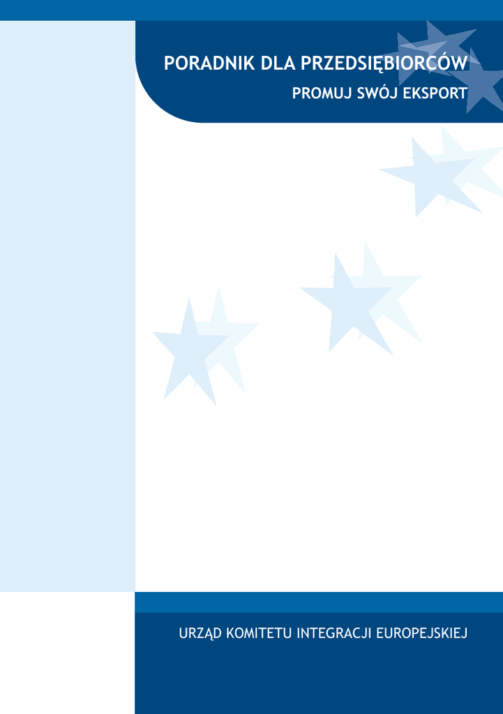 PORADNIK DLA PRZEDSIĘBIORCÓW PROMUJ SWÓJ EKSPORT URZĄD KOMITETU INTEGRACJI EUROPEJSKIEJ Wydawca URZĄD KOMITETU INTEGRACJI EUROPEJSKIEJ Al. Ujazdowskie 9, 00-918 Warszawa http://www.ukie.gov.pl e-mail: [email protected] we współpracy z Ministerstwem Gospodarki i Pracy Skład POLCEN Sp. z o.o. 00-503 Warszawa, ul. Żurawia 32/34 http://www.polcen.com.pl [email protected] Wydanie pierwsze — czerwiec 2004 ISBN 83-89218-98-4 Promuj swój eksport Dofinansowanie dla przedsiębiorstw uczestniczących w targach i wystawach za granicą oraz wyjazdowych misjach gospodarczych związanych z udziałem w targach i wystawach za granicą w ramach Sektorowego Programu Operacyjnego Wzrost Konkurencyjności Przedsiębiorstw (SPO-WKP) Co to jest SPO-WKP? Sektorowy Program Operacyjny „Wzrost konkurencyjności przedsiębiorstw, lata 2004-2006” znany pod hasłem UNIA DLA PRZEDSIĘBIORCZYCH — „PROGRAM KONKURENCYJNOŚĆ” to jeden z kluczowych dokumentów przygotowanych przez Polskę, przewidzianych w Narodowym Planie Rozwoju 2004-2006 i określających ramy wsparcia dla Polski z funduszy strukturalnych po przystąpieniu do Unii Europejskiej. Po przystąpieniu Polski do Unii Europejskiej polscy przedsiębiorcy stanęli przed nowym wyzwaniem. Z myślą o nich — by mogli dostosować się do reguł gry, które panują na Jednolitym Rynku Europejskim, podnieść swoją konkurencyjność i stać się atrakcyjnym partnerem dla potencjalnych klientów z Unii Europejskiej — przygotowano Sektorowy Program Operacyjny — Wzrost Konkurencyjności Przedsiębiorstw. Do kogo skierowany jest SPO-WKP? Sektorowy Program Operacyjny — Wzrost Konkurencyjności Przedsiębiorstw jest adresowany do instytucji otoczenia biznesu (priorytet 1. Programu) oraz do przedsiębiorców (priorytet 2. Programu). Kto może otrzymać dofinansowanie do projektu uczestnictwa w targach i wystawach za granicą oraz w wyjazdowych misjach gospodarczych związanych z udziałem w targach i wystawach za granicą? Przedsiębiorcy prowadzący działalność na terenie Polski. 3 I Wsparcie dla przedsiębiorstw uczestniczących w targach i wystawach za granicą Jakie projekty mogą uzyskać dofinansowanie? Pomoc jest udzielana na wsparcie udziału w targach i wystawach za granicą, znajdujących się w wykazie imprez targowo-wystawienniczych, które mają istotne znaczenie dla polskiej gospodarki. Wykaz ten jest ustalany na dany rok kalendarzowy i ogłaszany na stronach internetowych: www.konkurencyjnosc.gov.pl i www.eksporter.gov.pl oraz w dzienniku ogólnopolskim. Jaka jest wielkość dofinansowania projektów? n n n n 4 Wysokość dofinansowania nie może przekroczyć 50% poniesionych i udokumentowanych fakturami oraz dokumentami potwierdzającymi dokonanie płatności kosztów kwalifikowanych netto uczestnictwa w targach i wystawach i wynieść jednorazowo więcej niż 20 000 PLN. Do kosztów kwalifikowanych zalicza się koszty: 1) wynajęcia powierzchni wystawienniczej i zabudowy stoiska podczas imprezy targowo-wystawienniczej; 2) transportu eksponatów w związku z udziałem w imprezie targowo-wystawienniczej; 3) przygotowania i wydruku materiałów promocyjnych w związku z udziałem w imprezie targowo-wystawienniczej; 4) przejazdu i zakwaterowania przedstawicieli przedsiębiorcy uczestniczących w zagranicznych imprezach targowo-wystawienniczych do wysokości obowiązujących limitów ustalonych dla danego kraju na nocleg w hotelu oraz limity stawek w podróży samochodem z tytułu wyjazdu służbowego poza granicami kraju. Przy obliczaniu wysokości dofinansowania uwzględnia się koszty udziału maksymalnie dwóch przedstawicieli przedsiębiorcy w zagranicznej imprezie targowo-wystawienniczej. Przedsiębiorca może otrzymać w ciągu jednego roku dofinansowanie części kosztów kwalifikowanych uczestnictwa w maksymalnie pięciu targach i wystawach. Jakie są kryteria wyboru projektów? Wybór projektów ubiegających się o współfinansowanie dokonywany jest w ramach procedury konkursu i odbywa się według ściśle określonych kryteriów: KRYTERIA FORMALNE n terminowość złożenia wniosku, n wypełnienie wniosku zgodnie z załączoną do niego „Instrukcją wypełniania wniosku o pomoc finansową ze środków Europejskiego Funduszu Rozwoju Regionalnego” łącznie z podpisaną deklaracją projektodawcy, zamieszczoną we „Wniosku o pomoc finansową” (wzór wniosku wraz z instrukcją jest dostępny na stronach internetowych: www.konkurencyjnosc.gov.pl i www.eksporter.gov.pl); n do wniosku dołączyć należy komplet wskazanych dokumentów, tj.: — kopię zaświadczenia o wpisie do ewidencji działalności gospodarczej lub kopię odpisu z Krajowego Rejestru Sądowego (wystawionego nie wcześniej niż 6 miesięcy przed datą złożenia wniosku); — kopię zaświadczenia o nadaniu numeru identyfikacji w krajowym rejestrze podmiotów gospodarki narodowej REGON i kopię decyzji o nadaniu Numeru Identyfikacji Podatkowej; — zaświadczenie z ostatnich trzech miesięcy właściwego naczelnika urzędu skarbowego oraz właściwego oddziału Zakładu Ubezpieczeń Społecznych o niezaleganiu z należnościami wobec Skarbu Państwa; — kopię potwierdzenia wynajęcia powierzchni wystawienniczej; — kopie umów z wykonawcami usług, jeżeli umowy takie zostały zawarte; — kopie wszystkich zaświadczeń o pomocy de minimis1, jaką wnioskodawca otrzymał w ciągu 3. ostatnich lat poprzedzających datę wystąpienia z wnioskiem o dofinansowanie. Celem oceny formalnej jest wybranie wniosków, które zostaną poddane ocenie merytorycznej. W przypadku braku spełnienia kryteriów formalnych wniosek zostaje zwrócony do uzupełnienia w ciągu 7 dni od dnia wezwania przez oceniającego, a po tym okresie, o ile nie zostanie uzupełniony, zostaje ostatecznie odrzucony. Za kryteria formalne punktów nie przyznaje się, ale muszą być one wszystkie spełnione. KRYTERIA MERYTORYCZNE n trwałość projektu w czasie; n wielkość przedsię