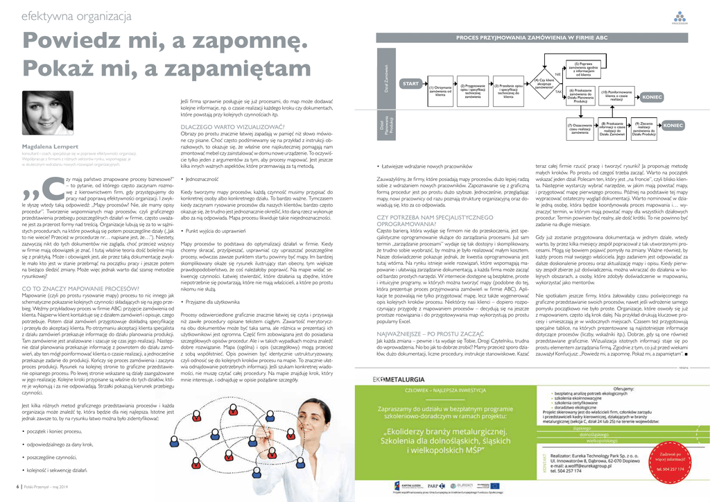 efektywna organizacja Jeśli firma sprawnie posługuje się już procesami, do map może dodawać kolejne informacje, np. o czasie realizacji każdego kroku czy dokumentach, które powstają przy kolejnych czynnościach itp. DLACZEGO WARTO WIZUALIZOWAĆ? Magdalena Lempert konsultant i coach, specjalizuje się w poprawie efektywności organizacji. Współpracuje z firmami z różnych sektorów rynku, wspomagając je w skutecznym wdrażaniu nowych rozwiązań organizacyjnych. „C zy mają państwo zmapowane procesy biznesowe?” – to pytanie, od którego często zaczynam rozmowę z kierownictwem firm, gdy przystępujemy do pracy nad poprawą efektywności organizacji. I zwykle słyszę wtedy taką odpowiedź: „Mapy procesów? Nie, ale mamy opisy procedur”. Tworzenie wspomnianych map procesów, czyli graficznego przedstawienia przebiegu poszczególnych działań w firmie, często uważane jest za przerost formy nad treścią. Organizacje lubują się za to w sążnistych procedurach, na które powołują się potem poszczególne działy („Jak to nie wiecie? Przecież w procedurze nr… napisane jest, że…”). Niestety, zazwyczaj nikt do tych dokumentów nie zagląda, choć przecież wszyscy w firmie mają obowiązek je znać. I tutaj właśnie teoria dość boleśnie mija się z praktyką. Może i obowiązek jest, ale przez taką dokumentację zwykle mało kto jest w stanie przebrnąć na początku pracy i jeszcze potem na bieżąco śledzić zmiany. Może więc jednak warto dać szansę metodzie rysunkowej? CO TO ZNACZY MAPOWANIE PROCESÓW? Mapowanie (czyli po prostu rysowanie mapy) procesu to nic innego jak schematyczne pokazanie kolejnych czynności składających się na jego przebieg. Weźmy przykładowy proces w firmie ABC: przyjęcie zamówienia od klienta. Najpierw klient kontaktuje się z działem zamówień i opisuje, czego potrzebuje. Potem dział zamówień przygotowuje dokładną specyfikację i przesyła do akceptacji klienta. Po otrzymaniu akceptacji klienta specjalista z działu zamówień przekazuje informację do działu planowania produkcji. Tam zamówienie jest analizowane i szacuje się czas jego realizacji. Następnie dział planowania przekazuje informację z powrotem do działu zamówień, aby ten mógł poinformować klienta o czasie realizacji, a jednocześnie przekazuje zadanie do produkcji. Kończy się proces zamówienia i zaczyna proces produkcji. Rysunek na kolejnej stronie to graficzne przedstawienie opisanego procesu. Po lewej stronie wskazane są działy zaangażowane w jego realizację. Kolejne kroki przypisane są właśnie do tych działów, które je wykonują i za nie odpowiadają. Strzałki pokazują kierunek przebiegu czynności. Obrazy po prostu znacznie łatwiej zapadają w pamięć niż słowo mówione czy pisane. Choć często podśmiewamy się na przykład z instrukcji obrazkowych, to okazuje się, że właśnie one najskuteczniej pomagają nam zmontować mebel czy zainstalować w domu nowe urządzenie. To oczywiście tylko jeden z argumentów za tym, aby procesy mapować. Jest jeszcze kilka innych ważnych aspektów, które przemawiają za tą metodą. • Jednoznaczność Kiedy tworzymy mapy procesów, każdą czynność musimy przypisać do konkretnej osoby albo konkretnego działu. To bardzo ważne. Tymczasem kiedy zaczynam rysowanie procesów dla naszych klientów, bardzo często okazuje się, że trudno jest jednoznacznie określić, kto daną rzecz wykonuje albo za nią odpowiada. Mapa procesu likwiduje takie niejednoznaczności. • Punkt wyjścia do usprawnień Mapy procesów to podstawa do optymalizacji działań w firmie. Kiedy chcemy skracać, przyśpieszać, usprawniać czy upraszczać poszczególne procesy, wówczas zawsze punktem startu powinny być mapy. Im bardziej skomplikowany okaże się rysunek ilustrujący stan obecny, tym większe prawdopodobieństwo, że coś należałoby poprawić. Na mapie widać sekwencję czynności. Łatwiej stwierdzić, które działania są zbędne, które niepotrzebnie się powtarzają, które nie mają właścicieli, a które po prostu nikomu nie służą. • Przyjazne dla użytkownika Procesy odzwierciedlone graficznie znacznie łatwiej się czyta i przyswaja niż zawiłe procedury opisane tekstem ciągłym. Zawartość merytoryczna obu dokumentów może być taka sama, ale różnica w prezentacji ich użytkownikowi jest ogromna. Część firm zobowiązana jest do posiadania szczegółowych opisów procedur. Ale i w takich wypadkach można znaleźć dobre rozwiązanie. Mapa (ogólna) i opis (szczegółowy) mogą przecież z sobą współistnieć. Opis powinien być identycznie ustrukturyzowany, czyli odnosić się do kolejnych kroków procesu na mapie. To znacznie ułatwia odnajdowanie potrzebnych informacji. Jeśli szukam konkretnej wiadomości, nie muszę czytać całej procedury. Na mapie znajduję krok, który mnie interesuje, i odnajduję w opisie pożądane szczegóły. Dział Zamówień NIE START (1) Otrzymanie zamówienia od klienta (2) Przygotowanie opisu i specyfikacji technicznej zamówienia (3) Przesłanie opisu i specyfikacji technicznej do klienta Dział Planowania Produkcji Powiedz mi, a zapomnę. Pokaż mi, a zapamiętam PROCES PRZYJMOWANIA ZAMÓWIENIA W FIRMIE ABC • Łatwiejsze wdrażanie nowych pracowników Zauważyliśmy, że firmy, które posiadają mapy procesów, dużo lepiej radzą sobie z wdrażaniem nowych pracowników. Zapoznawanie się z graficzną formą procedur jest po prostu dużo szybsze. Jednocześnie, przeglądając mapy, nowi pracownicy od razu poznają strukturę organizacyjną oraz dowiadują się, kto za co odpowiada. CZY POTRZEBA NAM SPECJALISTYCZNEGO OPROGRAMOWANIA? Często barierą, która wydaje się firmom nie do przeskoczenia, jest specjalistyczne oprogramowanie służące do zarządzania procesami. Już sam termin „zarządzanie procesami” wydaje się tak dostojny i skomplikowany, że trudno sobie wyobrazić, by można je było reali