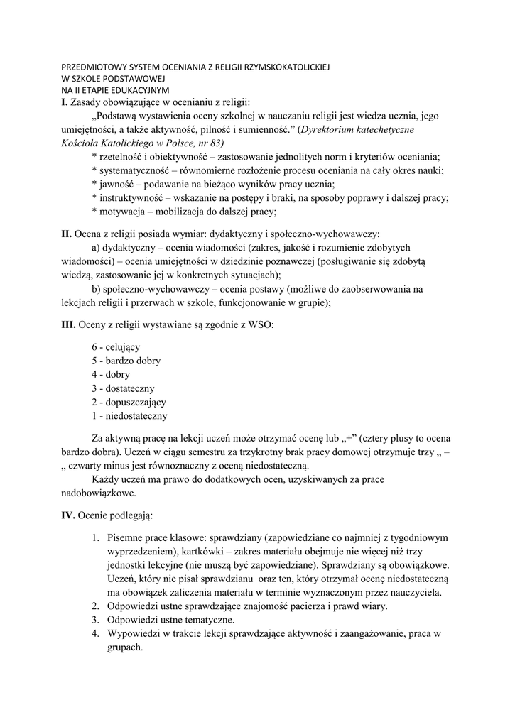 PRZEDMIOTOWY SYSTEM OCENIANIA Z RELIGII RZYMSKOKATOLICKIEJ W SZKOLE PODSTAWOWEJ NA II ETAPIE EDUKACYJNYM I. Zasady obowiązujące w ocenianiu z religii: „Podstawą wystawienia oceny szkolnej w nauczaniu religii jest wiedza ucznia, jego umiejętności, a także aktywność, pilność i sumienność.” (Dyrektorium katechetyczne Kościoła Katolickiego w Polsce, nr 83) * rzetelność i obiektywność – zastosowanie jednolitych norm i kryteriów oceniania; * systematyczność – równomierne rozłożenie procesu oceniania na cały okres nauki; * jawność – podawanie na bieżąco wyników pracy ucznia; * instruktywność – wskazanie na postępy i braki, na sposoby poprawy i dalszej pracy; * motywacja – mobilizacja do dalszej pracy; II. Ocena z religii posiada wymiar: dydaktyczny i społeczno-wychowawczy: a) dydaktyczny – ocenia wiadomości (zakres, jakość i rozumienie zdobytych wiadomości) – ocenia umiejętności w dziedzinie poznawczej (posługiwanie się zdobytą wiedzą, zastosowanie jej w konkretnych sytuacjach); b) społeczno-wychowawczy – ocenia postawy (możliwe do zaobserwowania na lekcjach religii i przerwach w szkole, funkcjonowanie w grupie); III. Oceny z religii wystawiane są zgodnie z WSO: 6 - celujący 5 - bardzo dobry 4 - dobry 3 - dostateczny 2 - dopuszczający 1 - niedostateczny Za aktywną pracę na lekcji uczeń może otrzymać ocenę lub „+” (cztery plusy to ocena bardzo dobra). Uczeń w ciągu semestru za trzykrotny brak pracy domowej otrzymuje trzy „ – „ czwarty minus jest równoznaczny z oceną niedostateczną. Każdy uczeń ma prawo do dodatkowych ocen, uzyskiwanych za prace nadobowiązkowe. IV. Ocenie podlegają: 1. Pisemne prace klasowe: sprawdziany (zapowiedziane co najmniej z tygodniowym wyprzedzeniem), kartkówki – zakres materiału obejmuje nie więcej niż trzy jednostki lekcyjne (nie muszą być zapowiedziane). Sprawdziany są obowiązkowe. Uczeń, który nie pisał sprawdzianu oraz ten, który otrzymał ocenę niedostateczną ma obowiązek zaliczenia materiału w terminie wyznaczonym przez nauczyciela. 2. Odpowiedzi ustne sprawdzające znajomość pacierza i prawd wiary. 3. Odpowiedzi ustne tematyczne. 4. Wypowiedzi w trakcie lekcji sprawdzające aktywność i zaangażowanie, praca w grupach. 5. 6. 7. 8. 9. Zeszyt ucznia sprawdzany w toku nauczania przez nauczyciela. Prace domowe. Zaangażowanie w życie parafii. Udział w konkursach szkolnych i międzyszkolnych. Zaangażowanie w przygotowanie różnych form scenicznych, okolicznościowych akcji itp.
