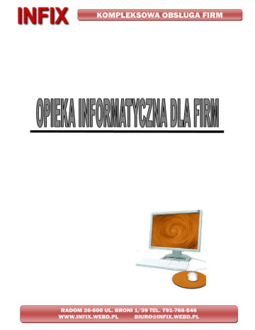 KOMPLEKSOWA OBSŁUGA FIRM RADOM 26-600 UL. BRONI 1/39 TEL. 791-766-546 WWW.INFIX.WEBD.PL [email protected] KOMPLEKSOWA OBSŁUGA FIRM Czym jest outsourcing? Jest to metoda polegająca na zlecaniu przez firmę podmiotom zewnętrznym określonych procesów niezbędnych dla poprawnego funkcjonowania firmy. Podstawowe zalety outsourcingu? sposób na redukcje kosztów pozyskiwanie specjalistów niŜszym kosztem skupienie się na podstawowej działalności firmy korzystanie z bazy doświadczeń stała pomoc gwarancja ciągłości pracy podniesienie poziomu bezpieczeństwa RADOM 26-600 UL. BRONI 1/39 TEL. 791-766-546 WWW.INFIX.WEBD.PL [email protected] KOMPLEKSOWA OBSŁUGA FIRM Zapewniamy Państwu: audyt sprzętu i oprogramowania naprawa i modernizacja sprzętu komputerowego konserwacja sprzętu i infrastruktury informatycznej instalacja oprogramowania i jego konfiguracja usuwanie wirusów archiwizacja danych planowanie i realizacja zakupów sprzętu i oprogramowania informatycznego zakup i dostawa materiałów eksploatacyjnych (tusze, tonery, papier) Rodzaje współpracy: pomoc doraźna ( płatna jednorazowo za wykonaną usługę) umowa serwisowa ( rozliczana w systemie miesięcznym) RADOM 26-600 UL. BRONI 1/39 TEL. 791-766-546 WWW.INFIX.WEBD.PL [email protected] KOMPLEKSOWA OBSŁUGA FIRM Cennik Serwisowy Nazwa usług Konfiguracja dysku twardego – partycjonowanie, formatowanie, zmiana systemu plików Instalacja systemu operacyjnego – Windows 98/ME/200/XP/Vista* Instalowanie sterowników i konfiguracja sprzętu komputerowego Konfiguracja systemu operacyjnego – optymalne ustawienia Twojego komputera Instalacja oraz konfiguracja oprogramowania komputerowego** Instalacja programów antywirusowych wraz firewallem* Usuwanie wirusów** Konserwacja sprzętu komputerowego Aktualizacja oprogramowania, sterowników itp. Doradztwo przy zakupie Modernizacja sprzętu komputerowego z wymiana podzespołów Nauka podstaw obsługi komputera ** Archiwizacja danych ( pendrive, płyty cd/dvd) Tworzenie stron internetowych Tworzenie prezentacji multimedialnych i materiałów reklamowych Inne usługi niewymienione powyŜej Dojazd technika ( na terenie Radomia = 0 zł)*** Cena 20 50 10 - 50 Legenda * - klient powinien posiadać własny nośnik z oprogramowaniem ** - stawka za godzinę pracy technika naliczana za kaŜdą rozpoczętą godzinę *** - stawka za przejechany km wg wskazania nawigacji gps RADOM 26-600 UL. BRONI 1/39 TEL. 791-766-546 WWW.INFIX.WEBD.PL [email protected] 30 50 30 50 30 30 30 30 30 25 tel. tel. tel. 1 KOMPLEKSOWA OBSŁUGA FIRM Pakiety Opieki Informatycznej OPIEKA INFORMATYCZNA MAX. ILOŚĆ KOMPUTERÓW LICZBA WIZYT U KLIENTA W SKALI MIESIACA CZESTOTLIWOSC PRZEGLĄDÓW SERWISOWYCH MAX. TELEFONICZNY CZAS REAKCJI NA ZGŁOSZENIE MAX. CZAS REAKCJI NA ZGŁOSZENIE -DOJAZD TEL. HELPDESK 8.00 - 18.00 MIESIĘCZNY KOSZT OBSŁUGI DOPŁATA ZA KAśDY KOLEJNY KOMPUTER DODTAKOWA GODZINA PRACY SPECJALISTY PAKIET I 5 PAKIET II 10 PAKIET III 20 PAKIET IV 40 4 8 12 24 1/KWARTAŁ 1/KWARTAŁ 2/KWARTAŁ 3/KWARTAŁ 10 MIN 10 MIN 10 MIN 10 MIN 1-6 H TAK 400,00 zł 1-4 H TAK 900,00 zł 1-2H TAK 1 500,00 zł 1H TAK 2 500,00 zł 50,00 zł 50,00 zł 50,00 zł 50,00 zł 70,00 zł 60,00 zł 50,00 zł 40,00 zł *Podane ceny są cenami netto i naleŜy do nich doliczyć podatek 22 % VAT RADOM 26-600 UL. BRONI 1/39 TEL. 791-766-546 WWW.INFIX.WEBD.PL [email protected]