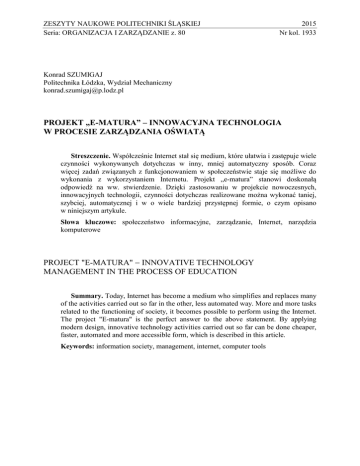 ZESZYTY NAUKOWE POLITECHNIKI ŚLĄSKIEJ Seria: ORGANIZACJA I ZARZĄDZANIE z. 80 2015 Nr kol. 1933 Konrad SZUMIGAJ Politechnika Łódzka, Wydział Mechaniczny [email protected] PROJEKT „E-MATURA” – INNOWACYJNA TECHNOLOGIA W PROCESIE ZARZĄDZANIA OŚWIATĄ Streszczenie. Współcześnie Internet stał się medium, które ułatwia i zastępuje wiele czynności wykonywanych dotychczas w inny, mniej automatyczny sposób. Coraz więcej zadań związanych z funkcjonowaniem w społeczeństwie staje się możliwe do wykonania z wykorzystaniem Internetu. Projekt „e-matura” stanowi doskonałą odpowiedź na ww. stwierdzenie. Dzięki zastosowaniu w projekcie nowoczesnych, innowacyjnych technologii, czynności dotychczas realizowane można wykonać taniej, szybciej, automatycznej i w o wiele bardziej przystępnej formie, o czym opisano w niniejszym artykule. Słowa kluczowe: społeczeństwo informacyjne, zarządzanie, Internet, narzędzia komputerowe PROJECT "E-MATURA" INNOVATIVE TECHNOLOGY MANAGEMENT IN THE PROCESS OF EDUCATION Summary. Today, Internet has become a medium who simplifies and replaces many of the activities carried out so far in the other, less automated way. More and more tasks related to the functioning of society, it becomes possible to perform using the Internet. The project "E-matura" is the perfect answer to the above statement. By applying modern design, innovative technology activities carried out so far can be done cheaper, faster, automated and more accessible form, which is described in this article. Keywords: information society, management, internet, computer tools 282 K. Szumigaj 1. Zarys problematyki Obecnie Polska staje przed ogromem wyzwań natury społecznej, edukacyjnej i technologicznej nowoczesnego zarządzania. Od sprostania im zależy pozycja konkurencyjna kraju na arenie międzynarodowej, zapewnienie materialnego dobrobytu polskich rodzin, umocnienie ich samodzielności ekonomicznej oraz wzrost poczucia bezpieczeństwa. Kluczowym zadaniem dla Polski jest włączenie się w proces budowy ery informacyjnej przez wykorzystanie nowoczesnych technologii społeczeństwa informacyjnego, stwarzanie warunków dla zapewnienia bezpośredniego dostępu do zarządzania informacją, kształtowanie świadomości społeczeństwa oraz rozwijanie jego potencjału intelektualnego i gospodarczego. Ze względu na proces integracji ze strukturami Unii Europejskiej pojawia się potrzeba dostosowania polskich rozwiązań i standardów do kształtującego się, nowoczesnego społeczeństwa, opartego na technikach informacyjnych1. Techniki informacyjne stanowią doskonałe źródło wspomagania procesu zarządzania edukacją. Idea społeczeństwa informacyjnego jest nieodłącznie związana z Internetem (Nowa Strategia Lizbońska). Olbrzymie możliwości, jakie daje ten środek komunikacji w działaniach zarządczych, a następnie – wraz z upowszechnieniem taniego sprzętu komputerowego o dużej szybkości przetwarzania danych – jako szybki środek komunikacji społecznej oraz źródło łatwo dostępnej informacji edukacyjnej, politycznej i praktycznej, spowodowały jednak szybki wzrost publicznego zainteresowania Internetem jako narzędziem ułatwiającym codzienne życie oraz kierowanie państwem (korzystanie z nowych usług administracyjnych). Jednak stawał się on istotnym elementem działalności biznesowej: dla dostawców portali informacyjnych, przedsiębiorców, którzy tą drogą nawiązują kontakty biznesowe (platformy B2B Business-to-Business i B2C Business-to-Customer), uczestniczących i organizujących aukcje internetowe, świadczących usługi handlowe (eCommerce), turystyczne (eTourism)2. Współcześnie Internet stał się medium, które ułatwia i zastępuje wiele czynności dotychczas wykonywanych w inny, mniej automatyczny (najczęściej papierowy) sposób. Coraz więcej zadań związanych z funkcjonowaniem państwa w społeczeństwie staje się możliwe do wykonania z wykorzystaniem Internetu; łatwo przytoczyć tutaj składanie zeznań podatkowych czy wysyłanie dokumentów do Zakładu Ubezpieczeń Społecznych. Dzięki zastosowaniu nowoczesnych technologii czynności dotychczas wykonywane można zrobić taniej, szybciej i w o wiele bardziej przystępnej, automatycznej formie. 1 2 ePolska – Plan działań na rzecz rozwoju społeczeństwa informacyjnego w Polsce na lata 2001–2006, s. 5. Strategia rozwoju społeczeństwa informacyjnego w Polsce na lata 2007–2013, 2007, s. 5. Projekt „e-matura” – innowacyjna technologia… 283 2. Filozofia projektu Inicjatywy europejskie podejmujące problematykę konkurencyjności UE w skali globalnej w coraz większym stopniu wskazują na kluczową rolę technik informacyjnych i komunikacyjnych (ICT) w transformacji krajów Unii Europejskiej do fazy społeczeństwa opartego na wiedzy. W opinii Komisji Europejskiej poziom rozwoju technik informacyjnych i komunikacyjnych oraz powszechna dostępności globalnych zasobów informacji będą w coraz większym stopniu wyróżnikiem pozycji indywidualnej, grupowej, aż do miejsca kraju w układach międzynarodowych3. W ramach konkursu ogłoszonego przez Ministerstwo Edukacji Narodowej, na który złożony został wniosek o dofinansowanie projektu e-matura, głównym celem było zwiększenie zainteresowania uczniów m.in. szkół ponadgimnazjalnych kontynuacją kształcenia na kierunkach o kluczowym znaczeniu dla gospodarki opartej na wiedzy, przez stworzenie innowacyjnych programów nauczania i innych narzędzi przeznaczonych dla uczniów, ale również przygotowanie takiej platformy, która wspomoże proces zarządzania egzaminami maturalnymi i docelowo zastąpi je tylko w postaci elektronicznej. W tym przypadku mamy do czynienia z nowatorskimi rozwiązaniami, dlatego też projekt e-matura jest innowacyjny w skali światowej. Na każdym etapie realizacji projektu podejmowane były działania przestrzegające zasady empowerment, czyli udziału grup napotykającyc