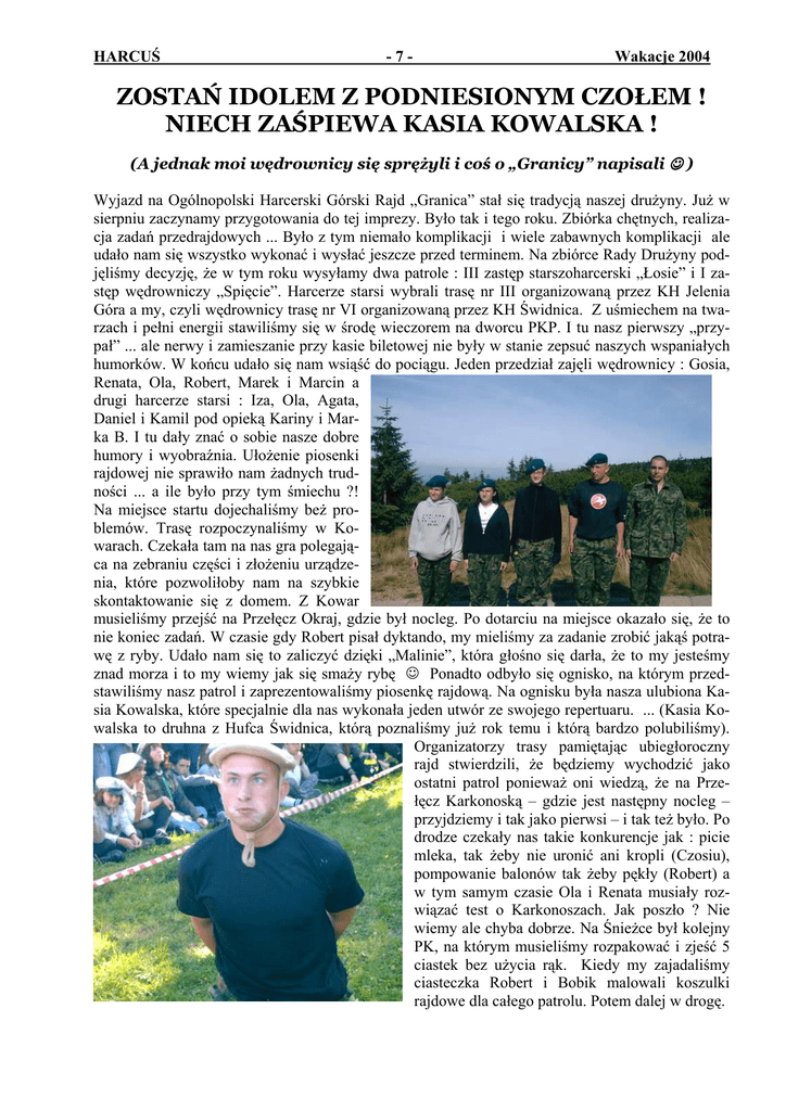 HARCUŚ -7- Wakacje 2004 ZOSTAŃ IDOLEM Z PODNIESIONYM CZOŁEM ! NIECH ZAŚPIEWA KASIA KOWALSKA ! (A jednak moi wędrownicy się sprężyli i coś o „Granicy” napisali ☺ ) Wyjazd na Ogólnopolski Harcerski Górski Rajd „Granica” stał się tradycją naszej drużyny. Już w sierpniu zaczynamy przygotowania do tej imprezy. Było tak i tego roku. Zbiórka chętnych, realizacja zadań przedrajdowych ... Było z tym niemało komplikacji i wiele zabawnych komplikacji ale udało nam się wszystko wykonać i wysłać jeszcze przed terminem. Na zbiórce Rady Drużyny podjęliśmy decyzję, że w tym roku wysyłamy dwa patrole : III zastęp starszoharcerski „Łosie” i I zastęp wędrowniczy „Spięcie”. Harcerze starsi wybrali trasę nr III organizowaną przez KH Jelenia Góra a my, czyli wędrownicy trasę nr VI organizowaną przez KH Świdnica. Z uśmiechem na twarzach i pełni energii stawiliśmy się w środę wieczorem na dworcu PKP. I tu nasz pierwszy „przypał” ... ale nerwy i zamieszanie przy kasie biletowej nie były w stanie zepsuć naszych wspaniałych humorków. W końcu udało się nam wsiąść do pociągu. Jeden przedział zajęli wędrownicy : Gosia, Renata, Ola, Robert, Marek i Marcin a drugi harcerze starsi : Iza, Ola, Agata, Daniel i Kamil pod opieką Kariny i Marka B. I tu dały znać o sobie nasze dobre humory i wyobraźnia. Ułożenie piosenki rajdowej nie sprawiło nam żadnych trudności ... a ile było przy tym śmiechu ?! Na miejsce startu dojechaliśmy beż problemów. Trasę rozpoczynaliśmy w Kowarach. Czekała tam na nas gra polegająca na zebraniu części i złożeniu urządzenia, które pozwoliłoby nam na szybkie skontaktowanie się z domem. Z Kowar musieliśmy przejść na Przełęcz Okraj, gdzie był nocleg. Po dotarciu na miejsce okazało się, że to nie koniec zadań. W czasie gdy Robert pisał dyktando, my mieliśmy za zadanie zrobić jakąś potrawę z ryby. Udało nam się to zaliczyć dzięki „Malinie”, która głośno się darła, że to my jesteśmy znad morza i to my wiemy jak się smaży rybę ☺ Ponadto odbyło się ognisko, na którym przedstawiliśmy nasz patrol i zaprezentowaliśmy piosenkę rajdową. Na ognisku była nasza ulubiona Kasia Kowalska, które specjalnie dla nas wykonała jeden utwór ze swojego repertuaru. ... (Kasia Kowalska to druhna z Hufca Świdnica, którą poznaliśmy już rok temu i którą bardzo polubiliśmy). Organizatorzy trasy pamiętając ubiegłoroczny rajd stwierdzili, że będziemy wychodzić jako ostatni patrol ponieważ oni wiedzą, że na Przełęcz Karkonoską – gdzie jest następny nocleg – przyjdziemy i tak jako pierwsi – i tak też było. Po drodze czekały nas takie konkurencje jak : picie mleka, tak żeby nie uronić ani kropli (Czosiu), pompowanie balonów tak żeby pękły (Robert) a w tym samym czasie Ola i Renata musiały rozwiązać test o Karkonoszach. Jak poszło ? Nie wiemy ale chyba dobrze. Na Śnieżce był kolejny PK, na którym musieliśmy rozpakować i zjeść 5 ciastek bez użycia rąk. Kiedy my zajadaliśmy ciasteczka Robert i Bobik malowali koszulki rajdowe dla całego patrolu. Potem dalej w drogę. HARCUŚ -7- Wakacje 2004 Kiedy tak sobie wędrowaliśmy, to przydarzyło nam się wiele zabawnych sytuacji. Okazało się, że „Malina” ma niezwykły talent do gubienia różnych rzeczy ... ważnych rzeczy ☺ Kolejny nocleg mieliśmy w Strażnicy SG Przesieka. Na miejscu czekały nas testy ... test o Straży Granicznej załatwili Robert z Bobkiem a w harcerskim domino walczyła Ola z Czosiem. Testy nie należały do najłatwiejszych ale nie chwaląc się, poszło nam świetnie. Renata z Cinkiem mieli za zadanie ubić na sztywno pianę z jajka ale nie wyszło im to zbyt dobrze i cała zawartość talerza wylądowała na głowie Czosia. Już ułożyliśmy się do błogiego snu a tu naraz, w środku nocy ... AAALAAAARM !!! Czekała nas akcja ratunkowa w przygotowanej przez organizatorów symulacji. Nasz patrol prowadzony przez Roberta i Czosia jako pierwszy dotarł do poszkodowanych i udzielił im fachowej pomocy. Tempo gry a zwłaszcza powrót strasznie stromą drogą zupełnie nas wykończyły ( dzięki chłopaki za pomoc ☺ ). Ostatni dzień wędrówki to dość długie przejście szczytami Karkonoszów, aż do Strażnicy SG w Szklarskiej Porębie. Po drodze, na PK musieliśmy wykazać się znajomością technik harcerskich, nadawaliśmy alfabetem Morse’a, ćwiczyliśmy musztrę zespołową i wiązaliśmy węzły – tu nie było mocnych na Renatkę. Idąc przez Szrenicę dotarliśmy do wodospadu Kamieńczyk, skąd po krótkim odpoczynku udaliśmy się w stronę Szklarskiej. W Strażnicy SG czekała nas gorąca zupa grochowa z wkładką kiełbasianą i bułeczką. Ale to nie koniec atrakcji. Po odpoczynku całą trasą poszliśmy na „gwóźdź programu” czyli koncert SDM’u. Było naprawdę fajnie choć temperatura na sali i zmęczenie robiły swoje. Na małej Sali MDK zebrało się blisko 1000 harcerzy i zaproszonych gości – więc rozumiecie co tam się działo. Po koncercie w bazie czekały nas konkurencje sportowe. Nasz patrol wybrał sporty siłowe. Ku naszej radości, w ścisłej czołówce - wszystkie miejsca na pudle zajęli kolejno : Robert, Czosiu i Bobek. Nasi strongmani jako nagrodę otrzymali koszulki i autograf Kurasia. Ostatniego dnia rajdu odbył się apel końcowy naszej trasy. Z wielkim zaskoczeniem dowiedzieliśmy się, że zajęliśmy pierwsze miejsce ( byliśmy VERY HAPPY ☺ ). W nagrodę otrzymaliśmy 7 metalowych termosów i dyplom – jak zwykle z błędem w nazwie drużyny. Tym samym dostaliśmy się do rozgrywek ścisłego finału. Po zmaganiach na wesoło, ku naszej radości, zajęliśmy wspaniałe drugie miejsce. Do naszych rączek powędrował puchar Komendantki Chorągwi Dolnośląskiej, przepiękny herb Kowar (od Burmistrza), namiot i wiele innych nagród. No cóż, i na tym koniec rajdu ale nie koniec przygód. Zmęczeni